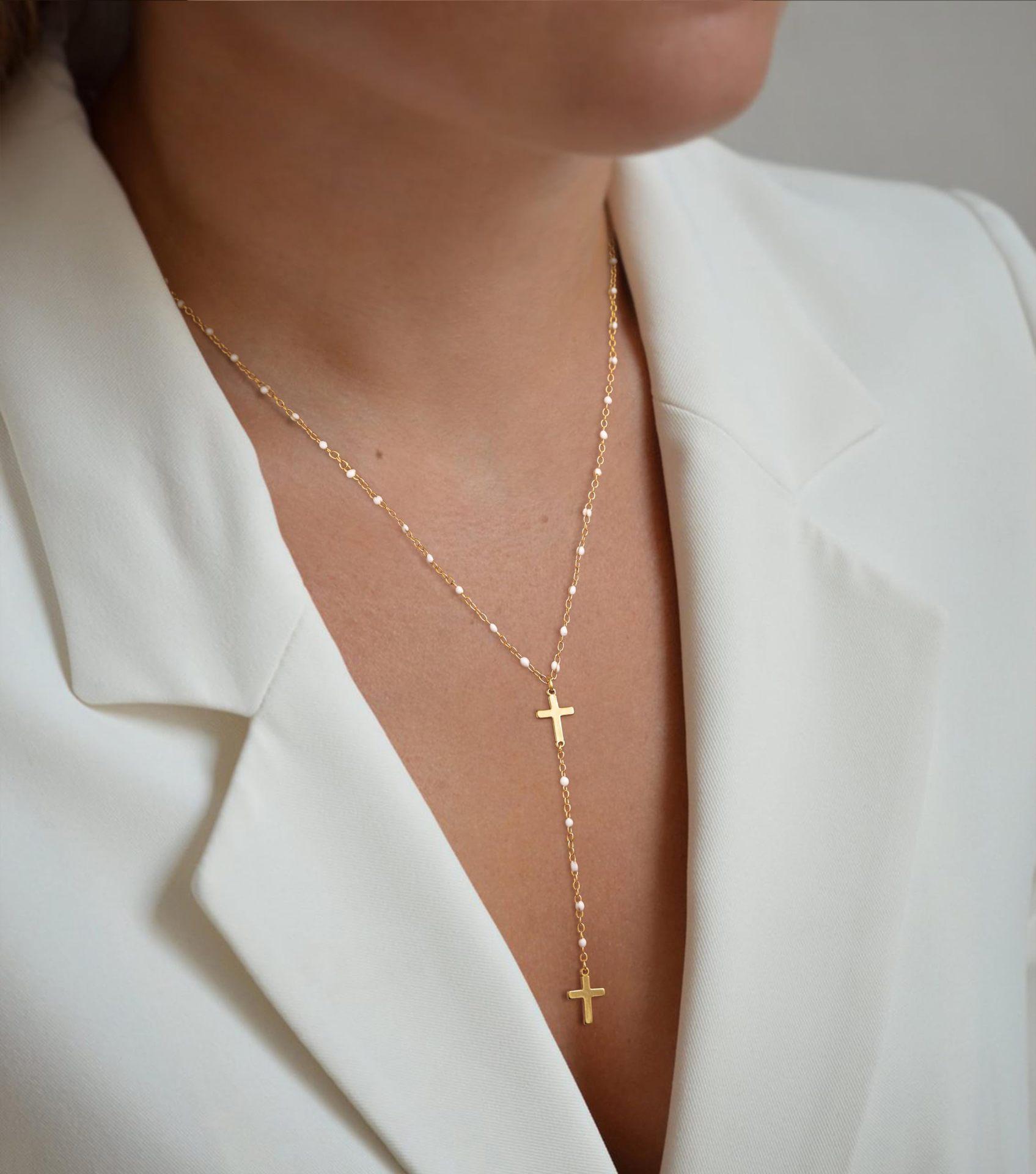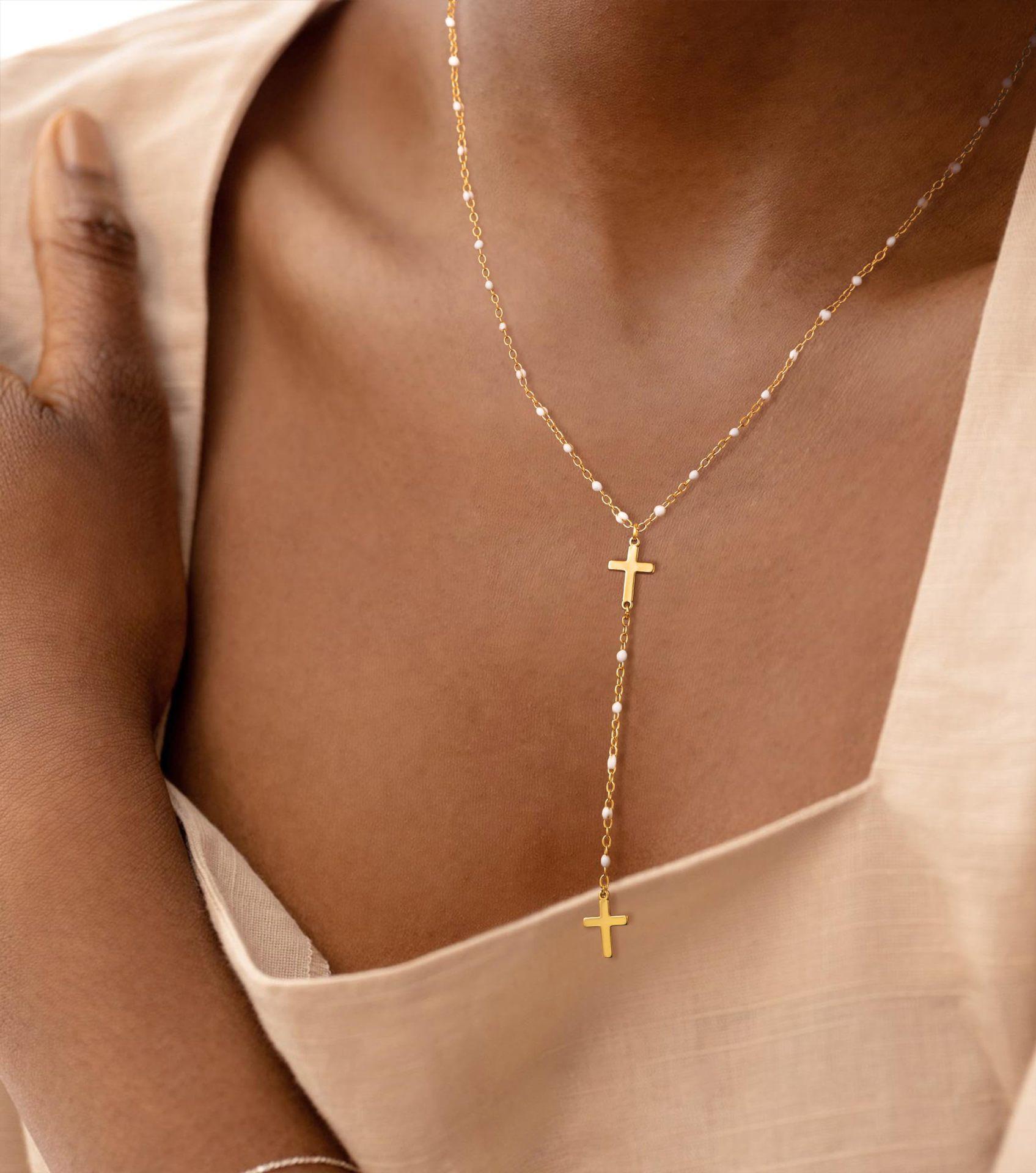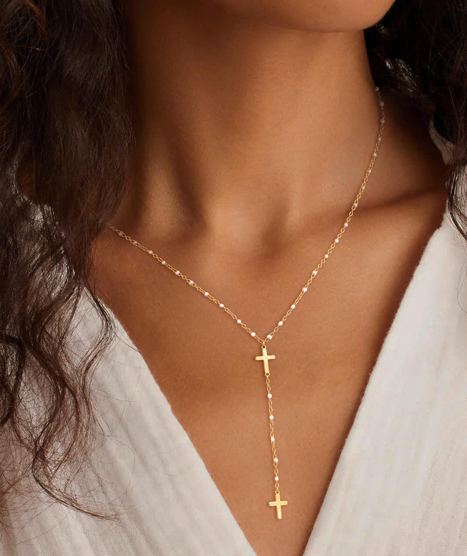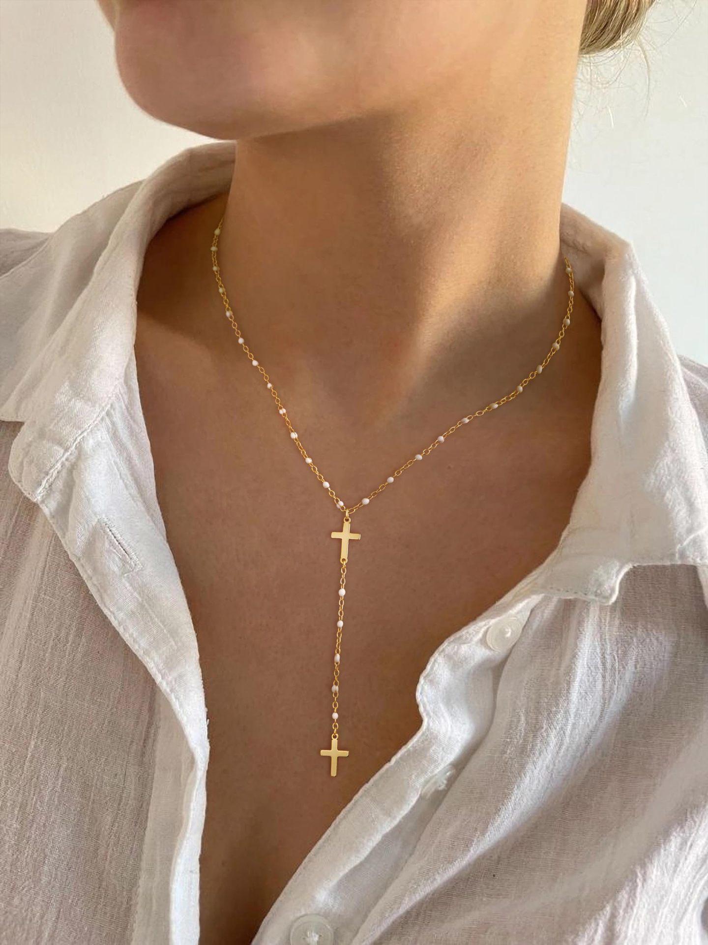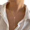 Collar elegante con colgante de acero inoxidable dorado y cadena en Y con perla cruzada de Amazon.