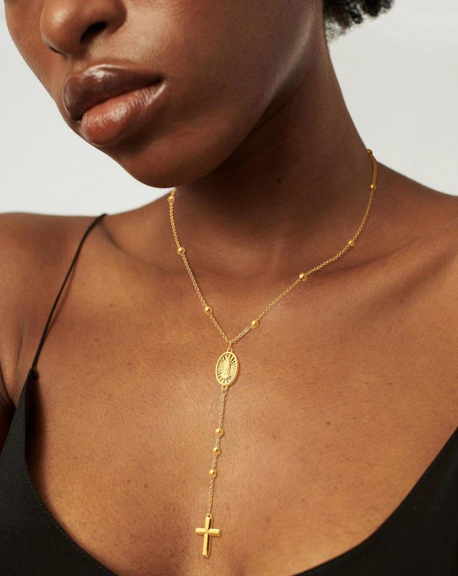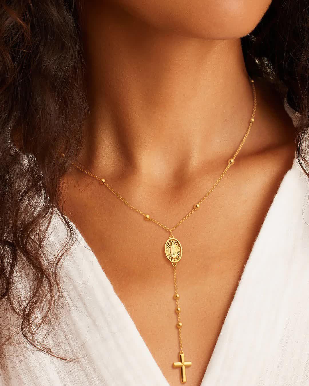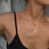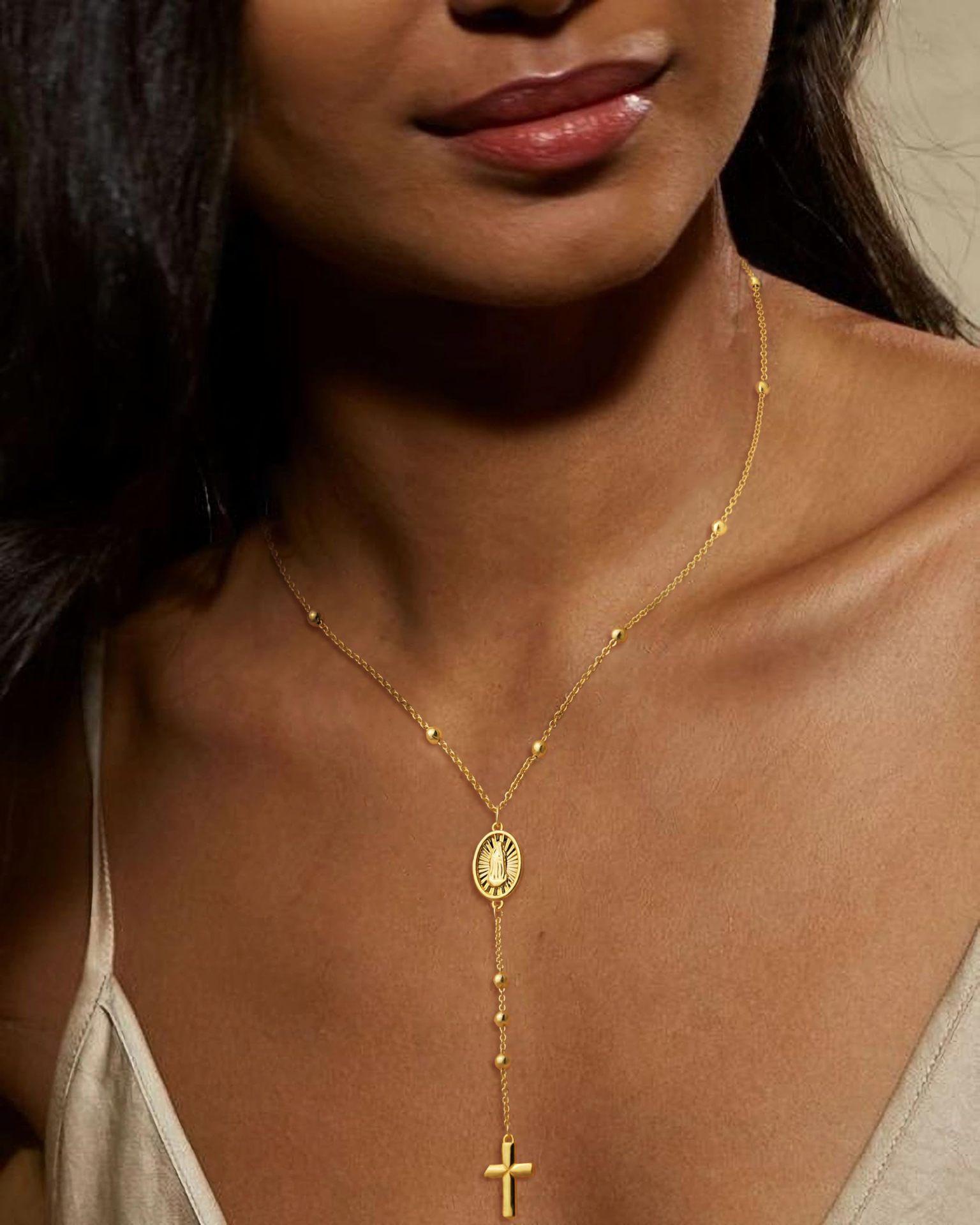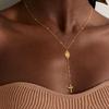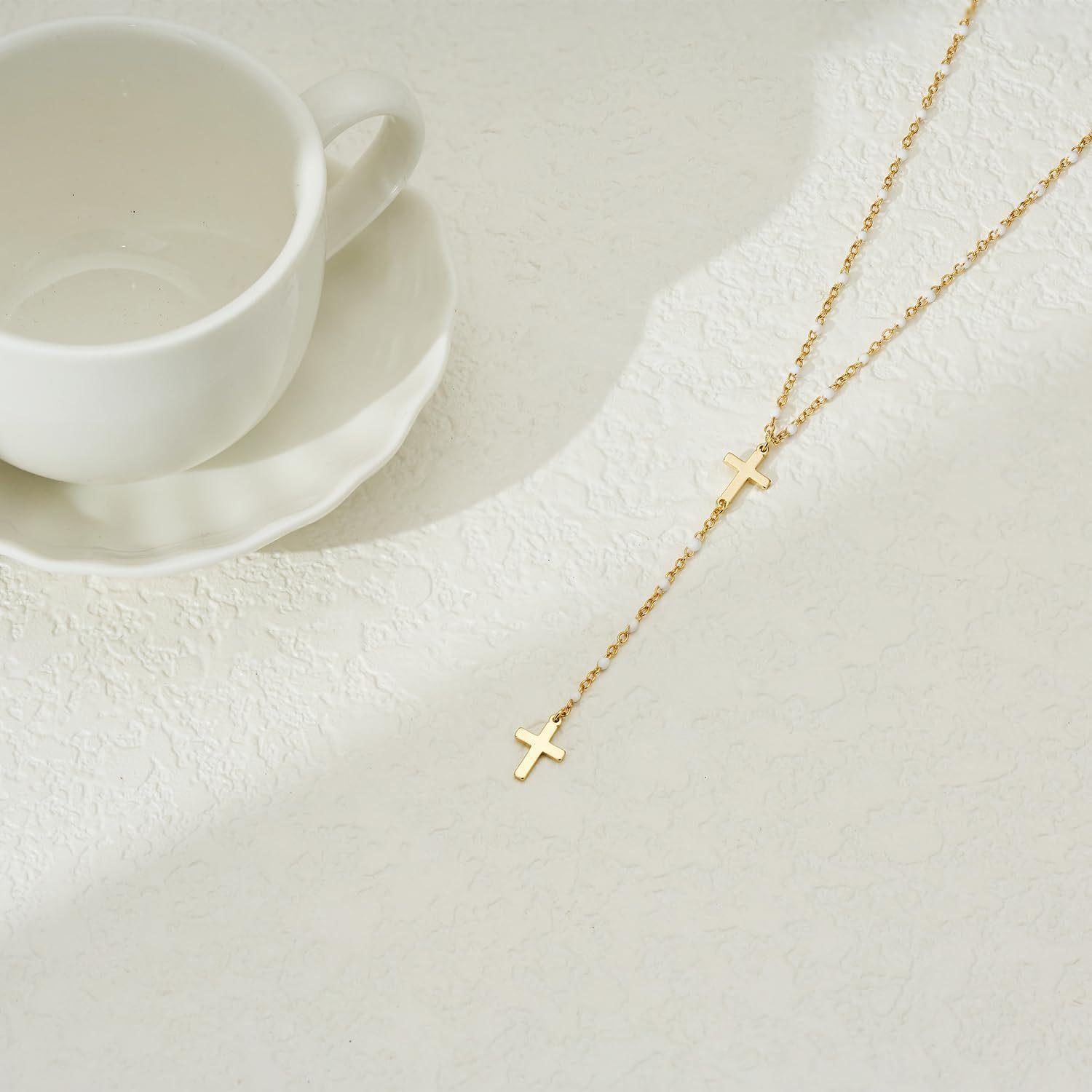 Collar elegante con colgante de acero inoxidable dorado y cadena en Y con perla cruzada de Amazon.