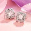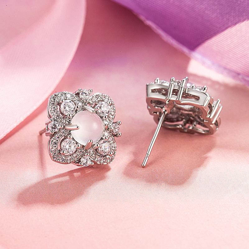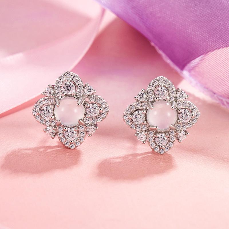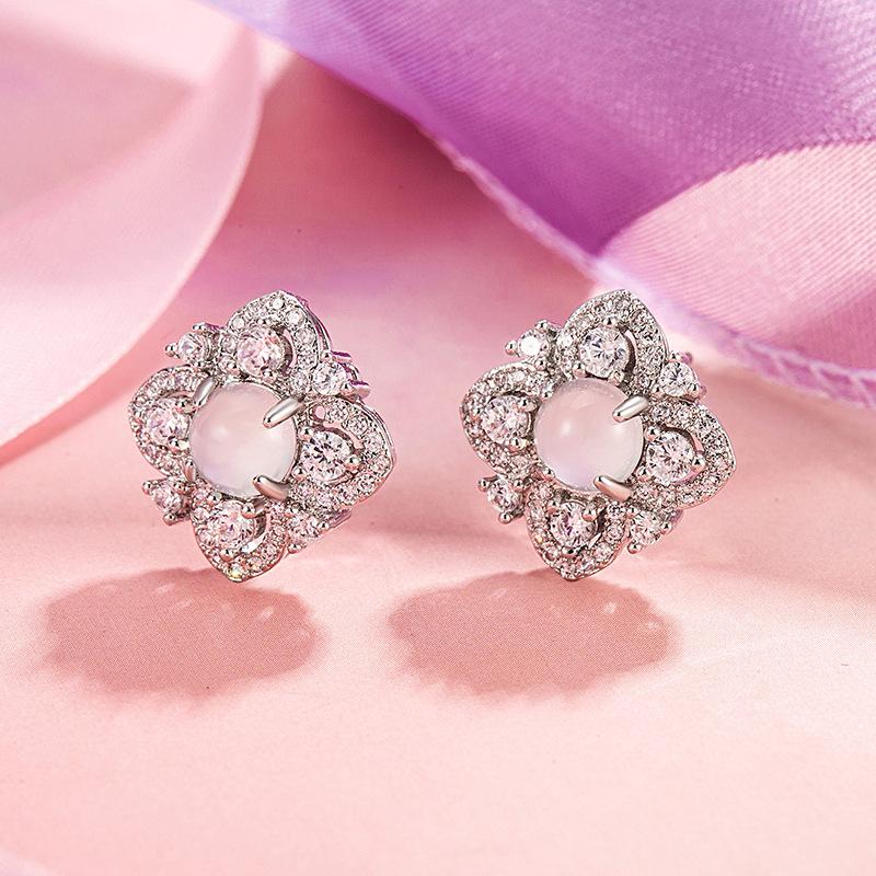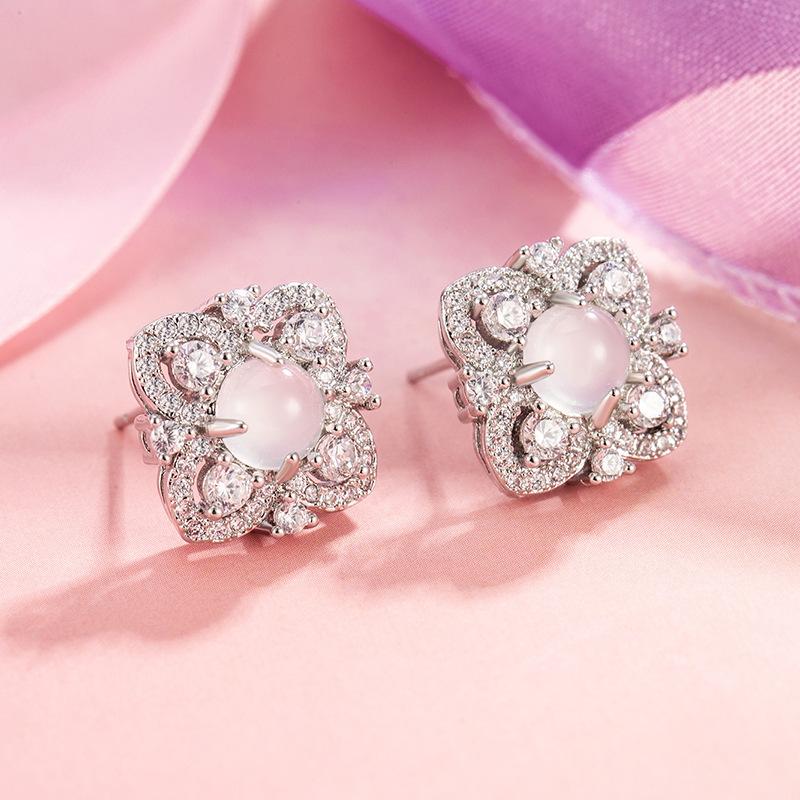 2024 nuevos aretes súper brillantes de imitación calcedonia blanca, trébol de cuatro hojas, aretes de temperamento fresco de lujo ligero, aretes artísticos pequeños y frescos