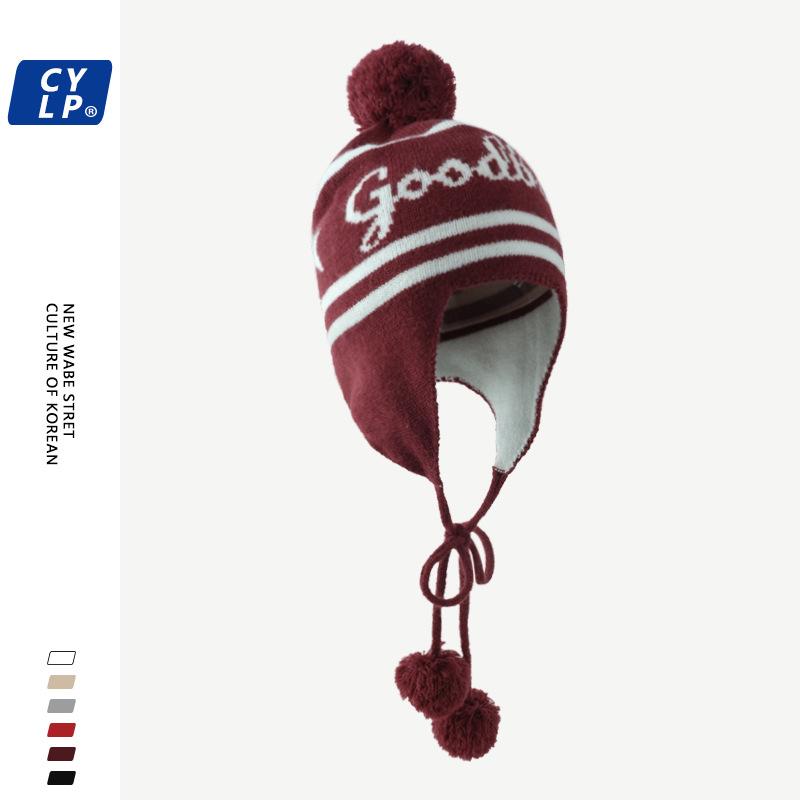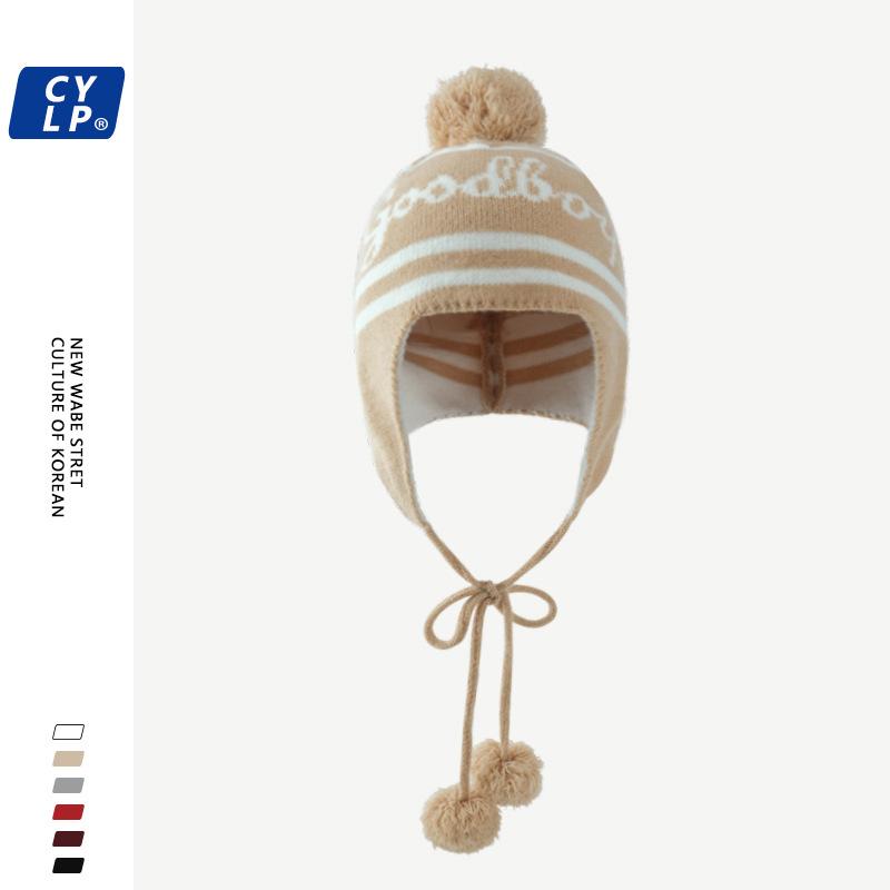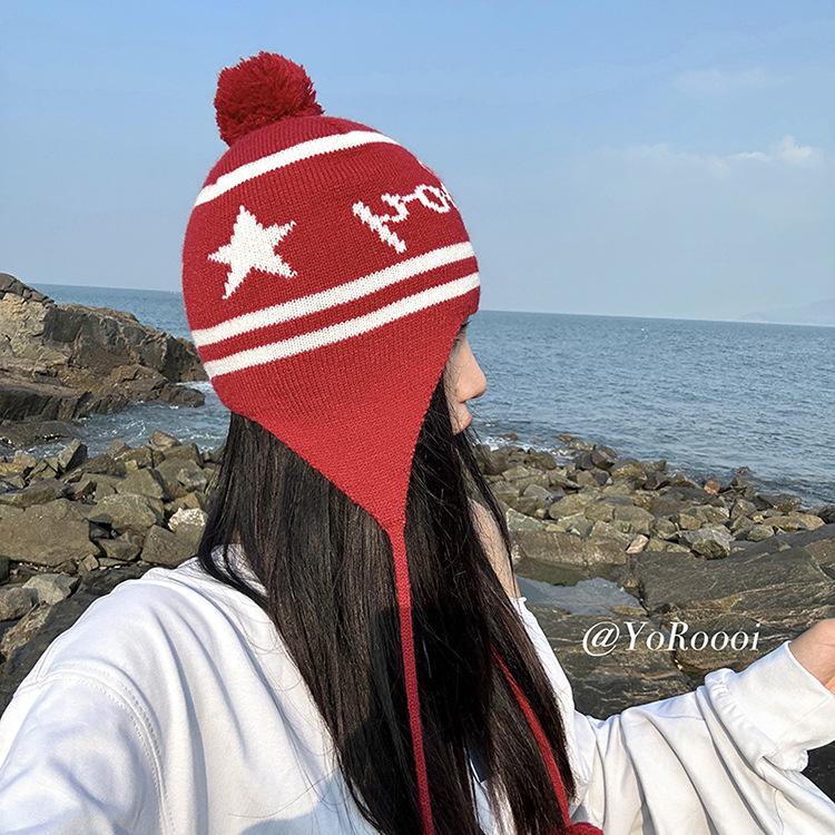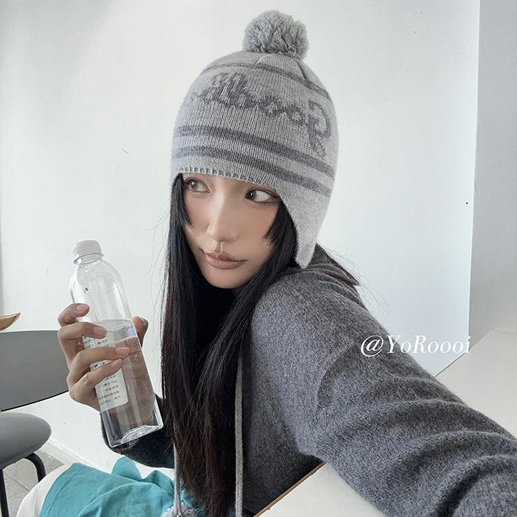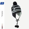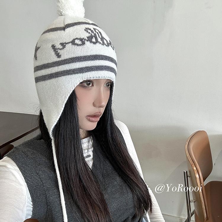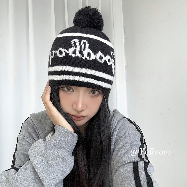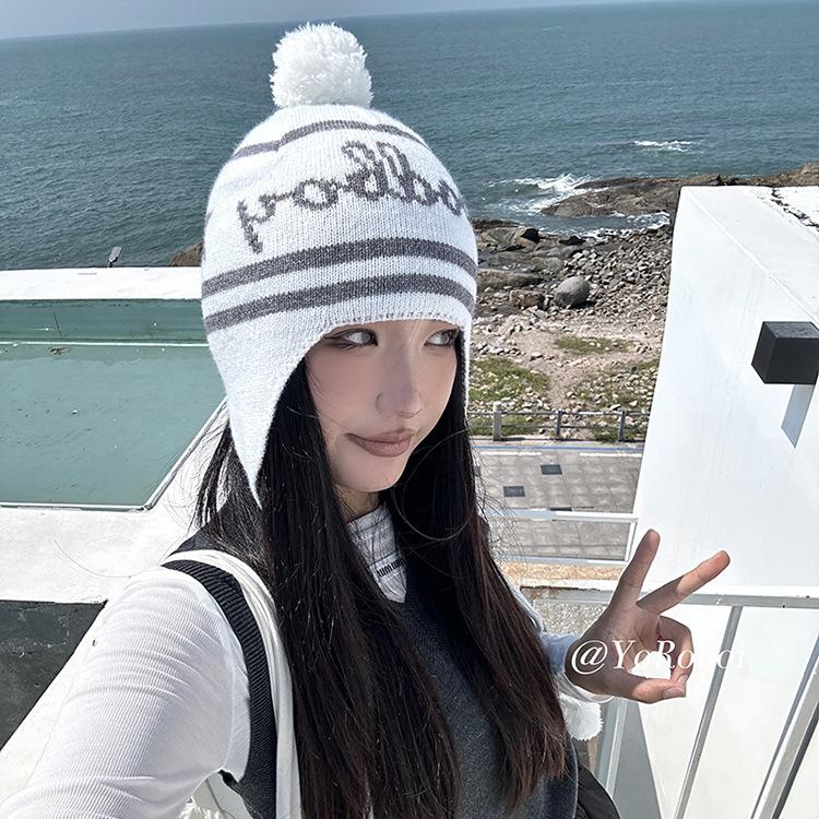 Lindo gorro de punto con pompón de piel para mujer, invierno, forrado de vellón, a prueba de frío, cálido, moda coreana, marca de moda, gorro con orejeras con letras, gorro de lana