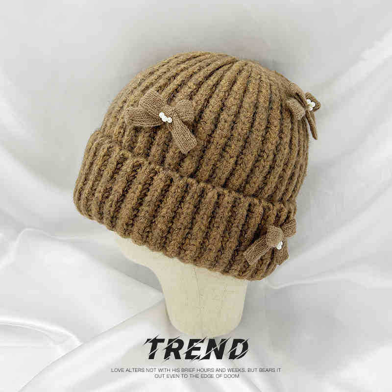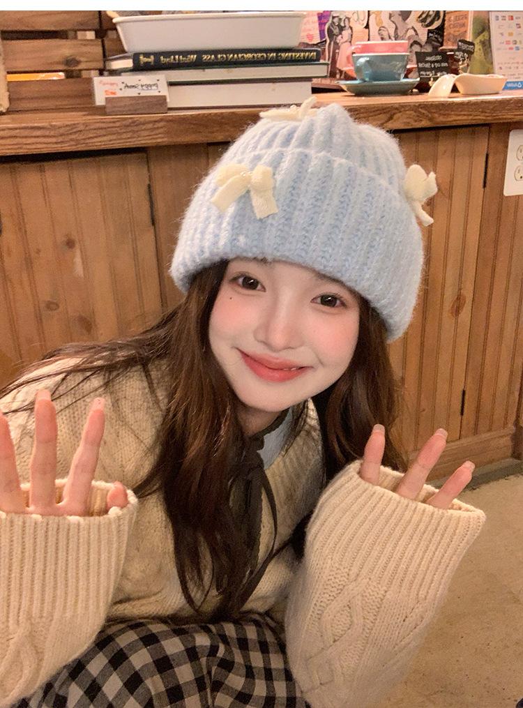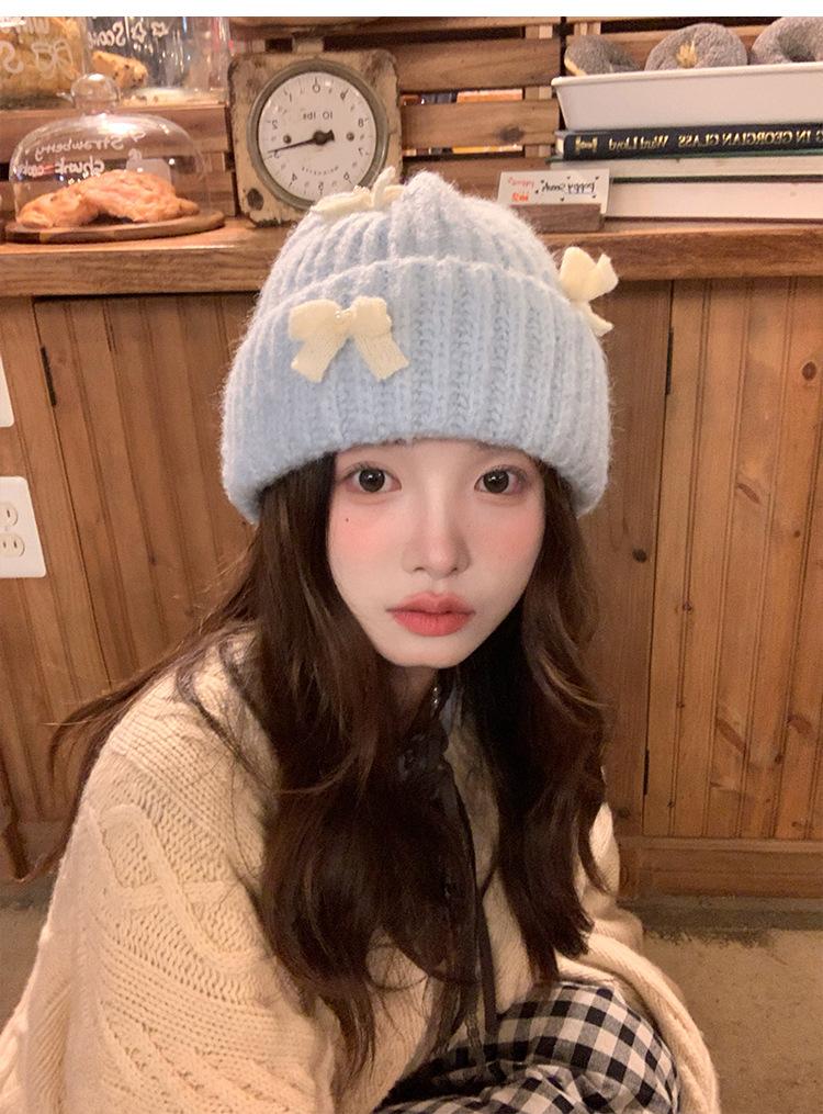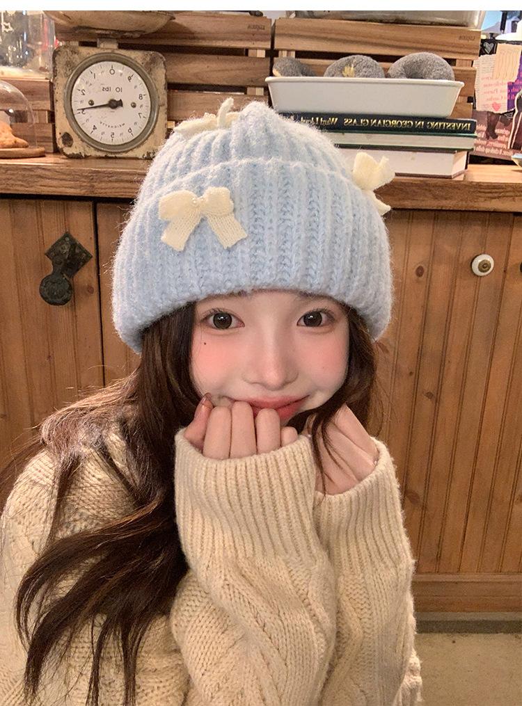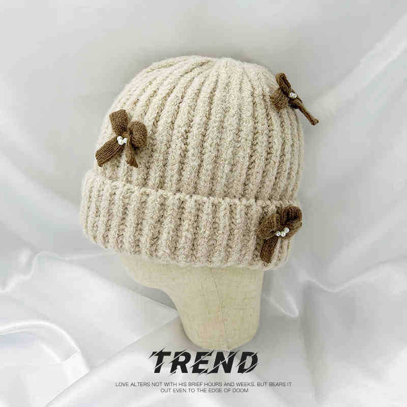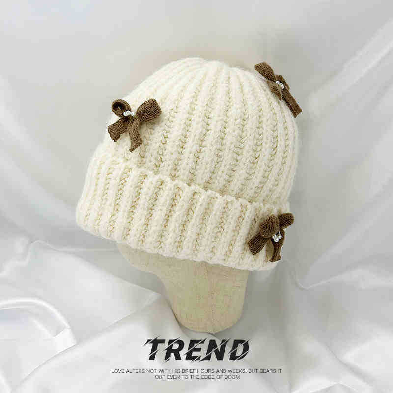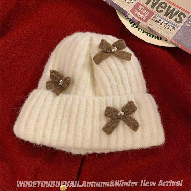 Corea del Sur Lazo de Perla Dulce Gorro de Punto para Mujer Otoño e Invierno Nuevo Cálido Protección para los Oídos Gorro de Lana Combinable Gorro para la Cabeza Moda