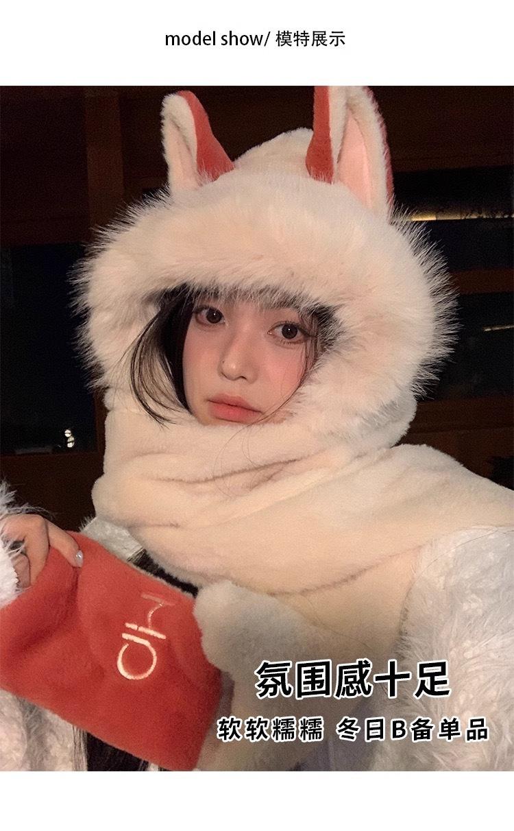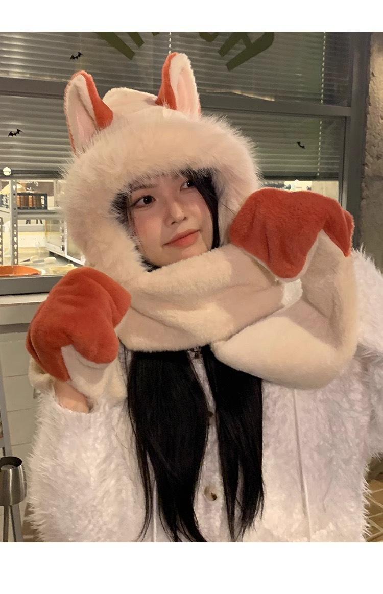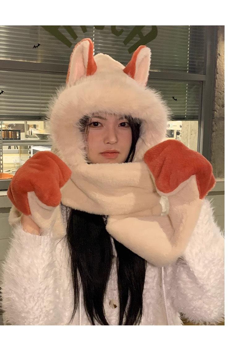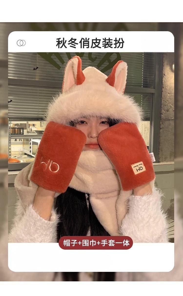 Conjunto de tres piezas de gorro y bufanda de zorro para mujer, moda de invierno, bonitos guantes de felpa cálidos para el cuello, gorro de una pieza
