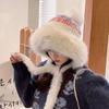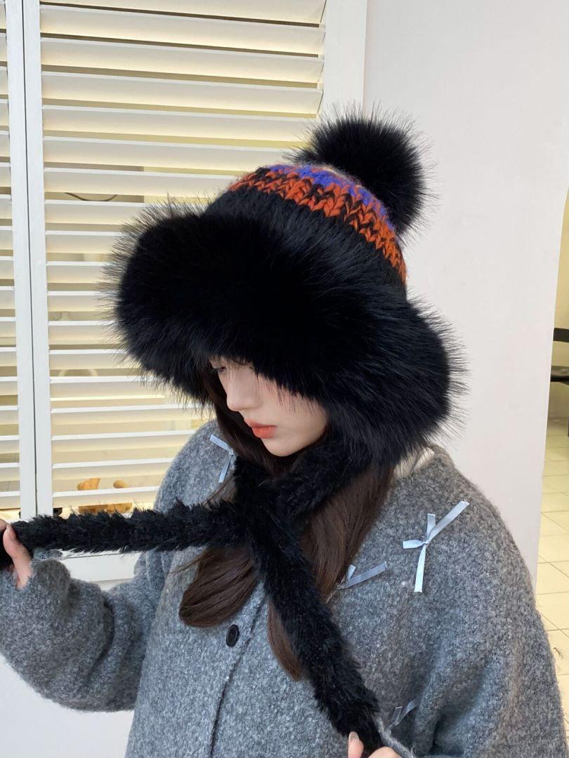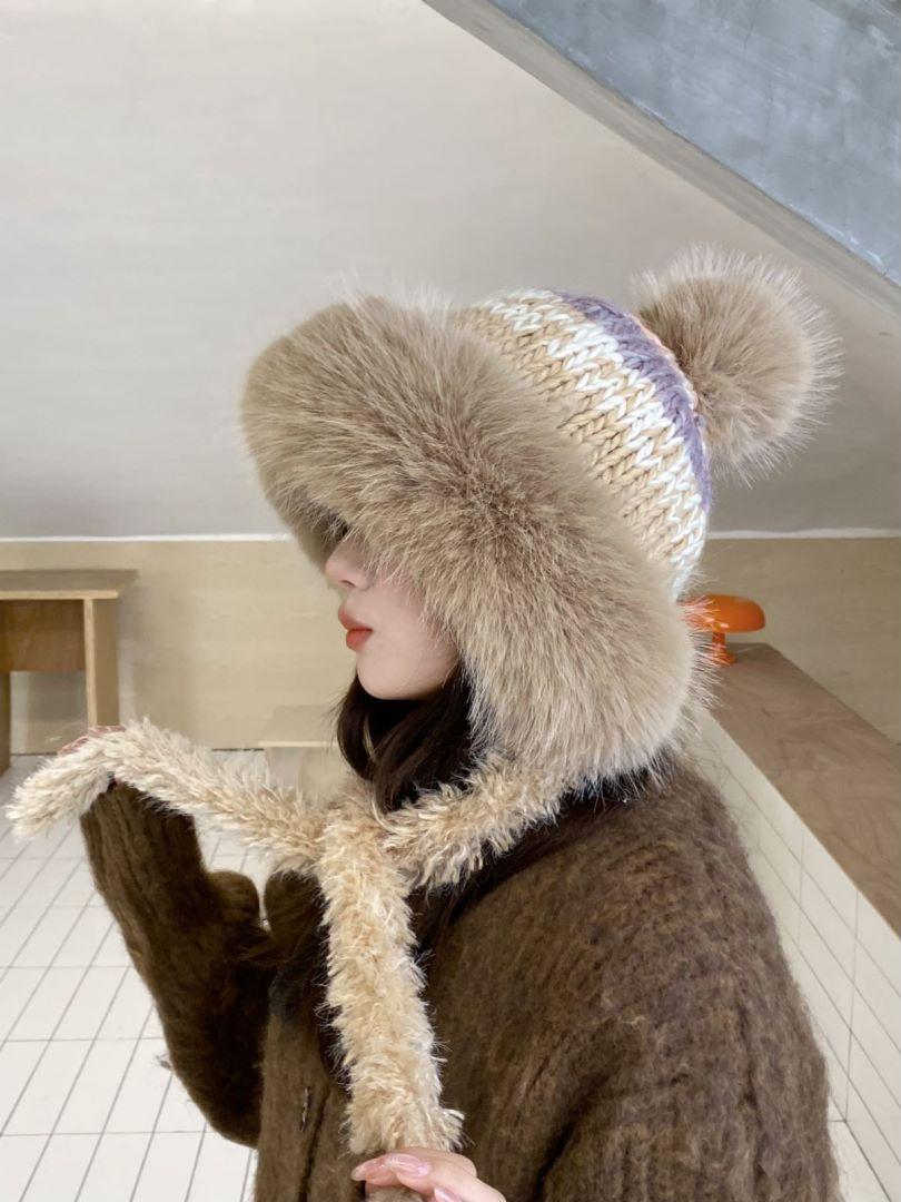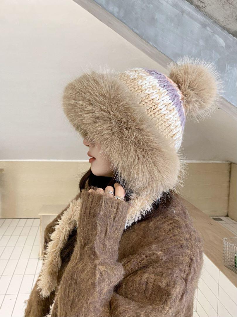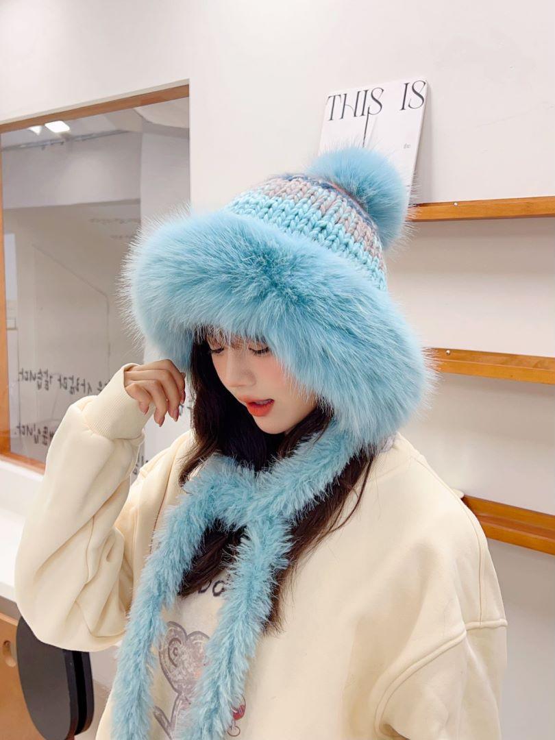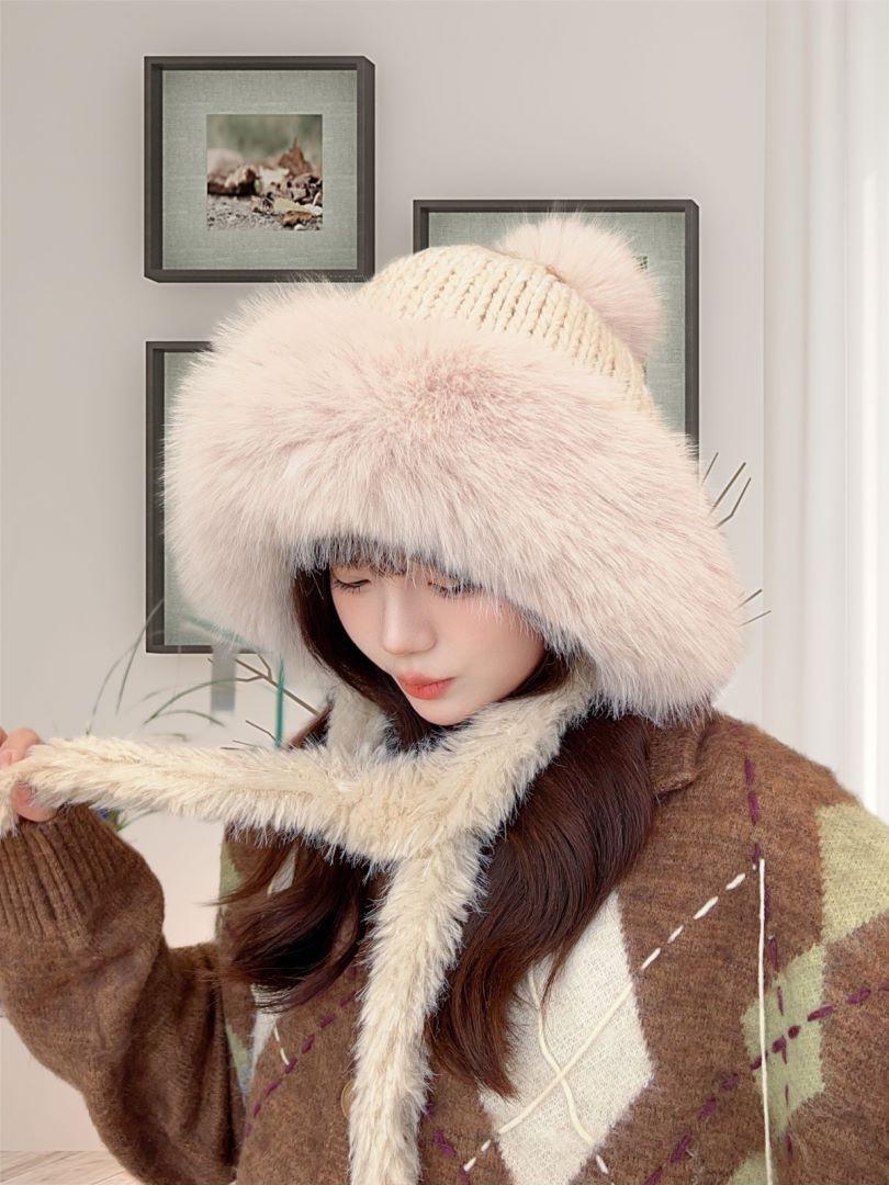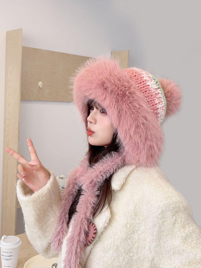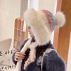 Noreste Espesado Cálido Protección para las Orejas Sombrero Lei Feng de Piel de Conejo Nuevo Color Trenzado de Hilo Tejido Moda Aprendizaje Sombrero con Cuello de Piel Tejida para Mujer