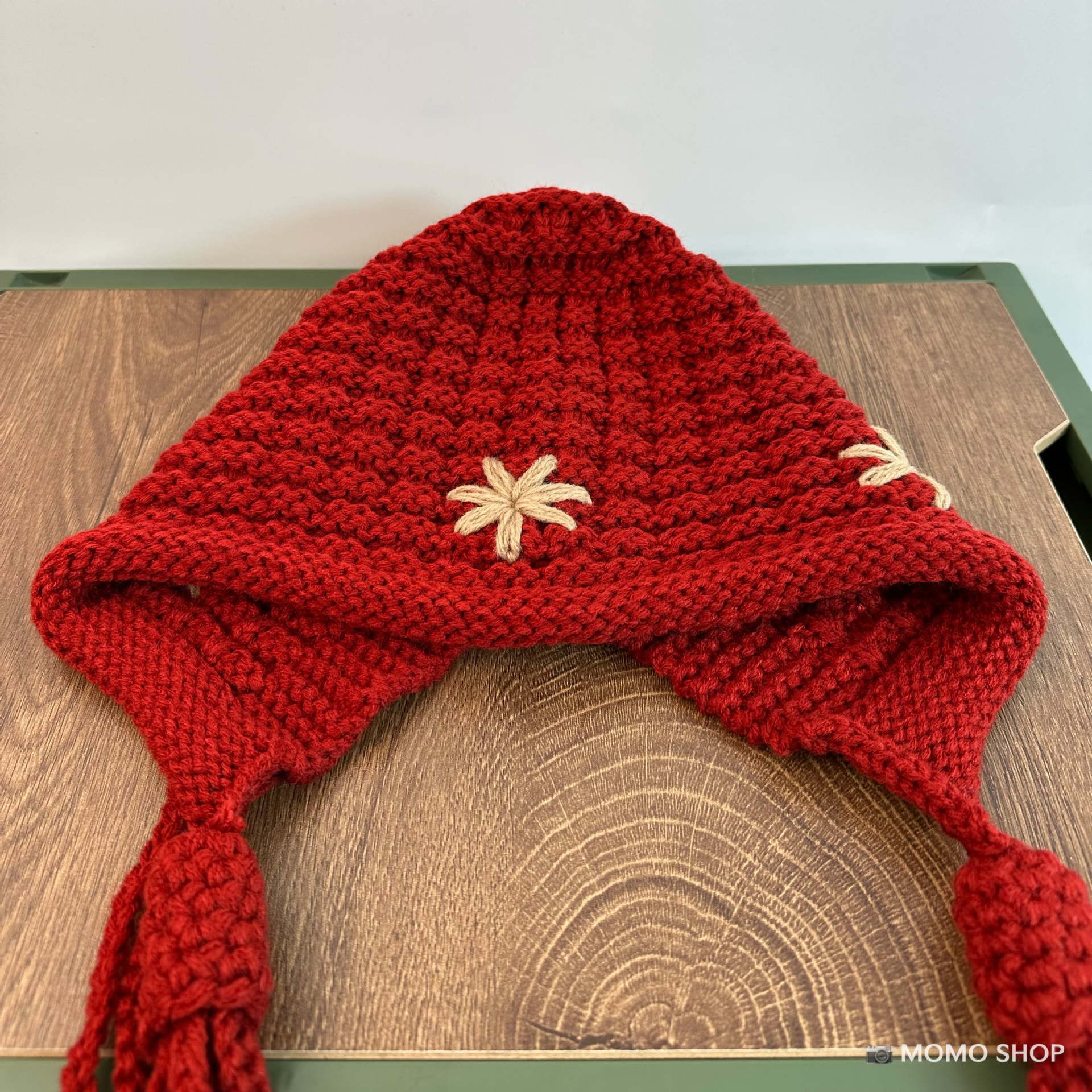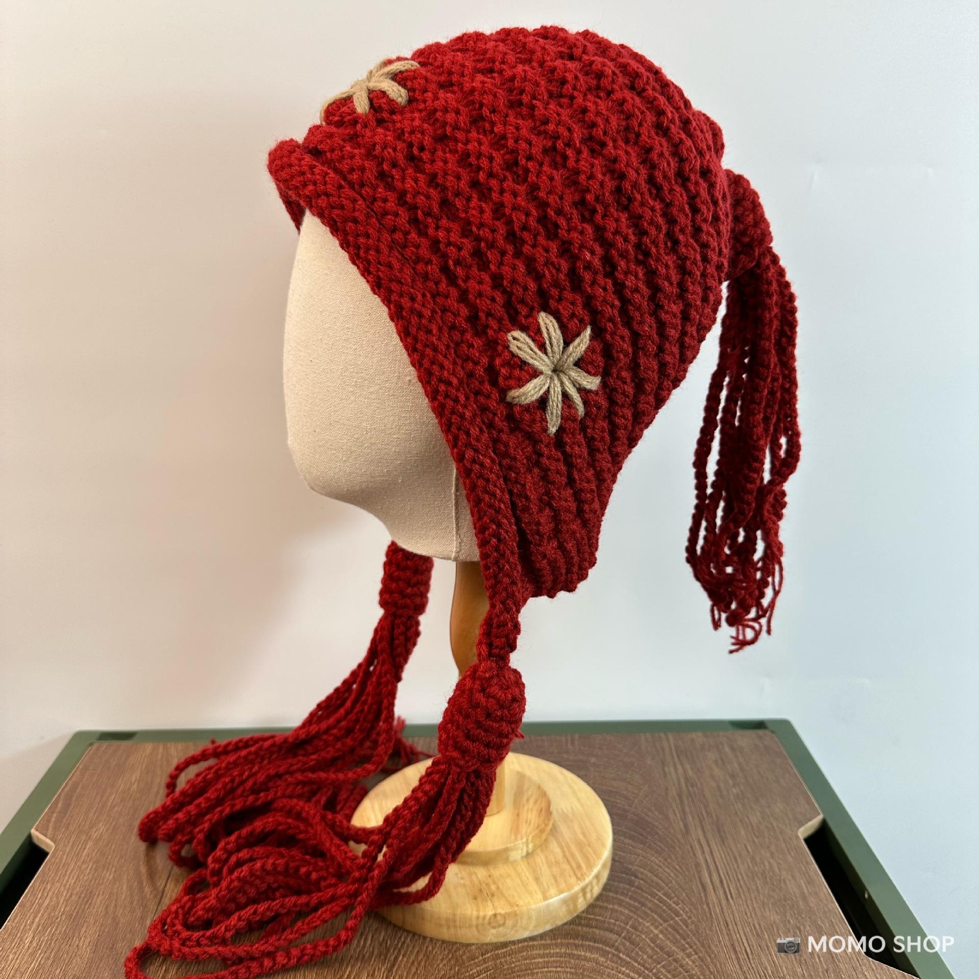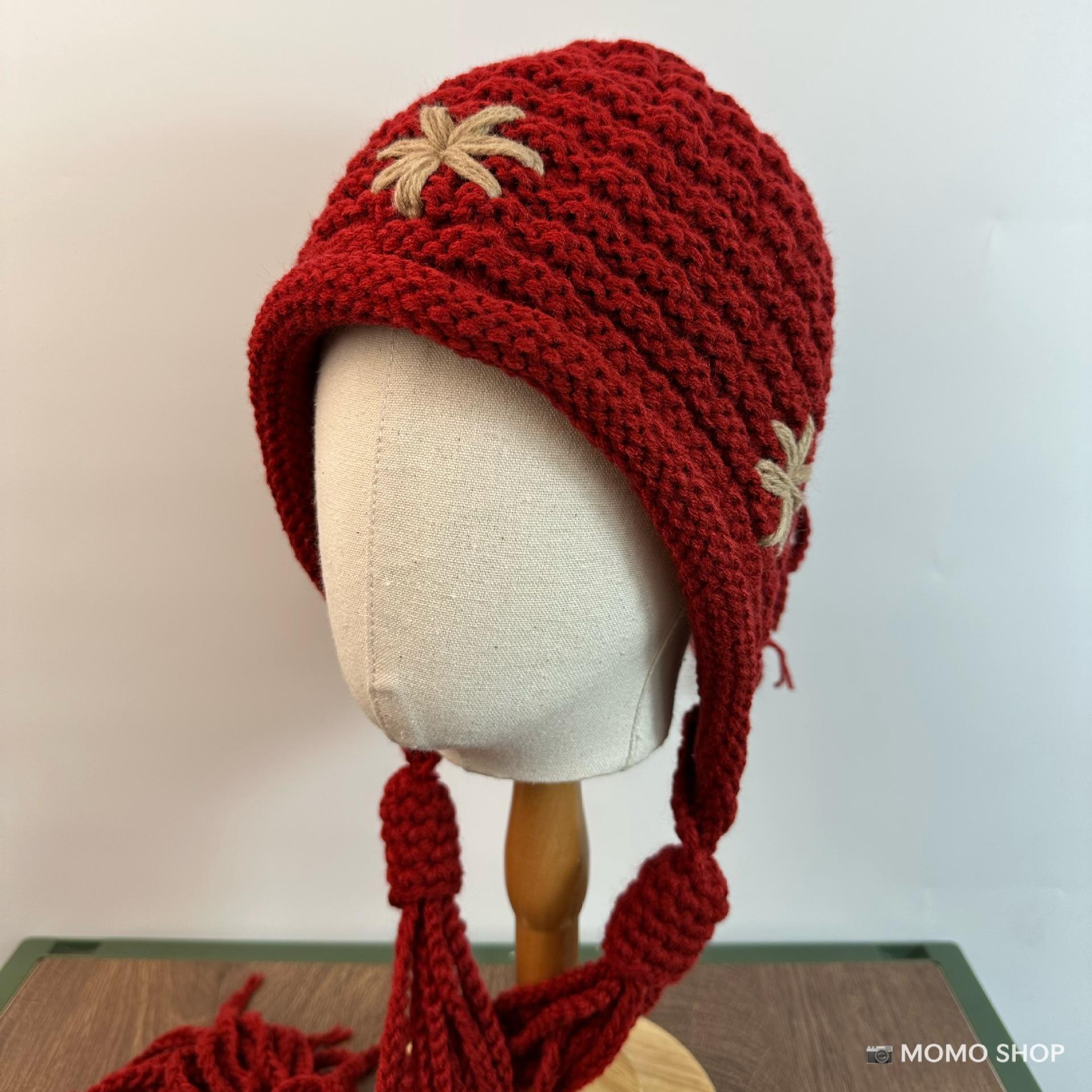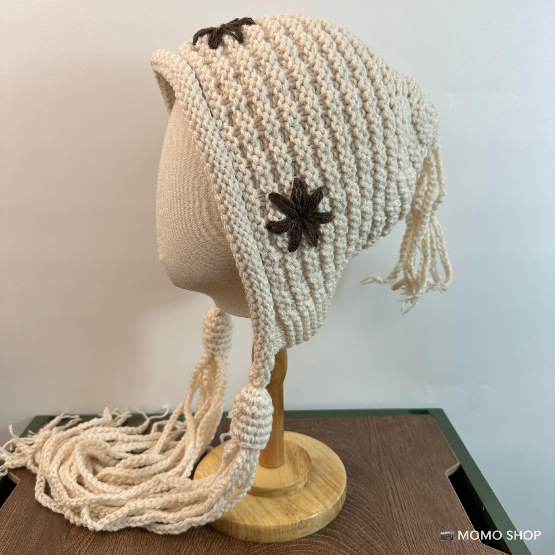 Gorro hecho a mano ~ Gorro de lana con borlas y flores tejidas para mujer, otoño e invierno, cálido, con trenza pequeña y protección para las orejas.