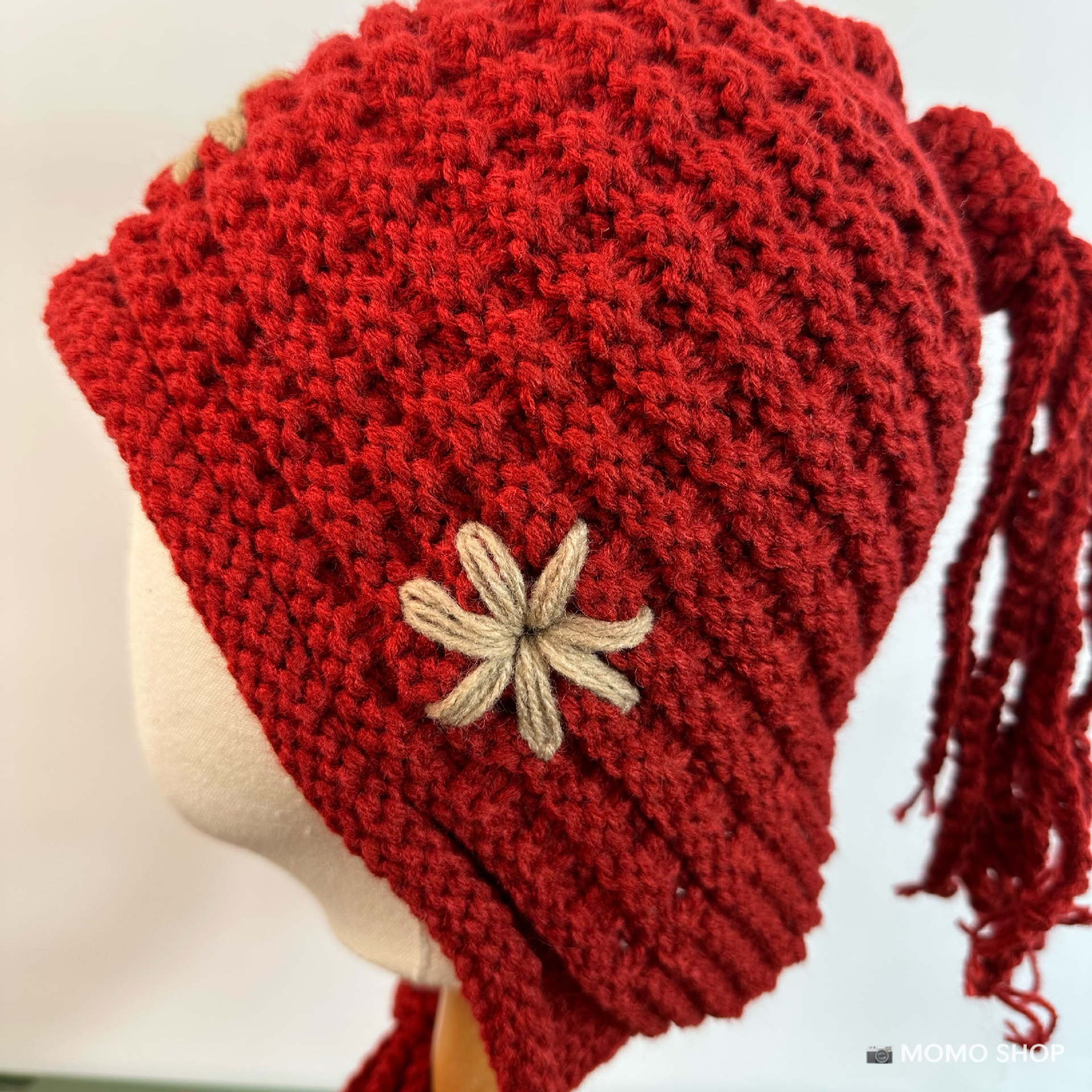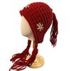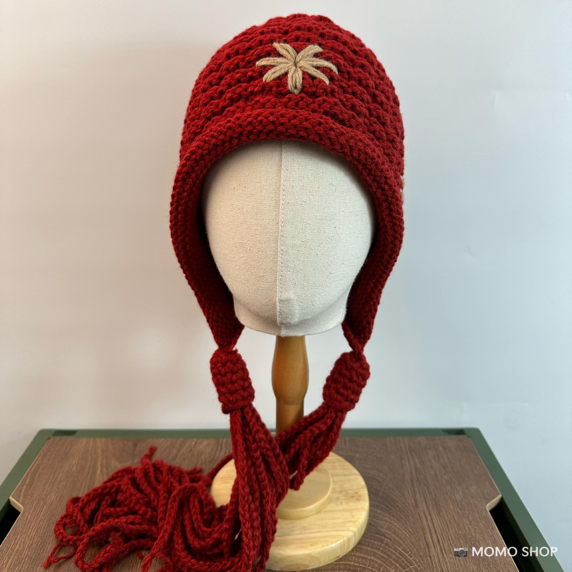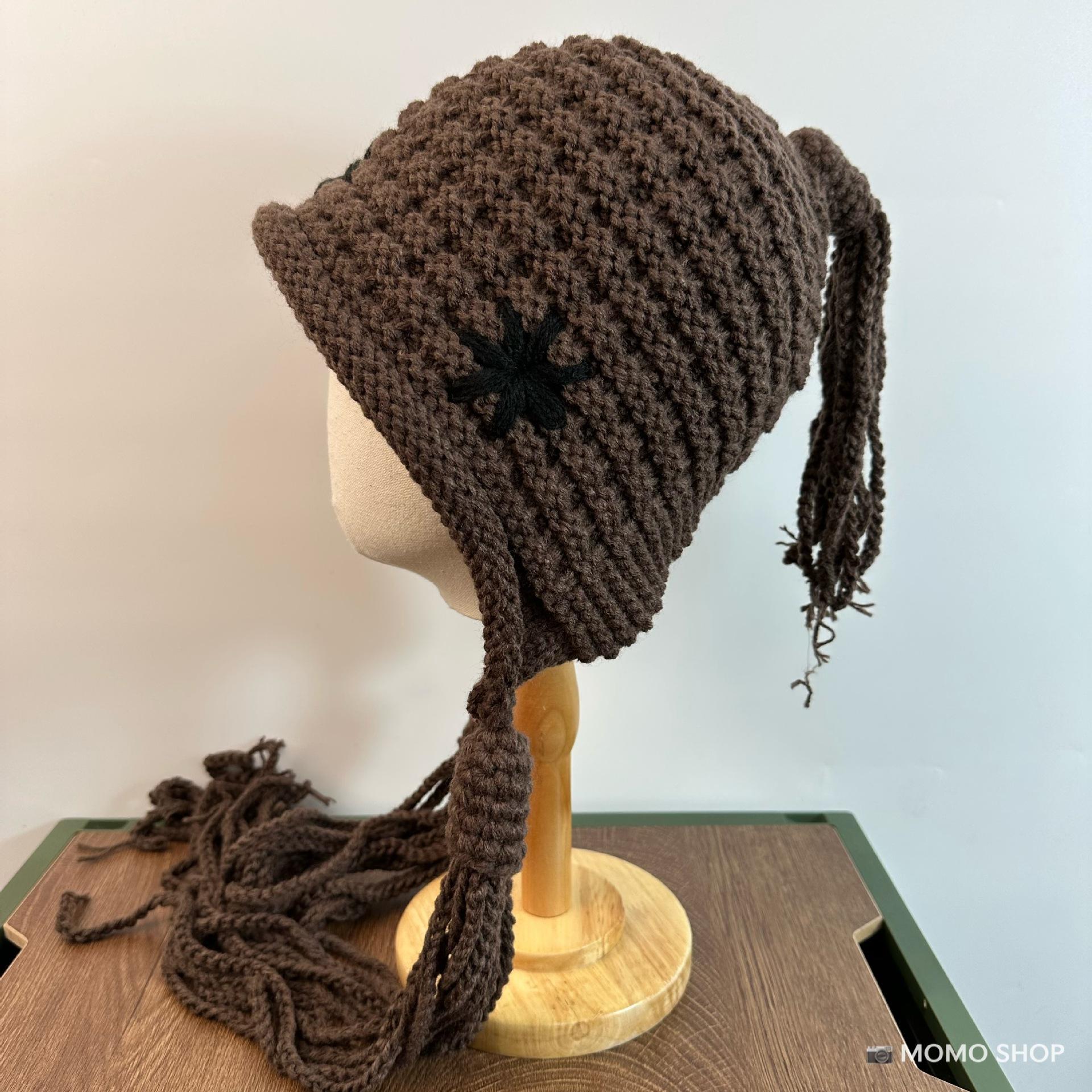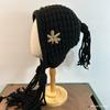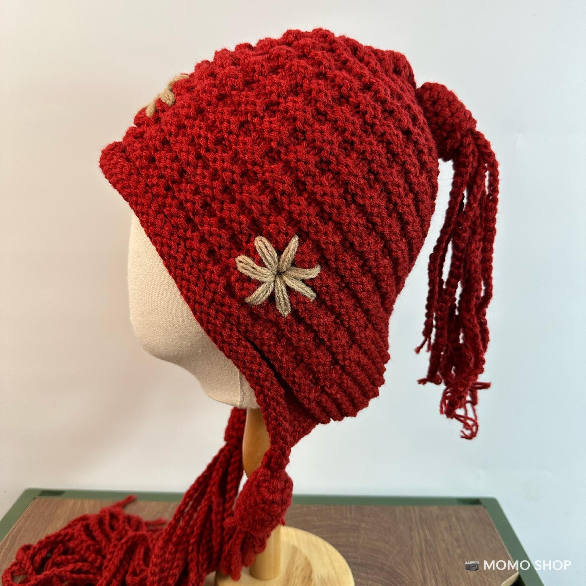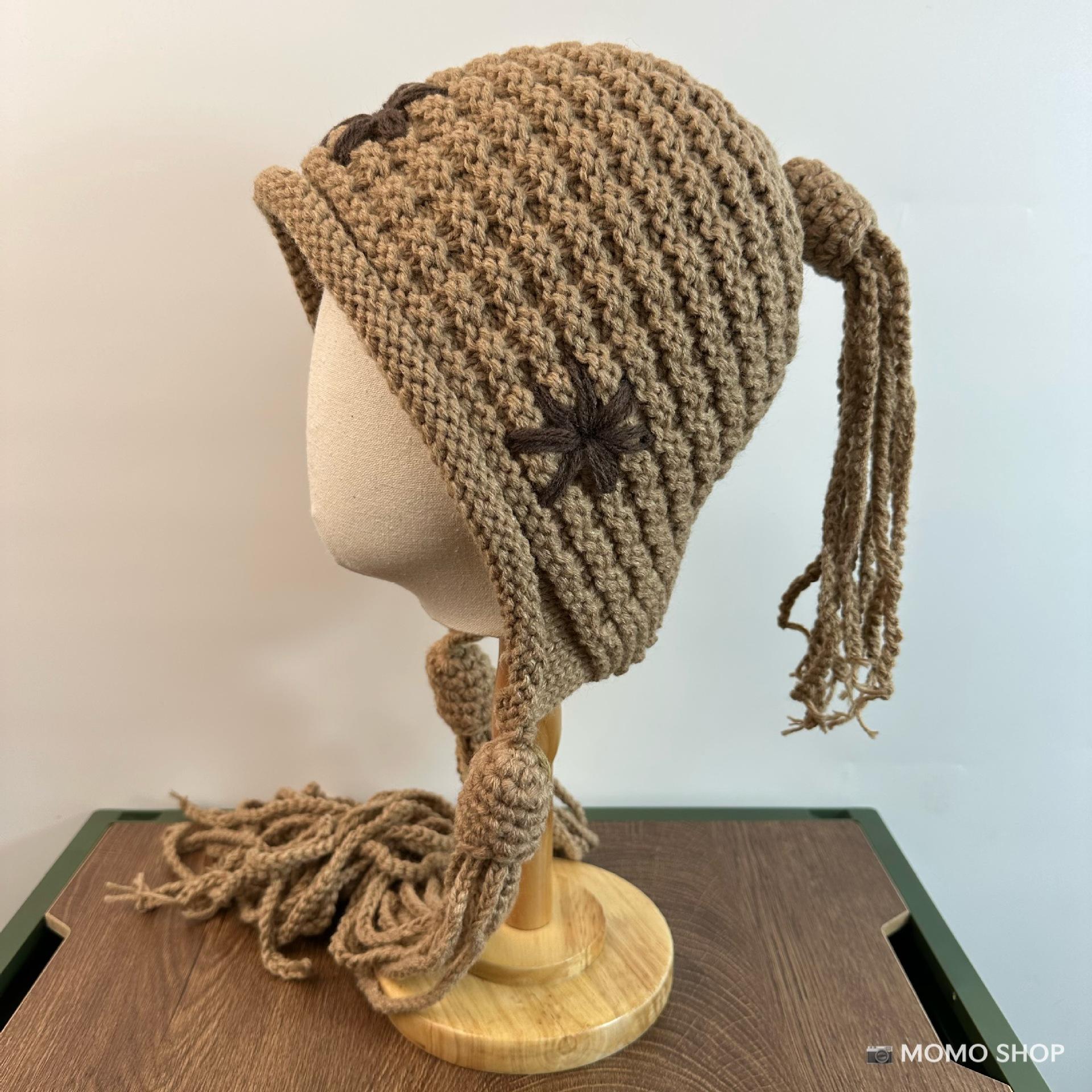 Gorro hecho a mano ~ Gorro de lana con borlas y flores tejidas para mujer, otoño e invierno, cálido, con trenza pequeña y protección para las orejas.