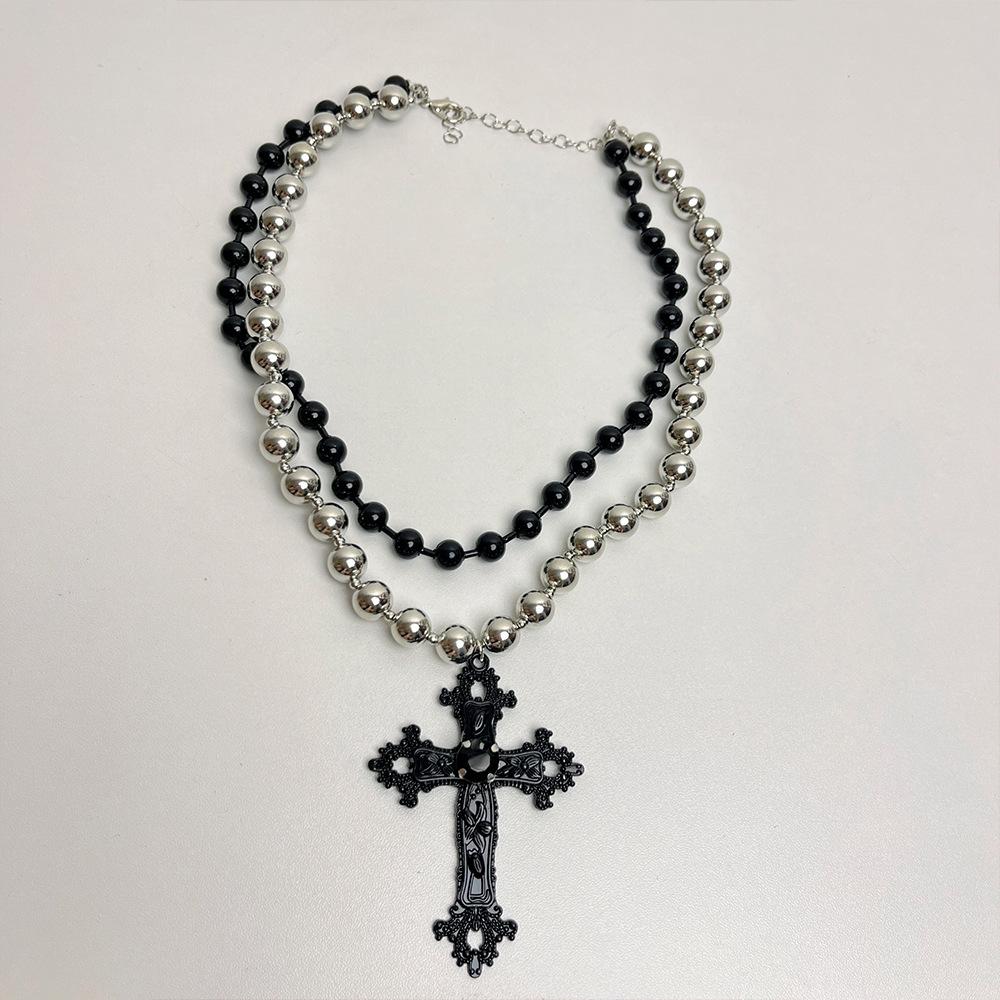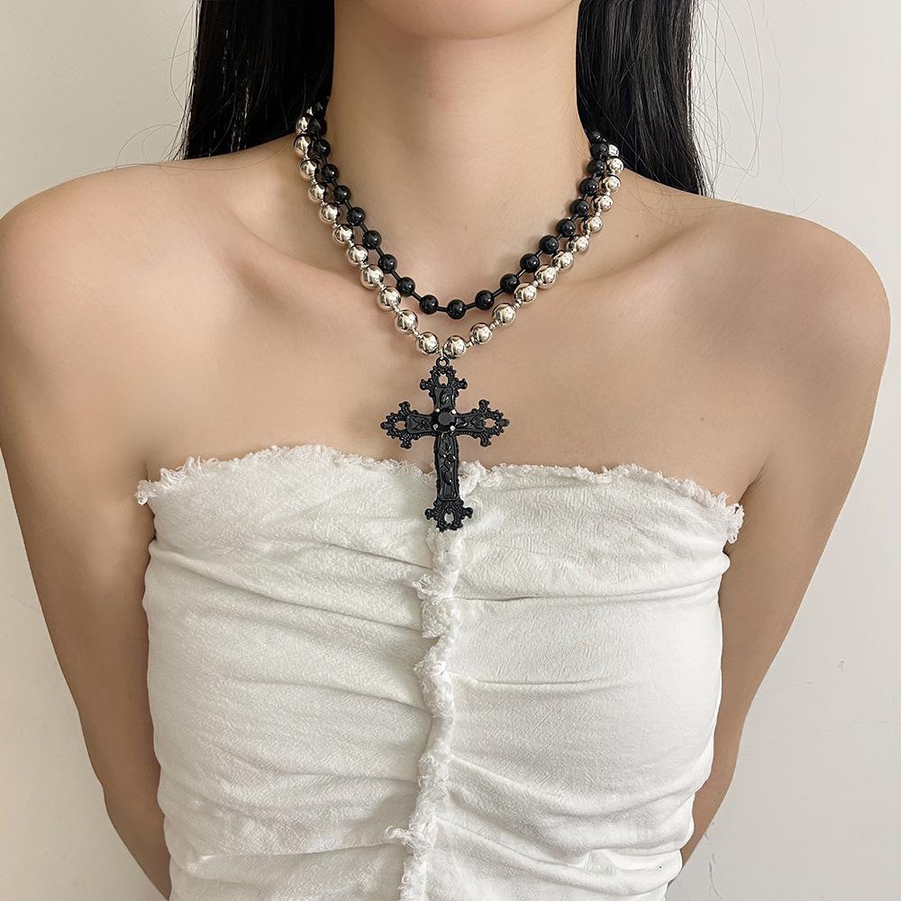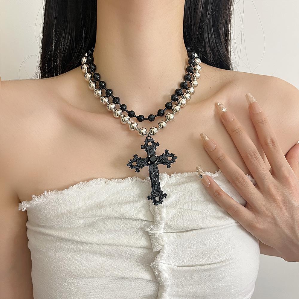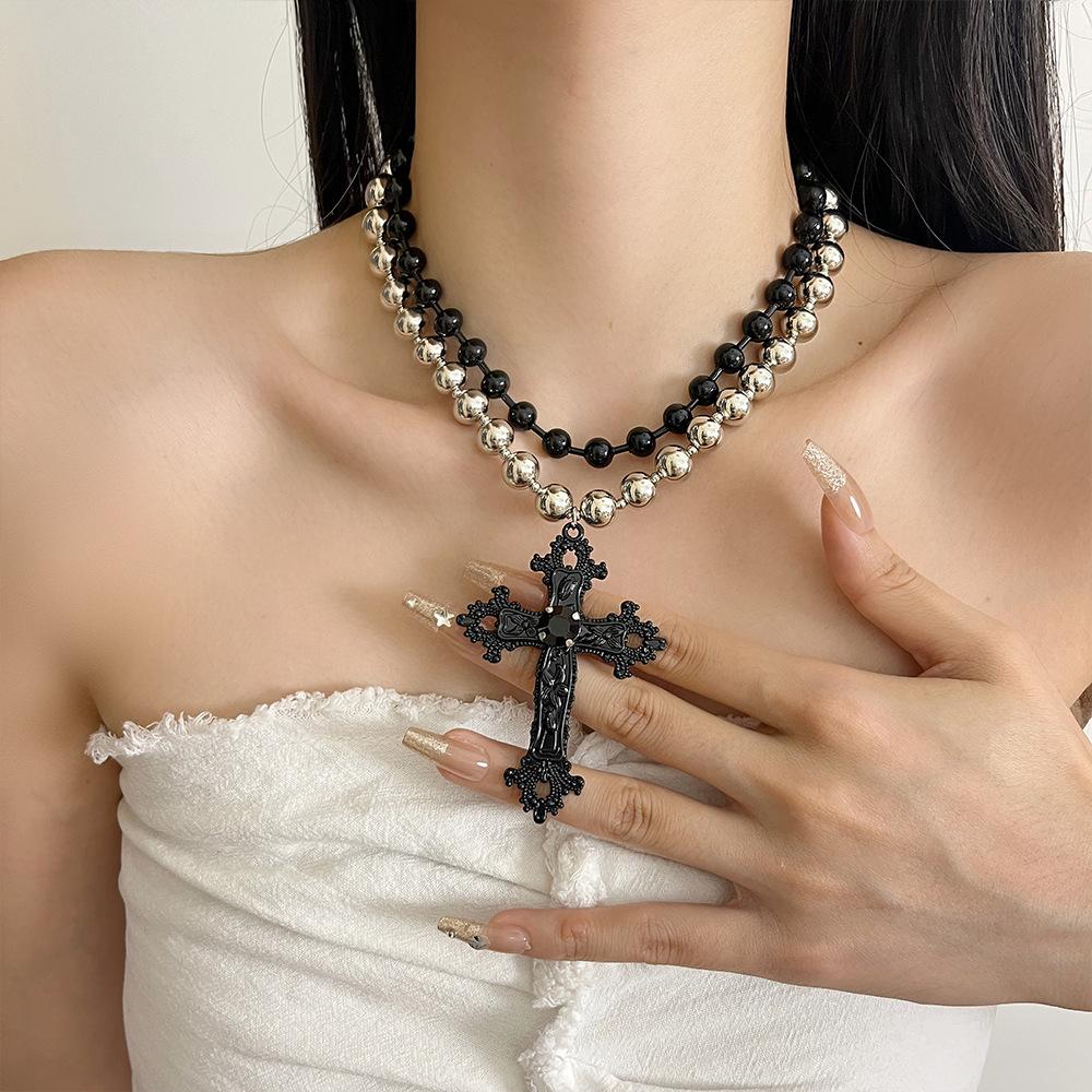 Collar punk de doble capa con cuentas de cruz a juego en colores negro y plateado para mujer, cadena de clavícula dulce, genial y sexy, collar de personalidad nicho