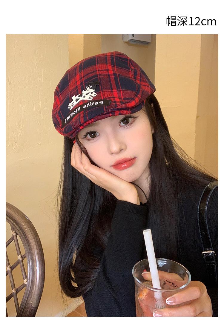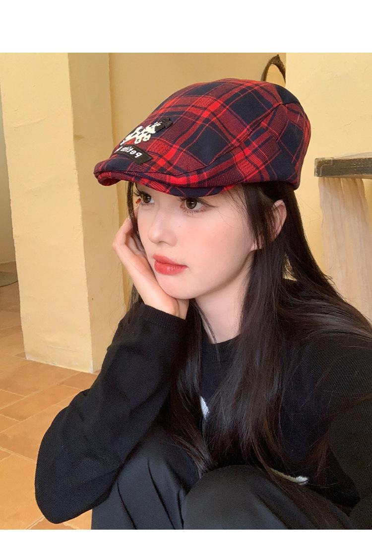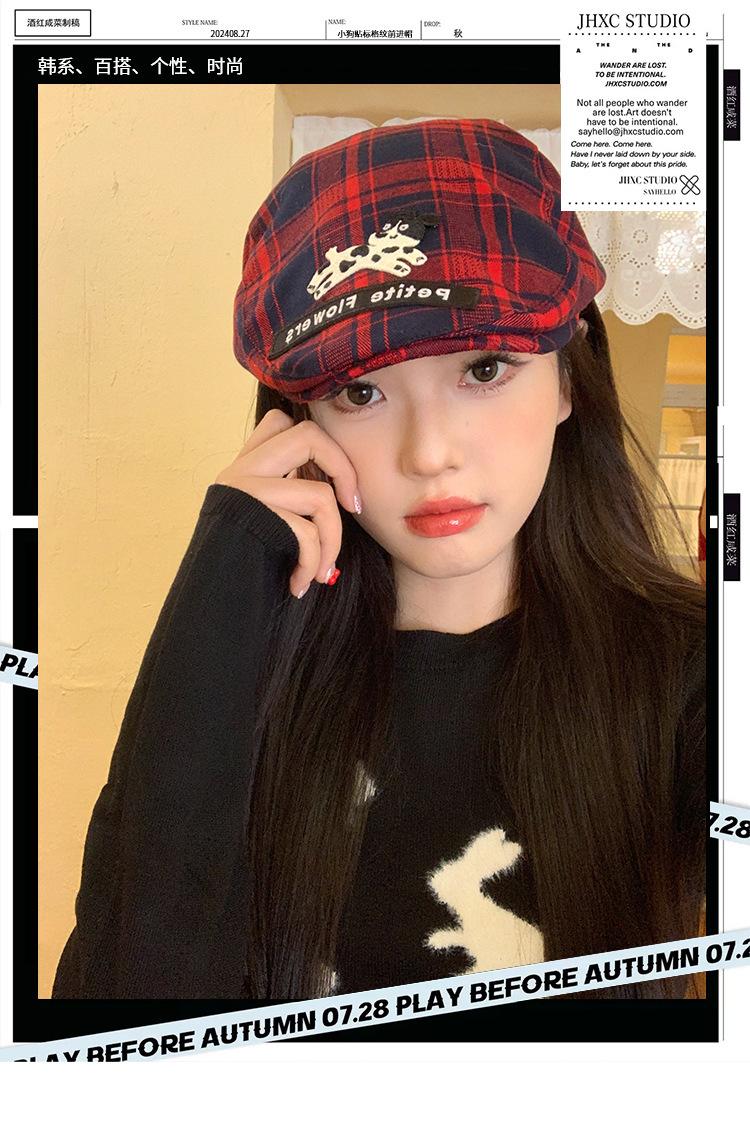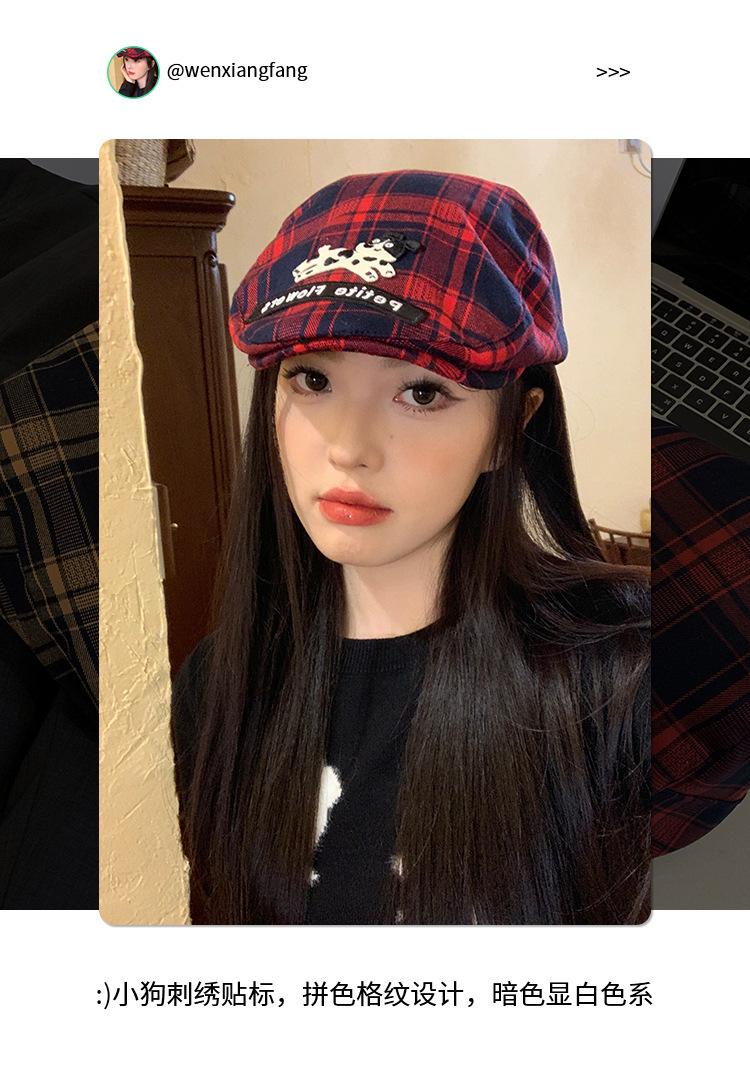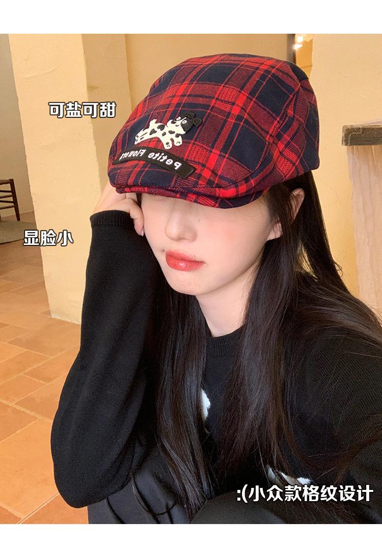 Gorra de cachorro roja a cuadros estilo coreano para mujer primavera y otoño combinable nicho boina circunferencia de cabeza grande muestra rostro pequeño sombrero