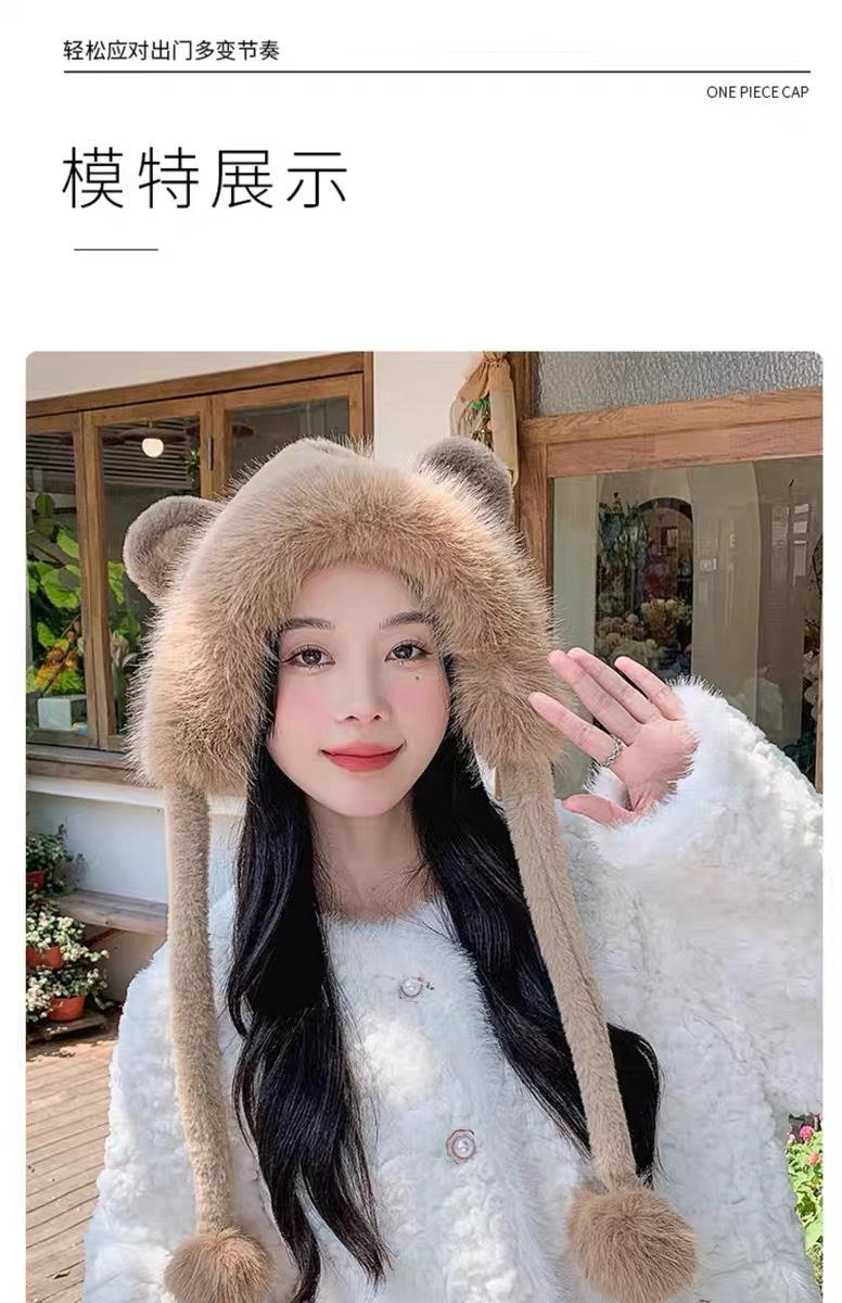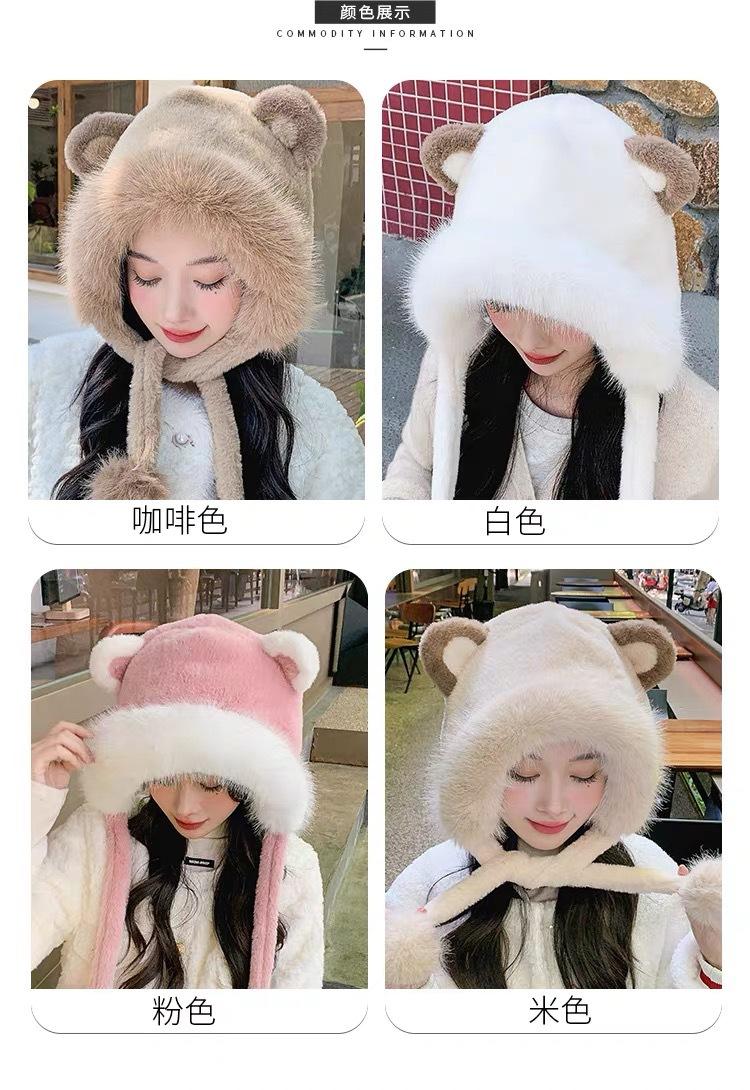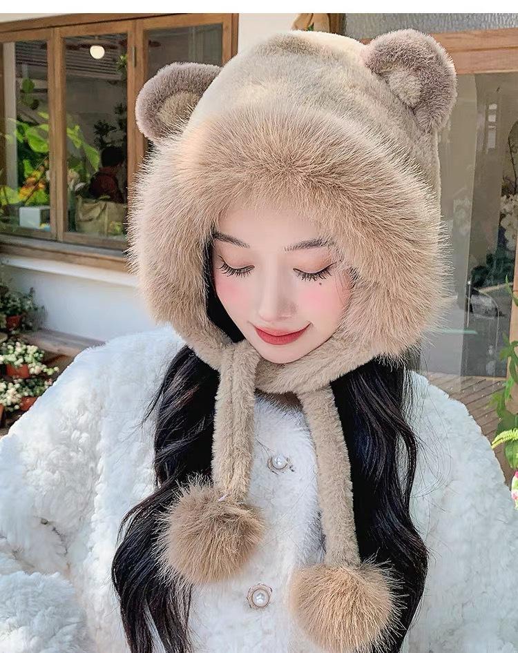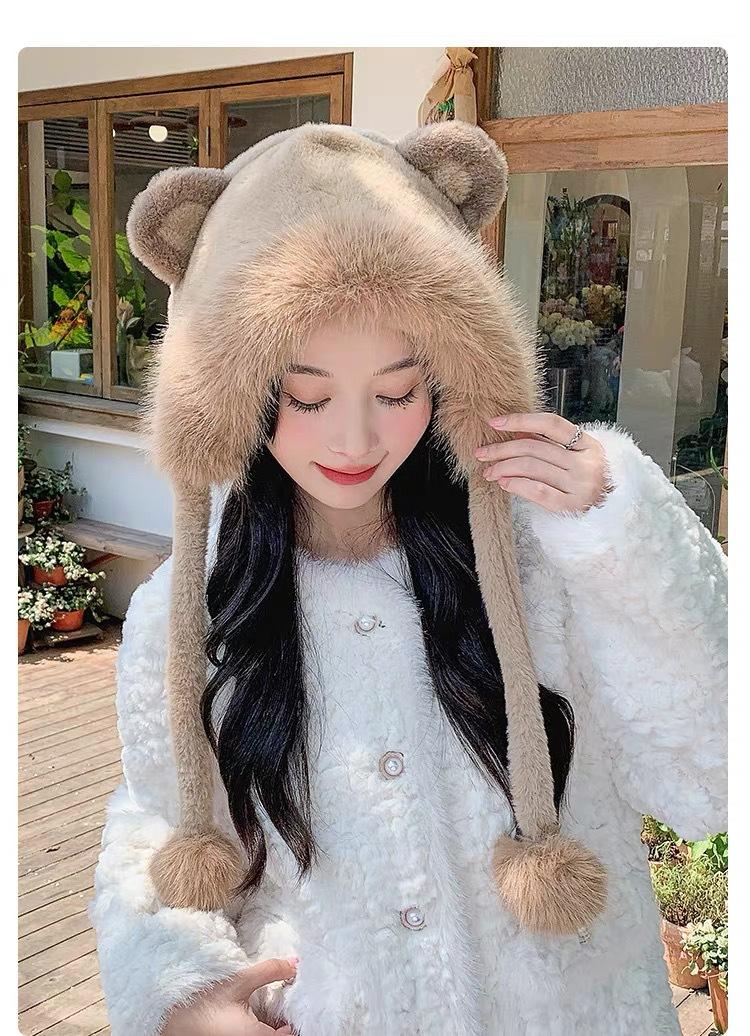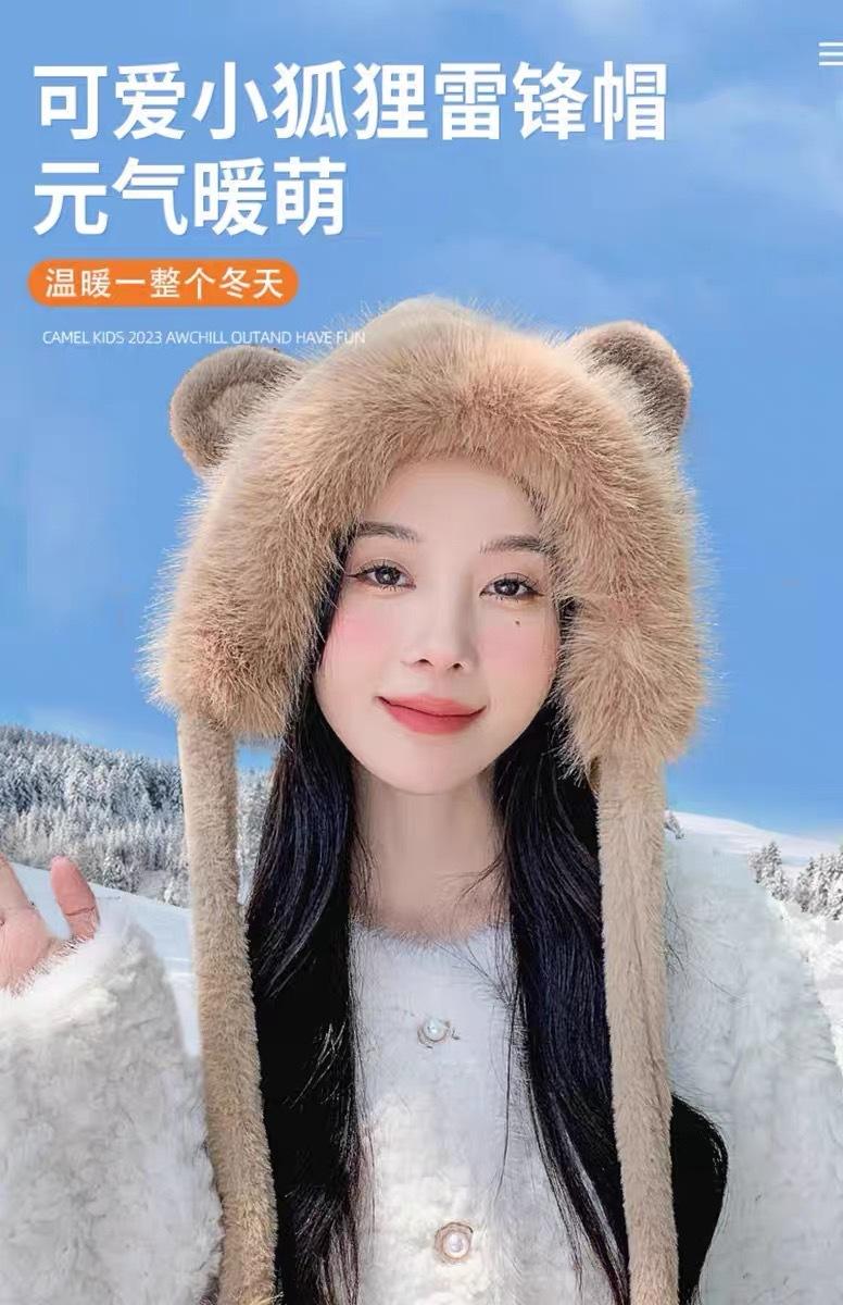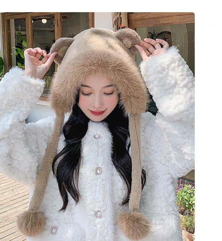 Gorro de orejas de oso para mujer, bonito y esponjoso, estilo Lei Feng, para otoño e invierno, cálido y resistente al frío.