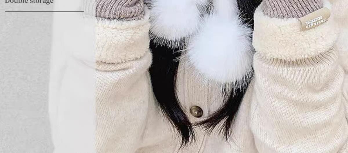 Long rope fur ball cap-beige, Long rope fur ball cap-white, Long rope fur ball cap-brown, Houndstooth headband-black