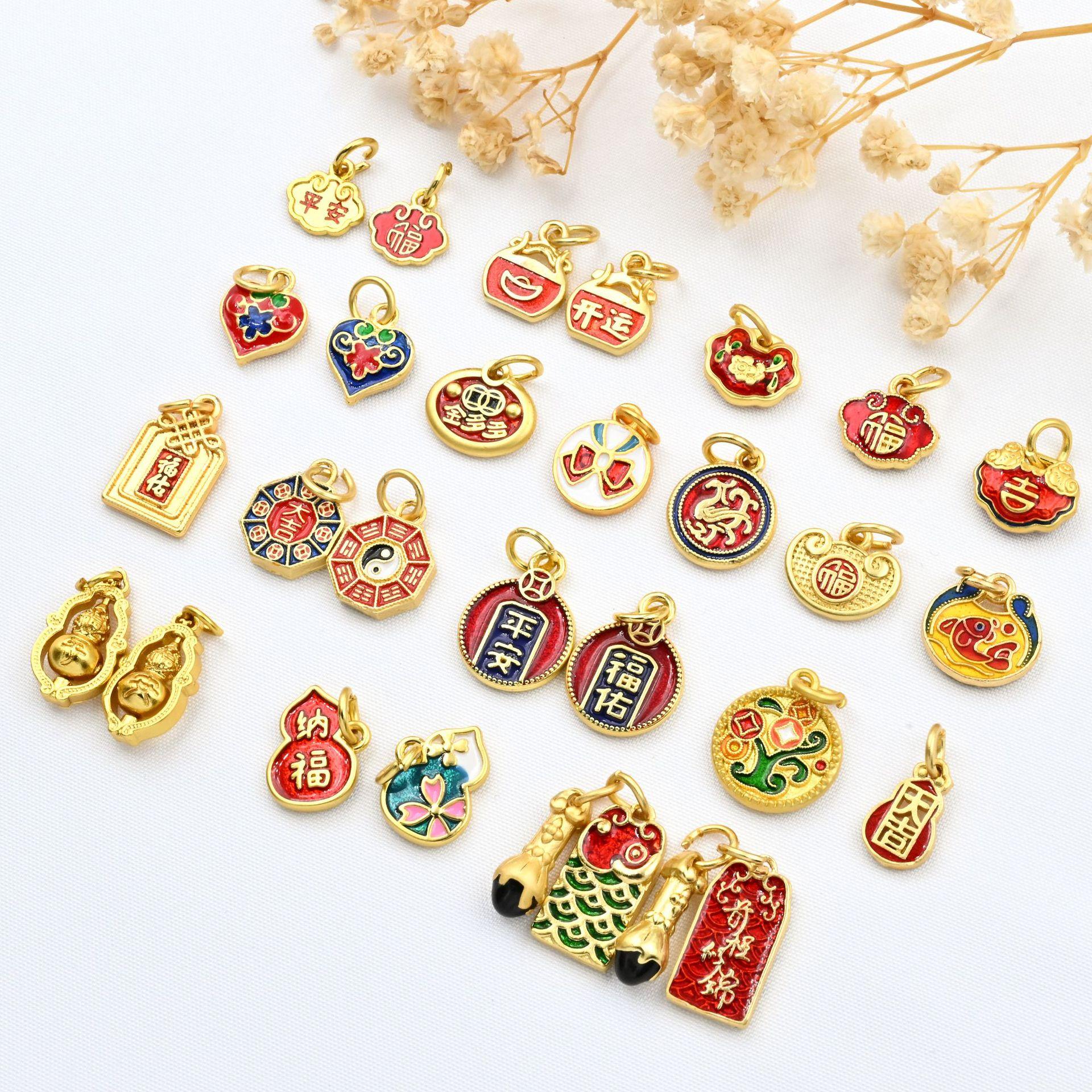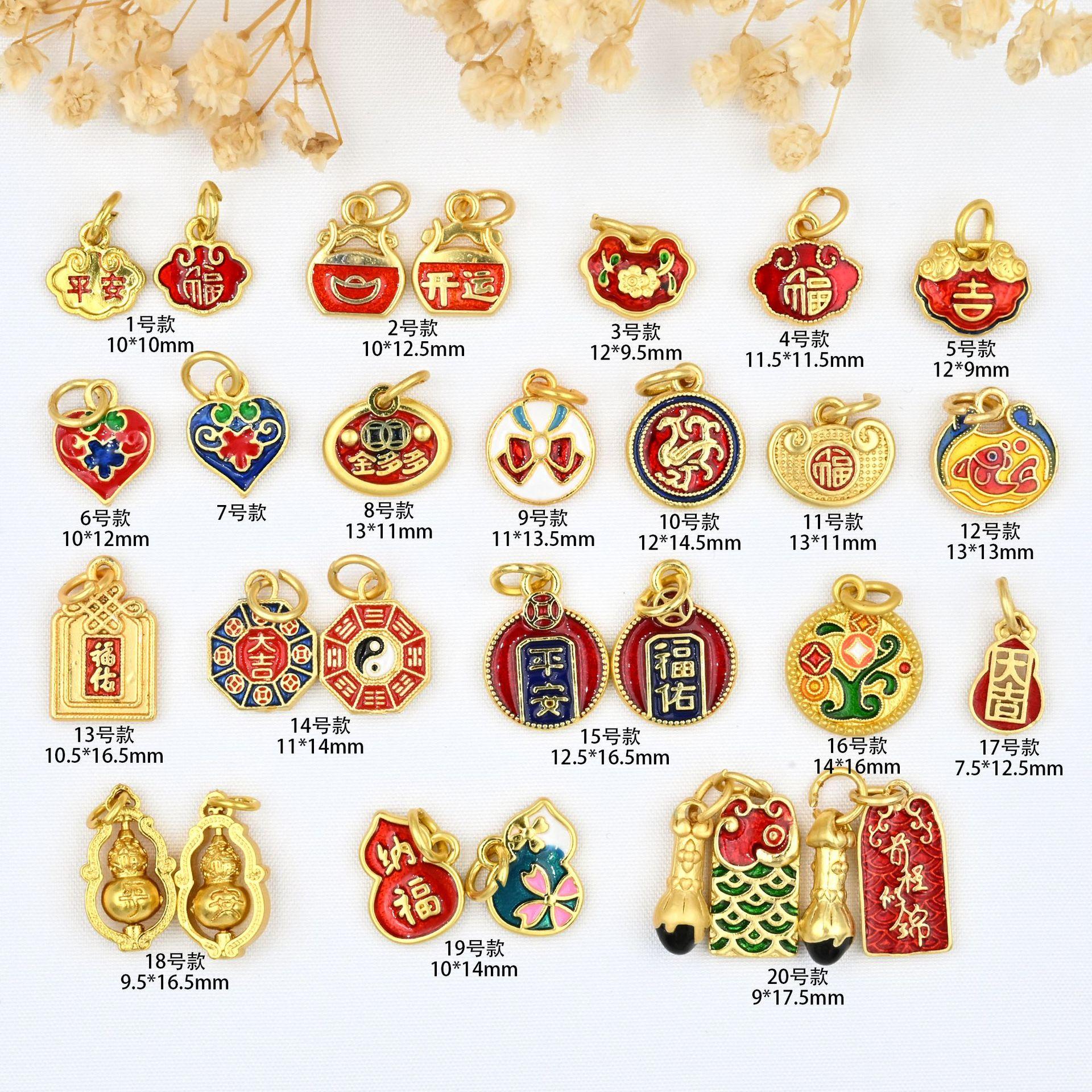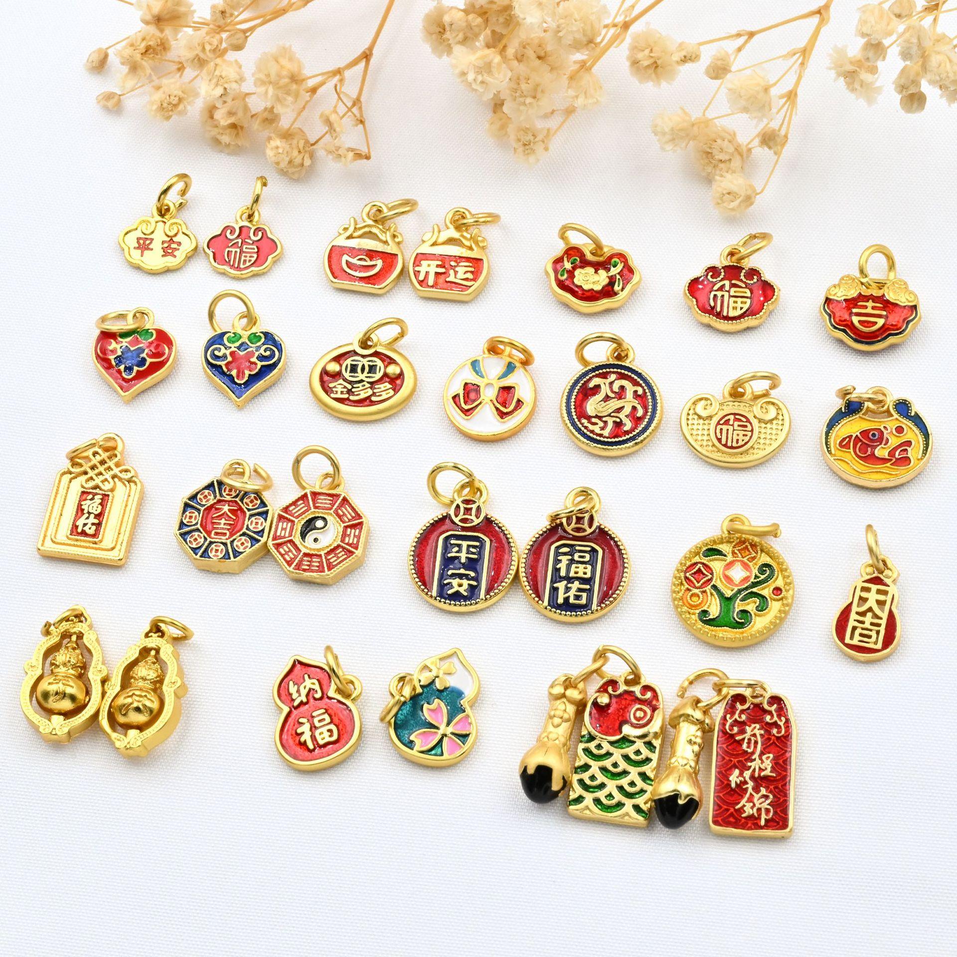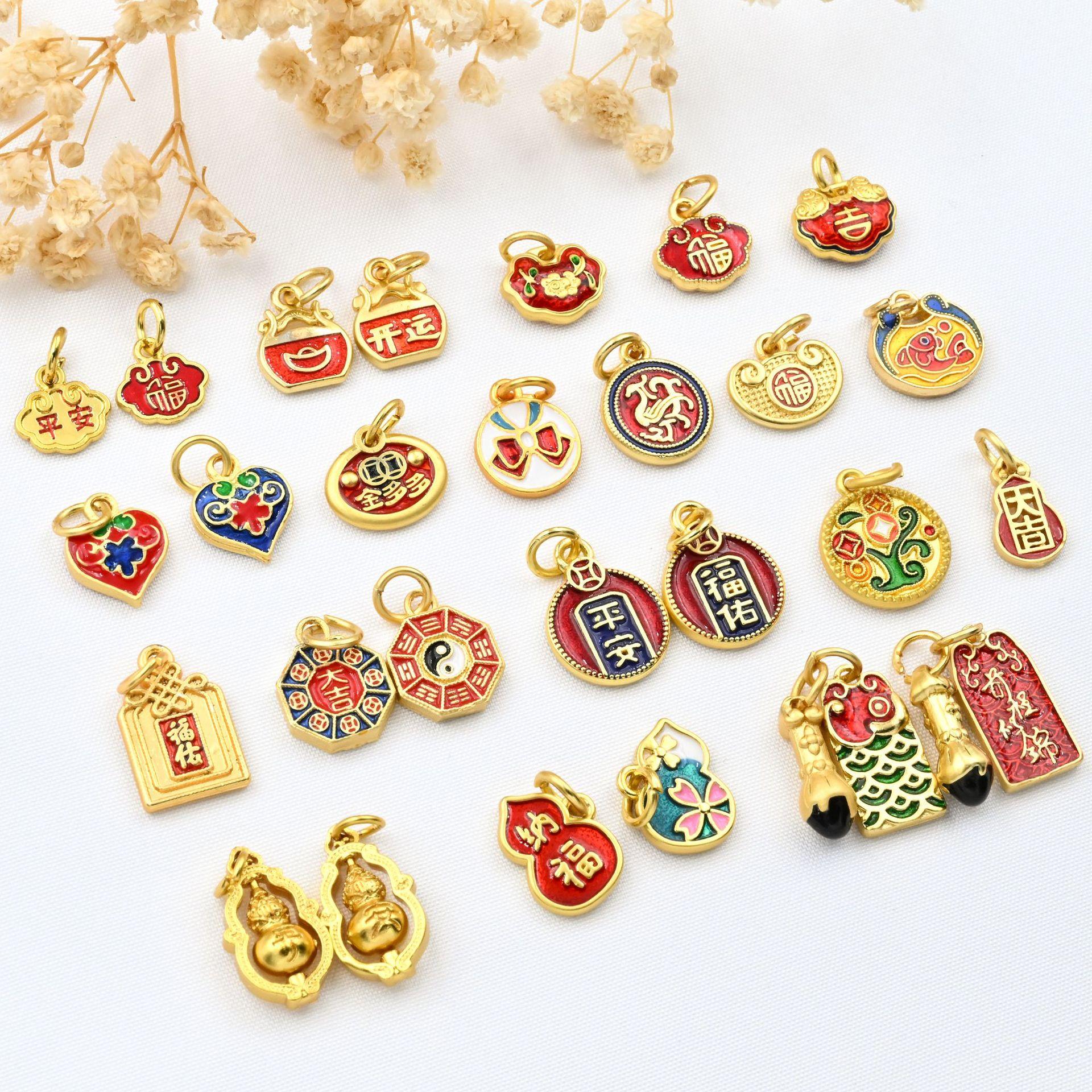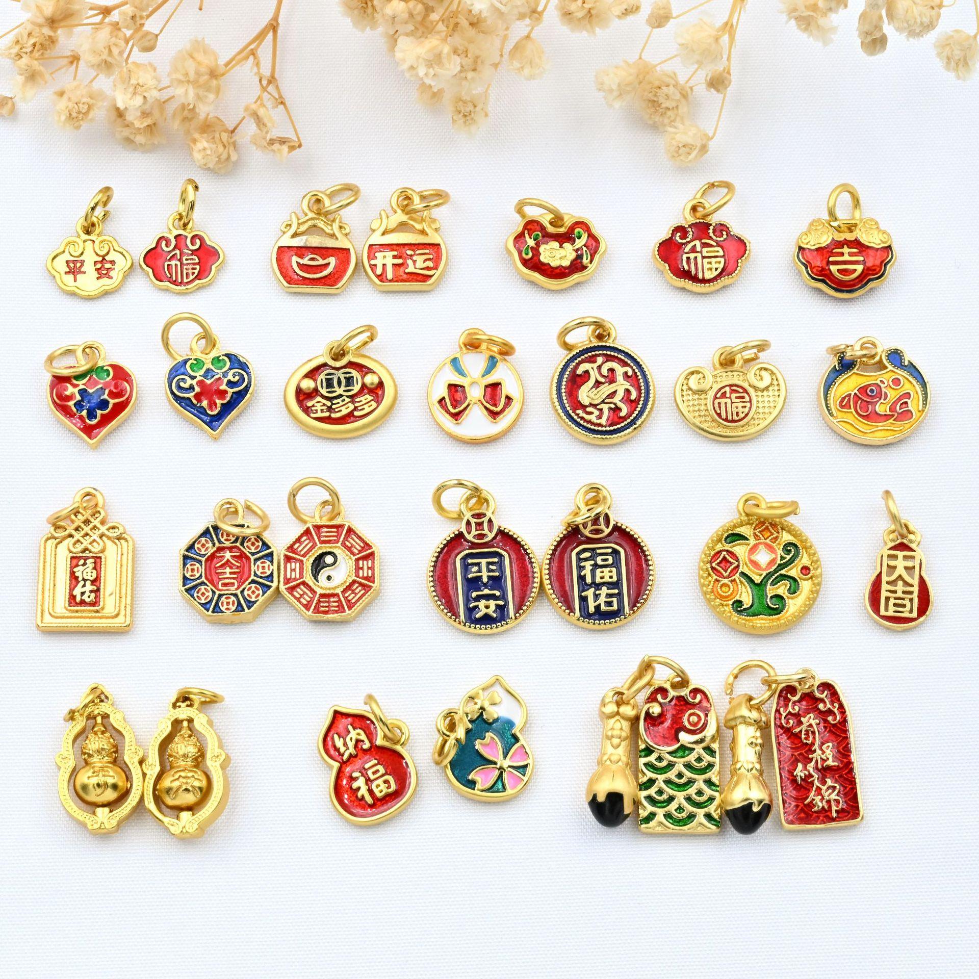 Colgante de gota de aceite de oro antiguo con forma de brocado Fu, colgante hecho a mano con forma de personaje, pulsera, collar y accesorios.