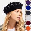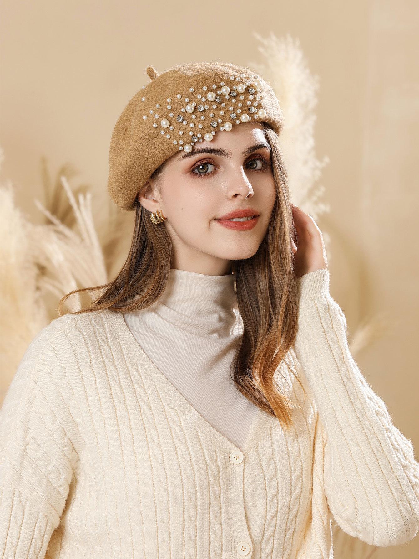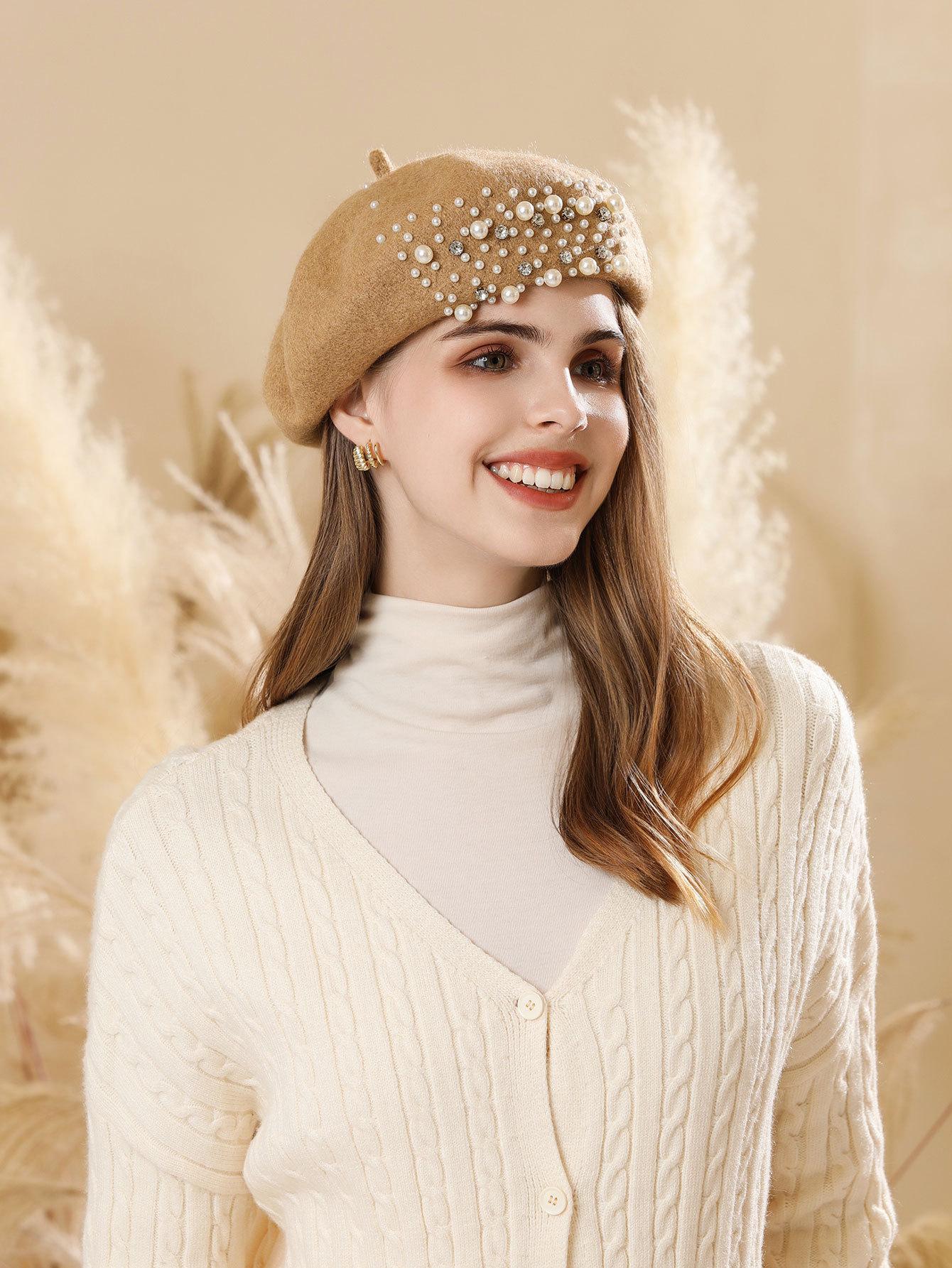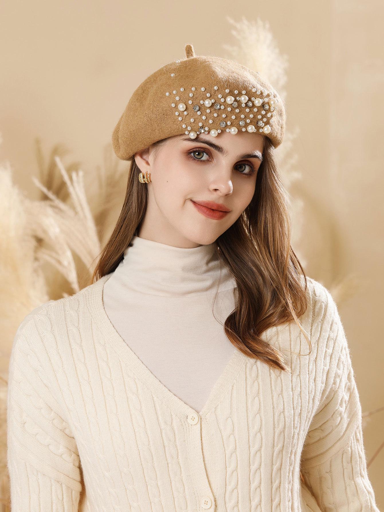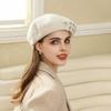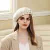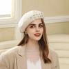 Boina de Lana Transfronteriza con Perlas y Pedrería para Mujer, Sombrero de Calabaza de Otoño e Invierno, Sombrero de Pintor Retro Británico, Estilo Retro Coreano