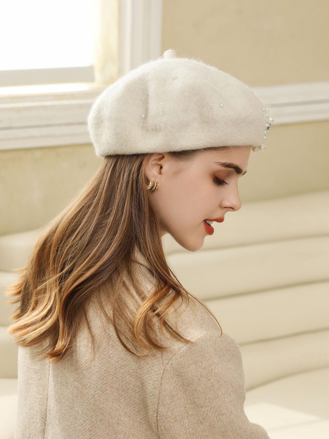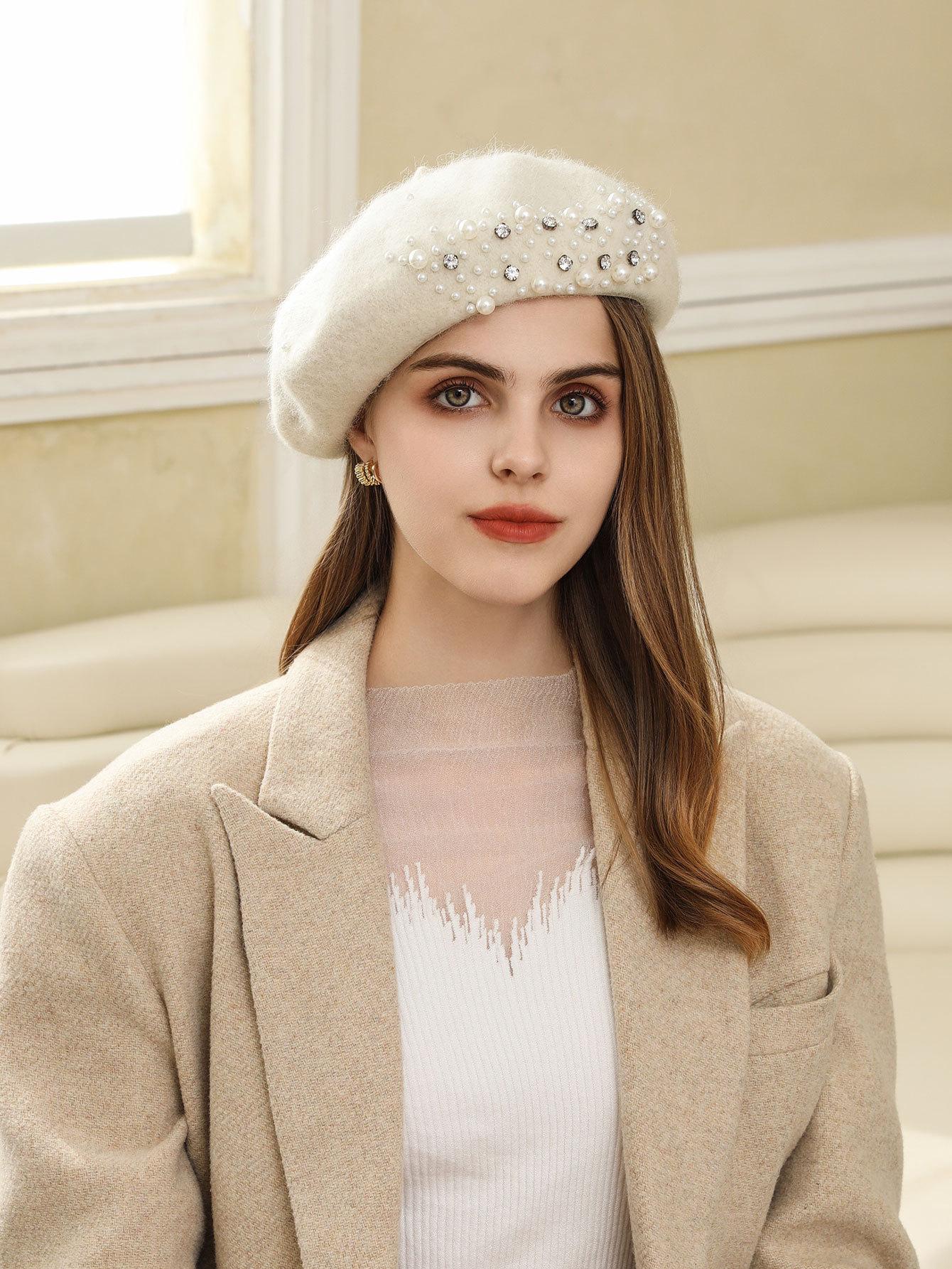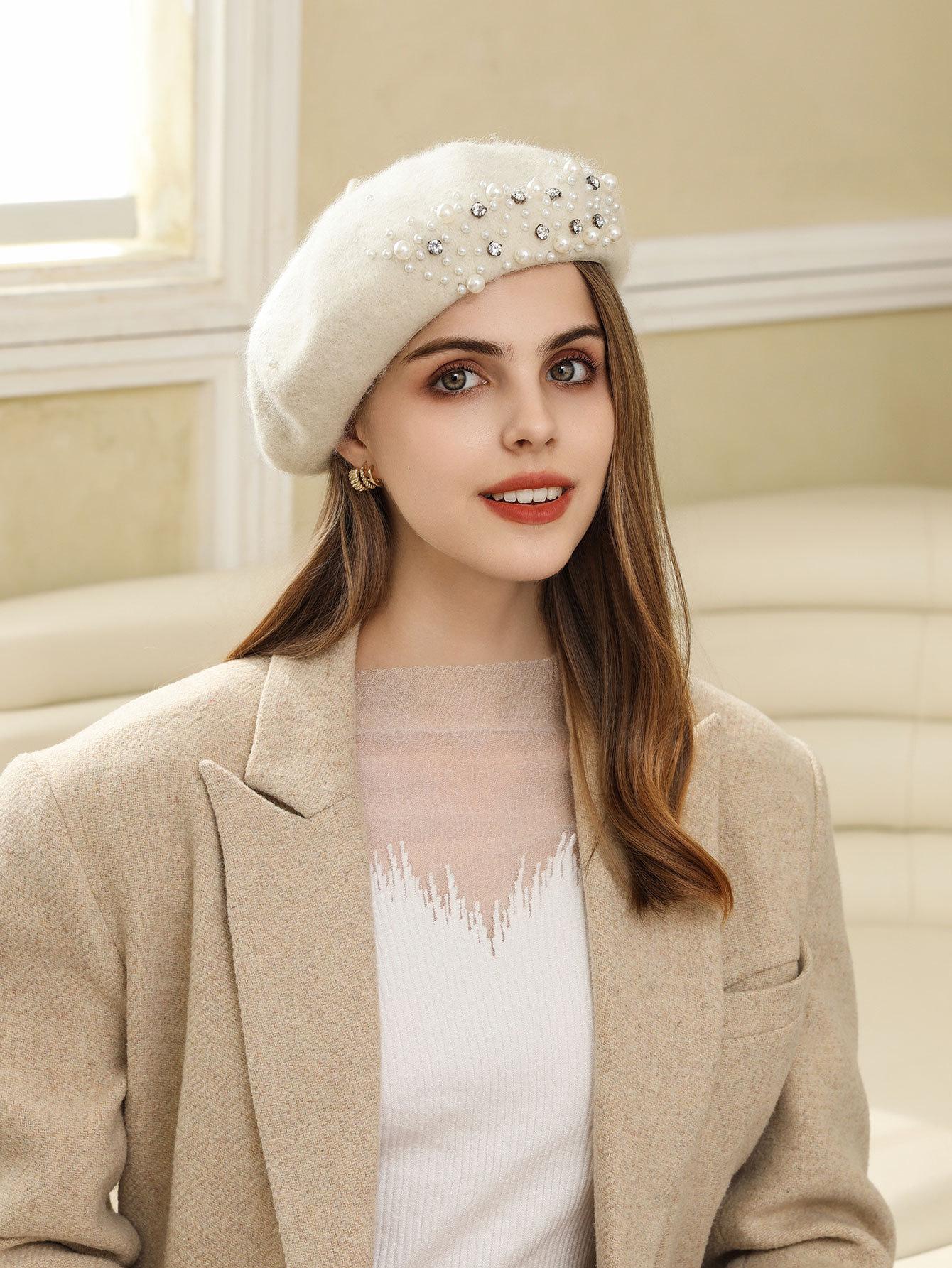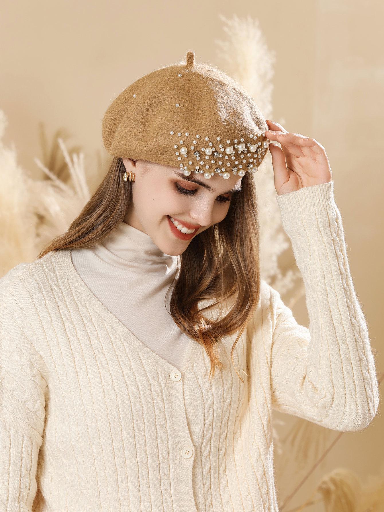 Boina de Lana Transfronteriza con Perlas y Pedrería para Mujer, Sombrero de Calabaza de Otoño e Invierno, Sombrero de Pintor Retro Británico, Estilo Retro Coreano