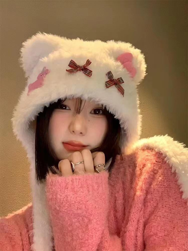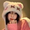 Lindo Sombrero de Oso con Orejas de Gato y Lazo, Sombrero Esponjoso para Mujer para Otoño e Invierno, Cálido, Protección para las Orejas, Sombrero Lei Feng, Sombrero que Muestra la Cara