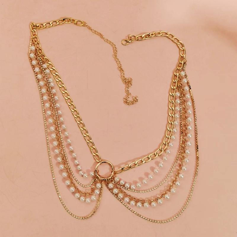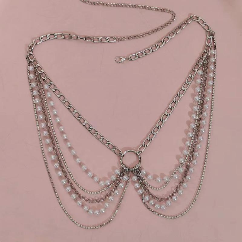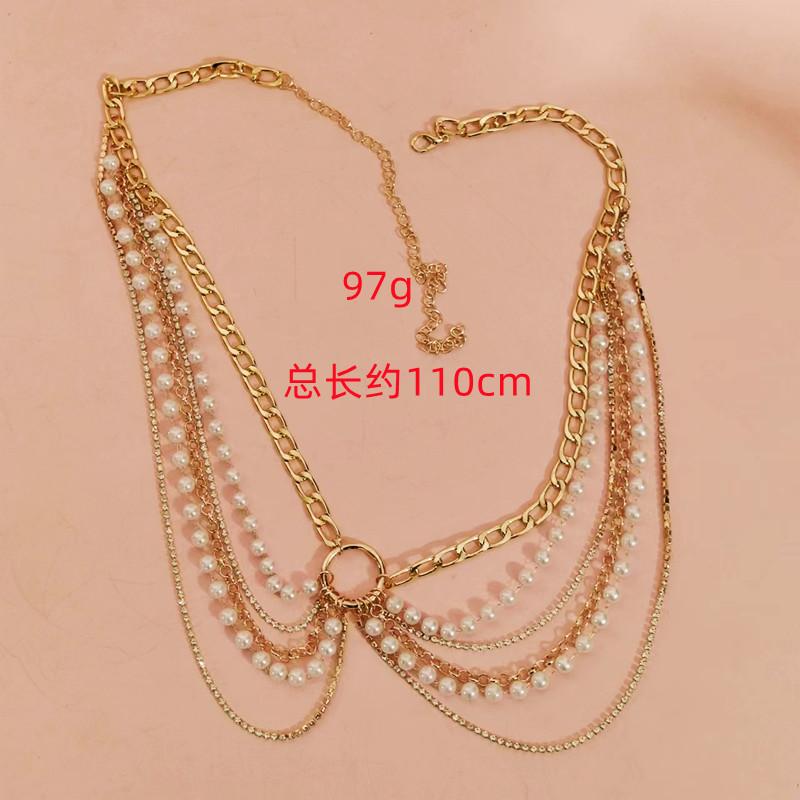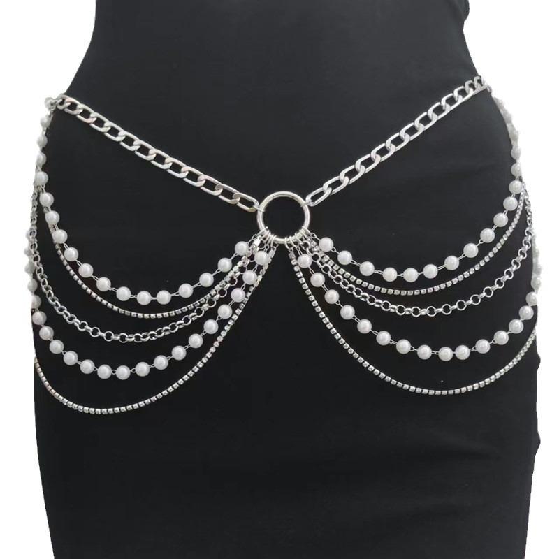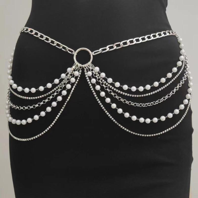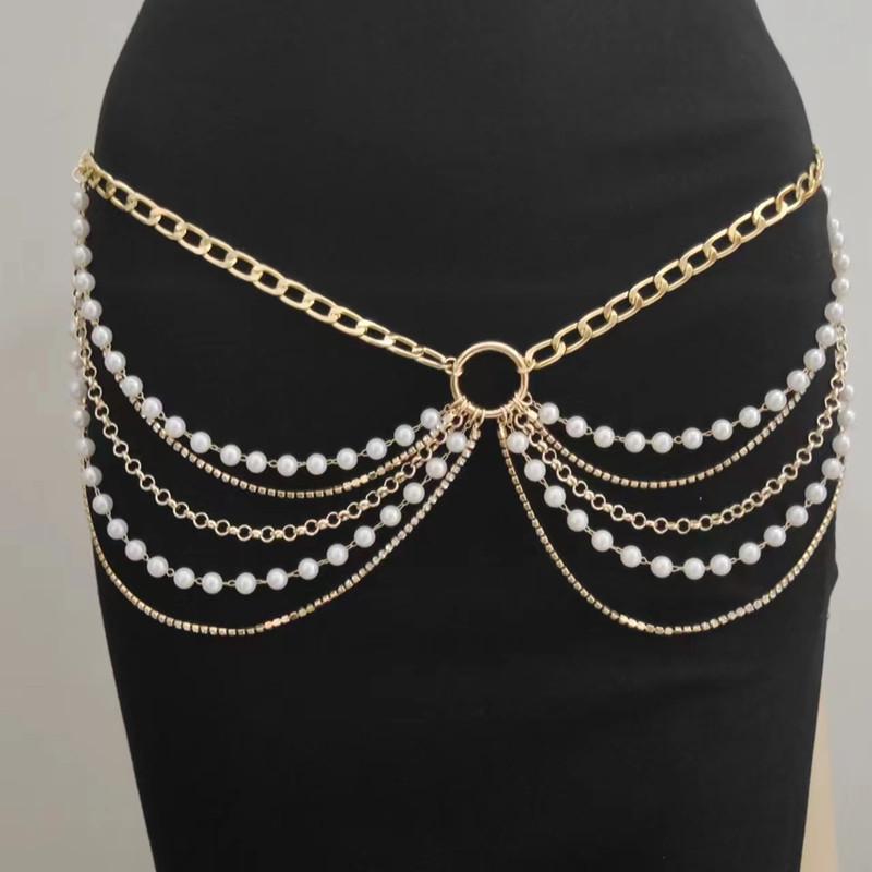 Cadena de cintura multicapa con diamantes de imitación para mujer, joyería transfronteriza europea y americana, cadena de metal con perlas de imitación retro a la moda
