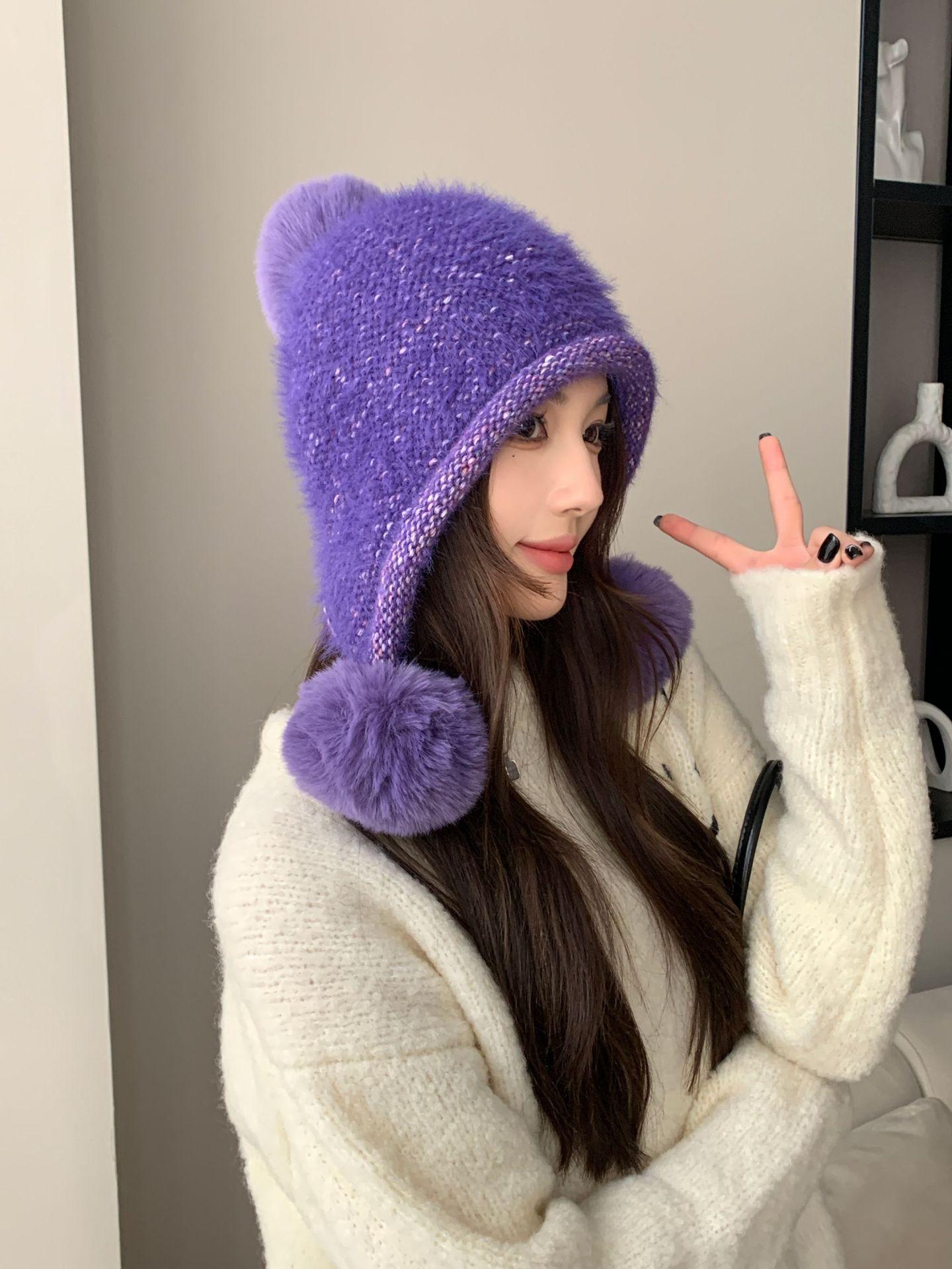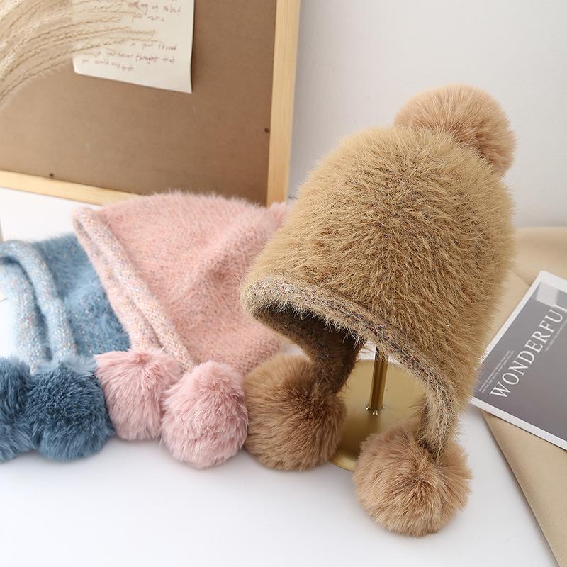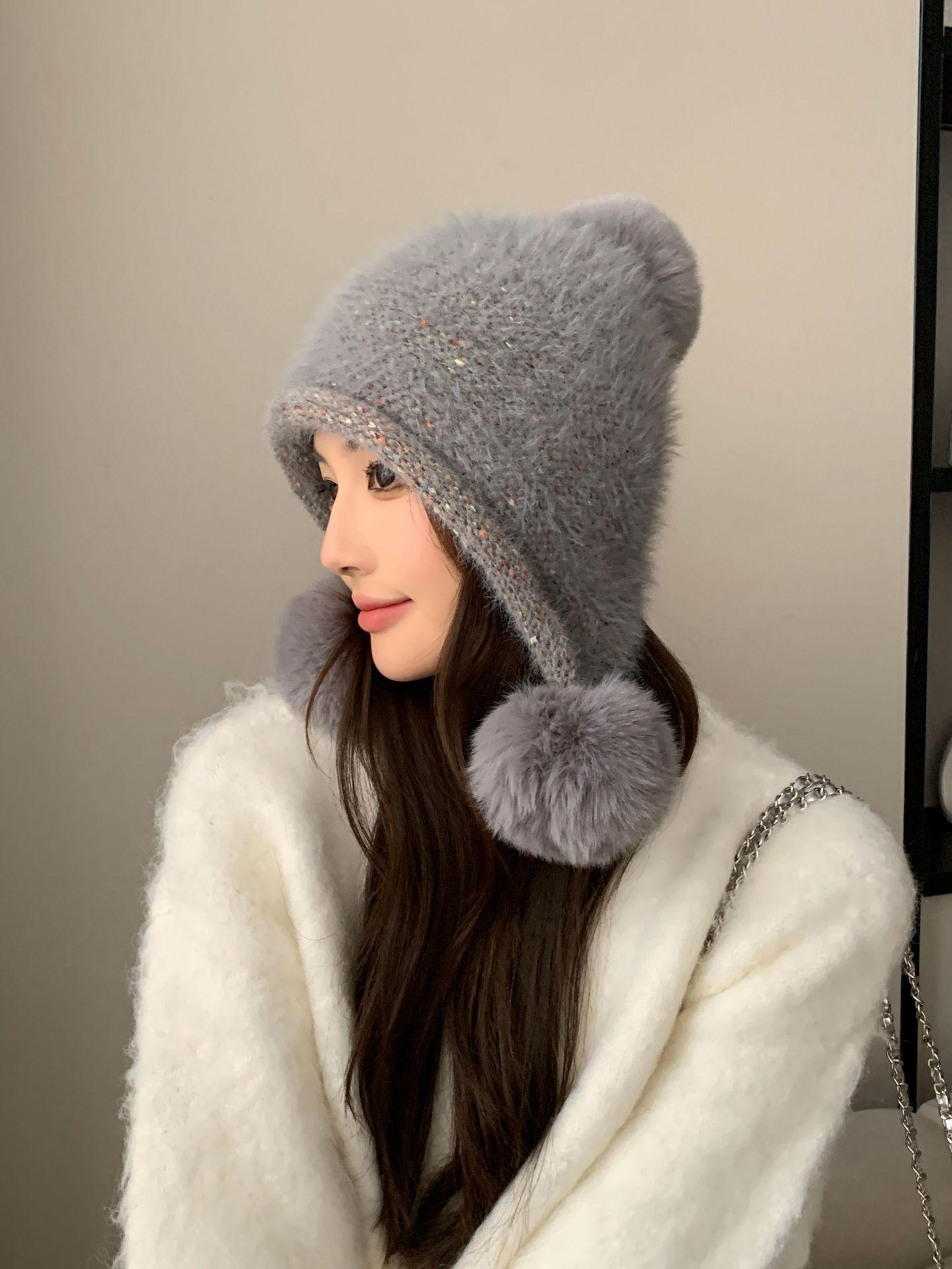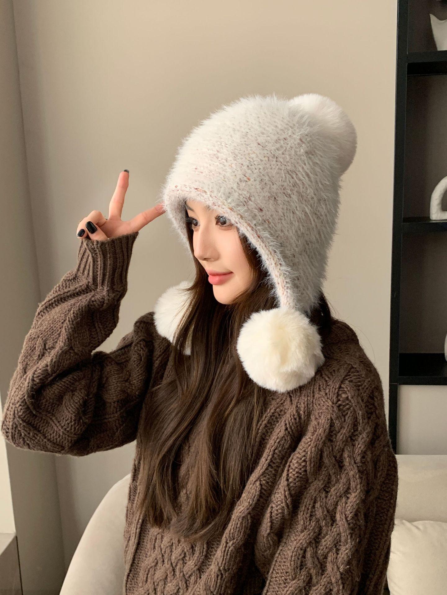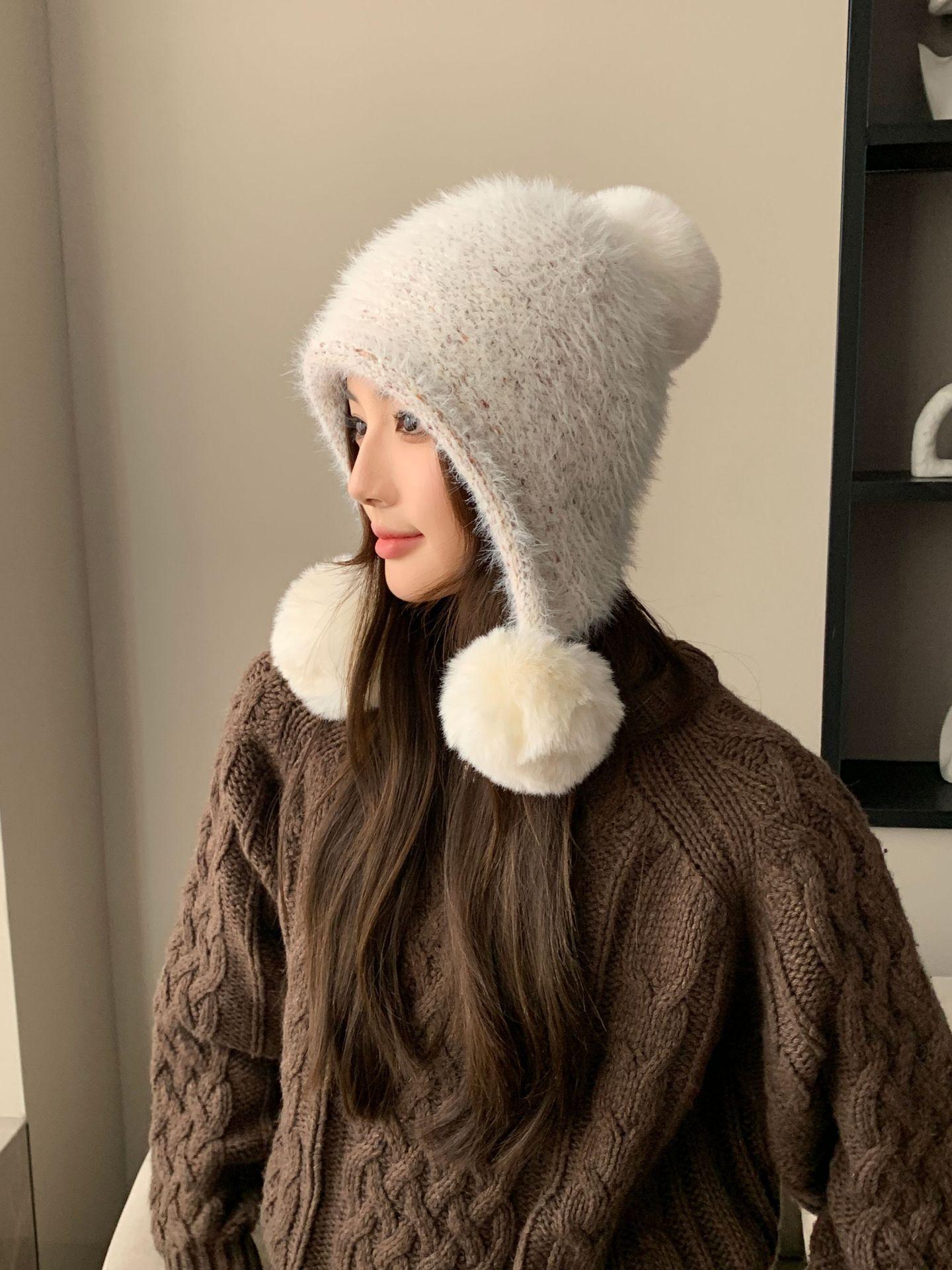 Gorro de invierno 2024 para mujer, cálido gorro de punto con tres bolas de pelo, estilo coreano, protección para los oídos a prueba de frío, gorro de lana que combina con todo, moderno