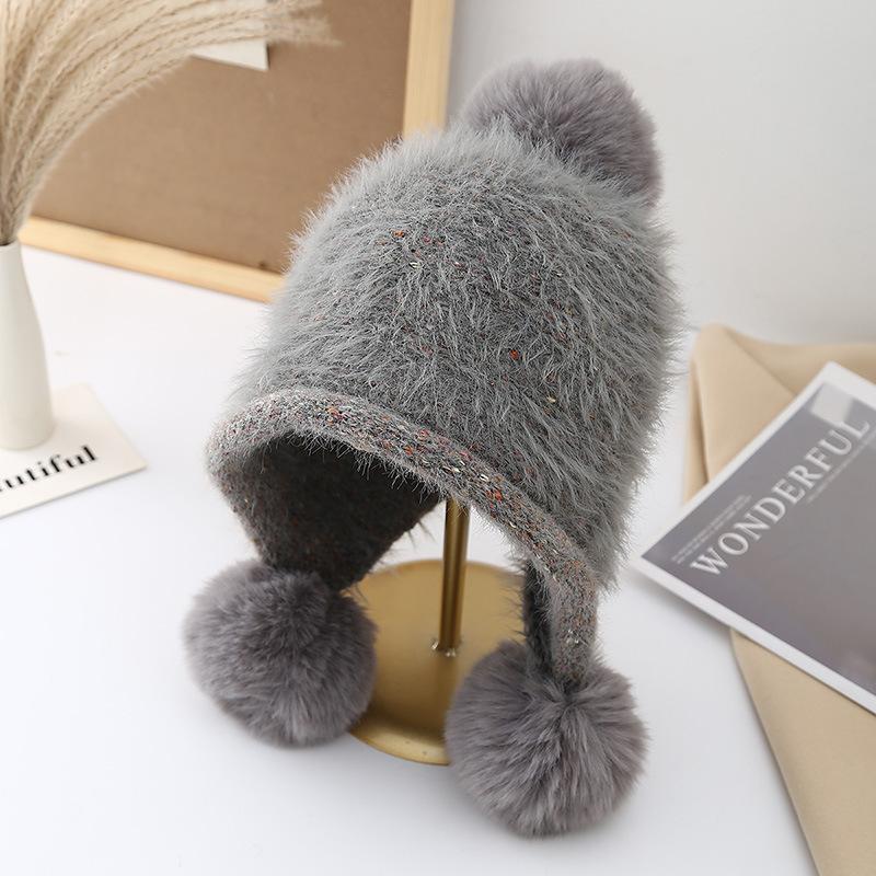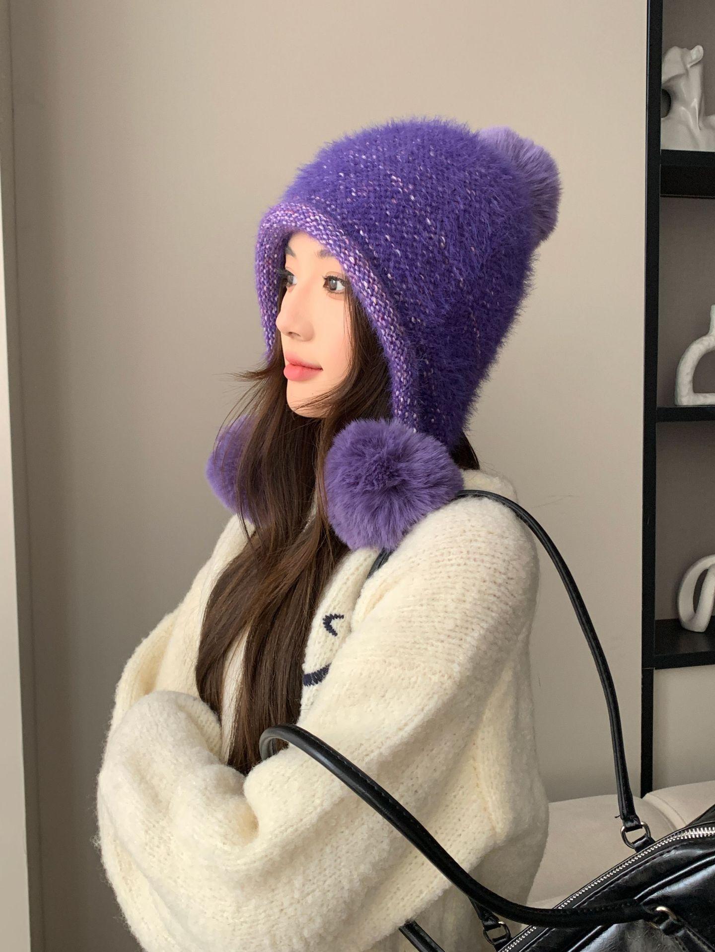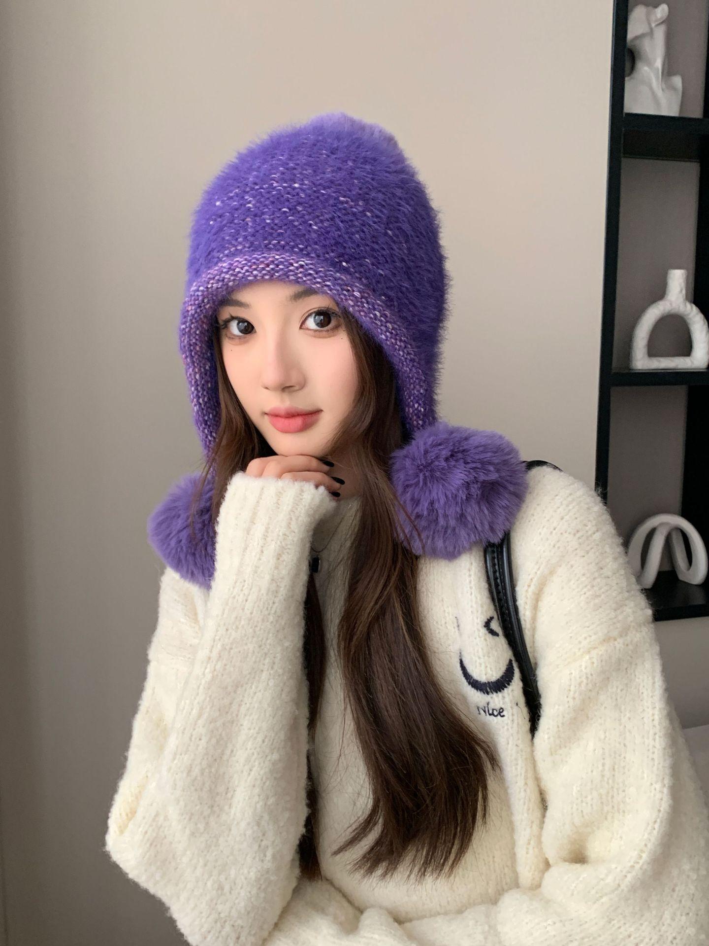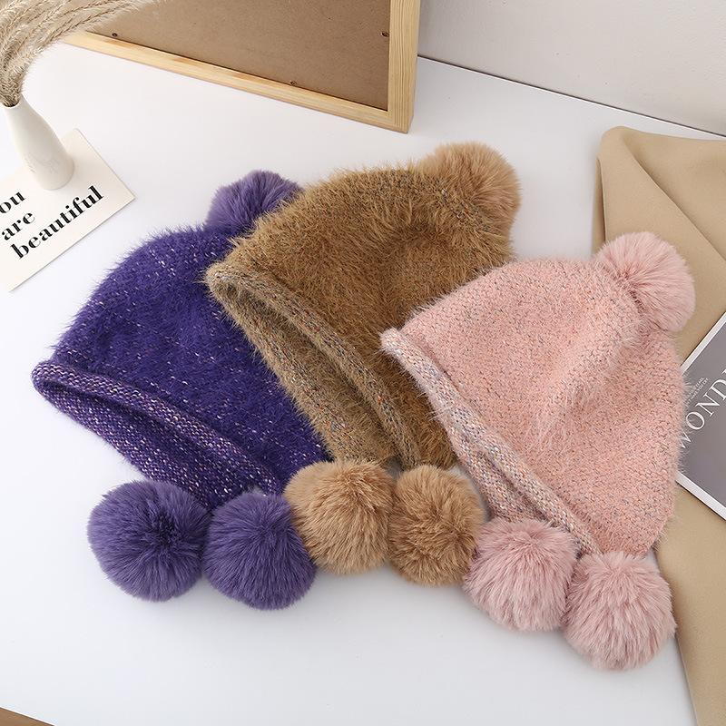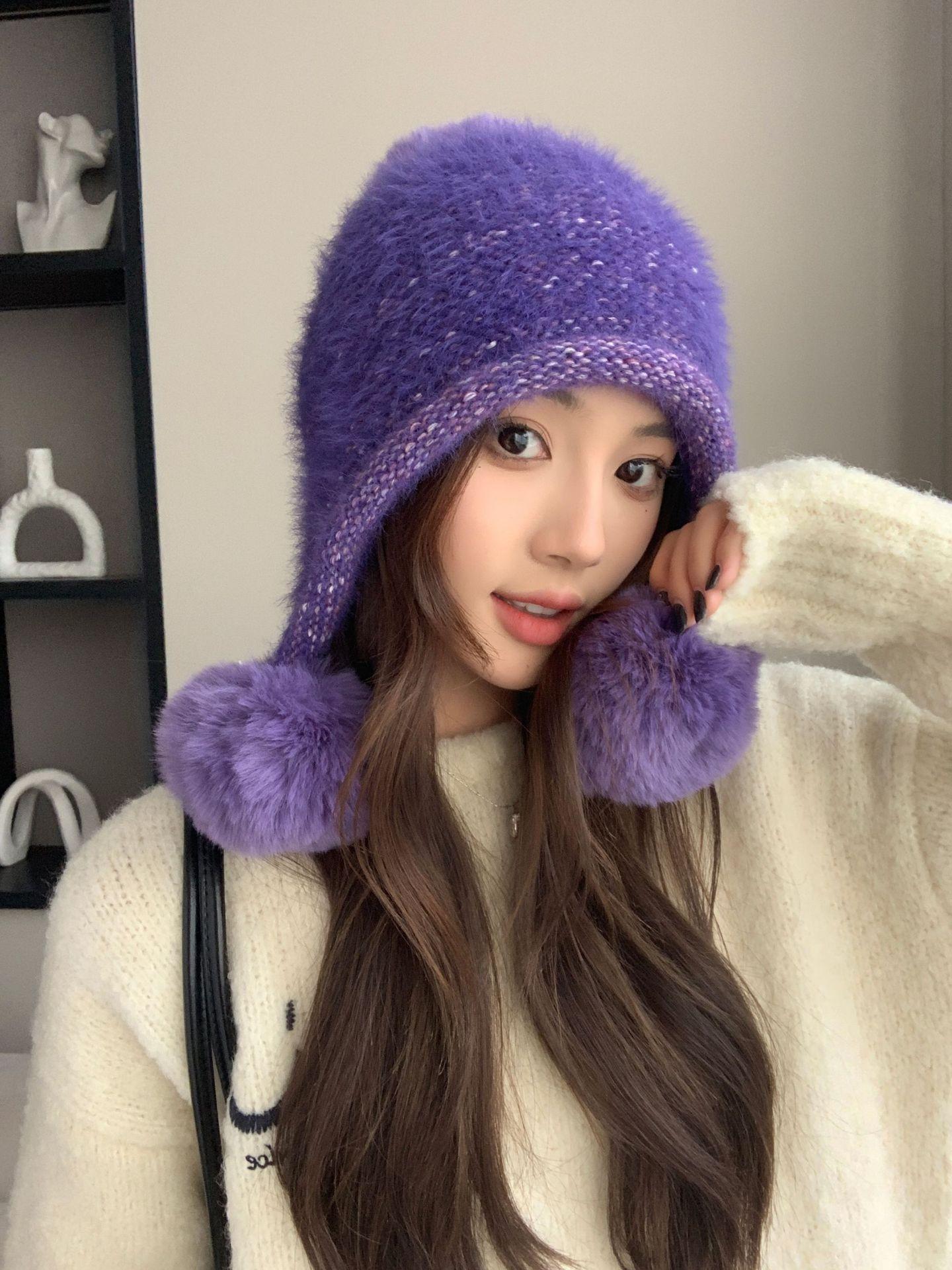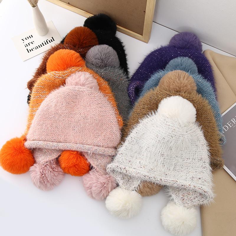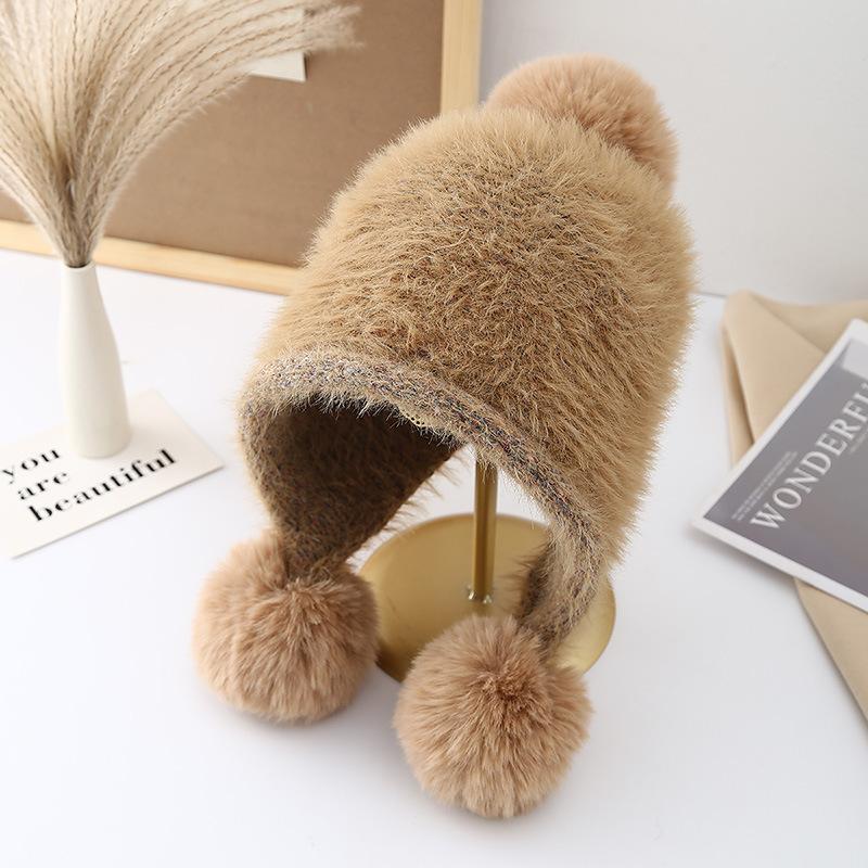 Gorro de invierno 2024 para mujer, cálido gorro de punto con tres bolas de pelo, estilo coreano, protección para los oídos a prueba de frío, gorro de lana que combina con todo, moderno