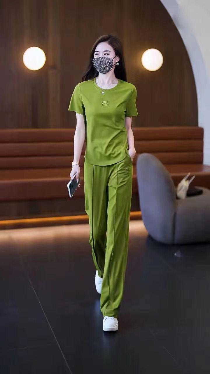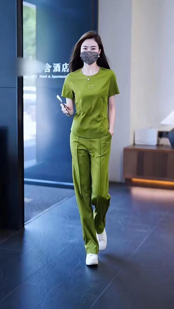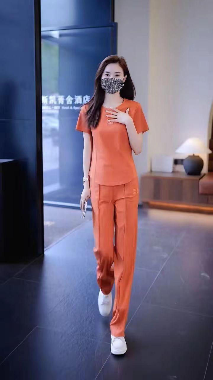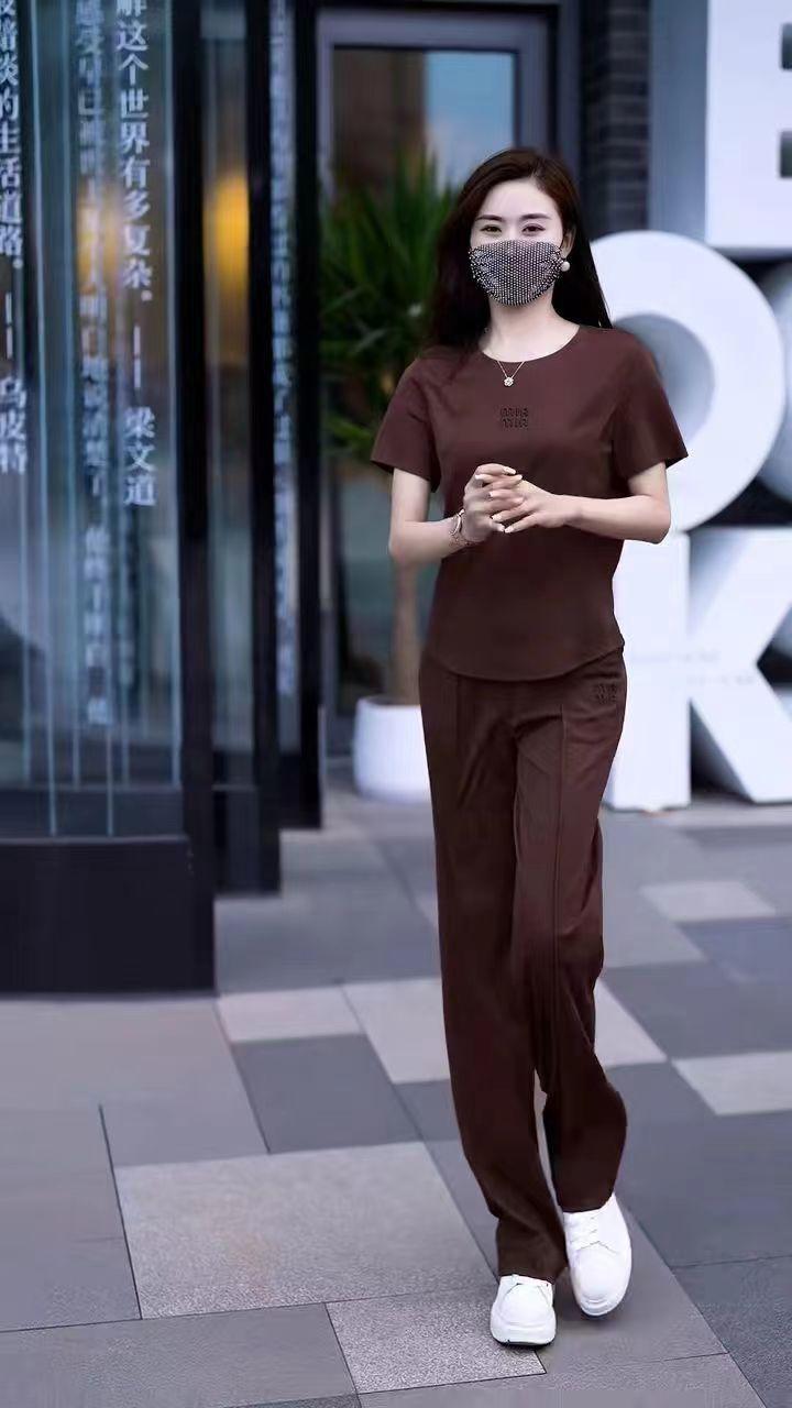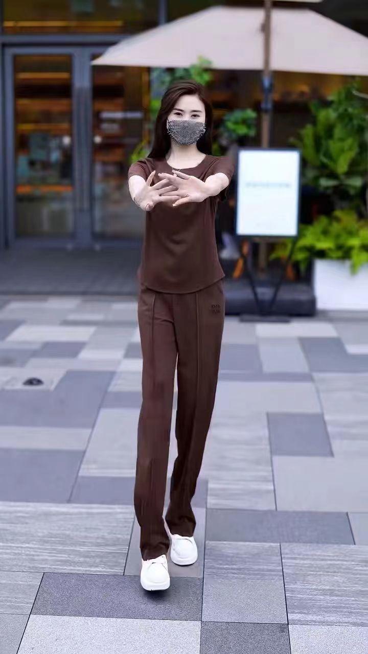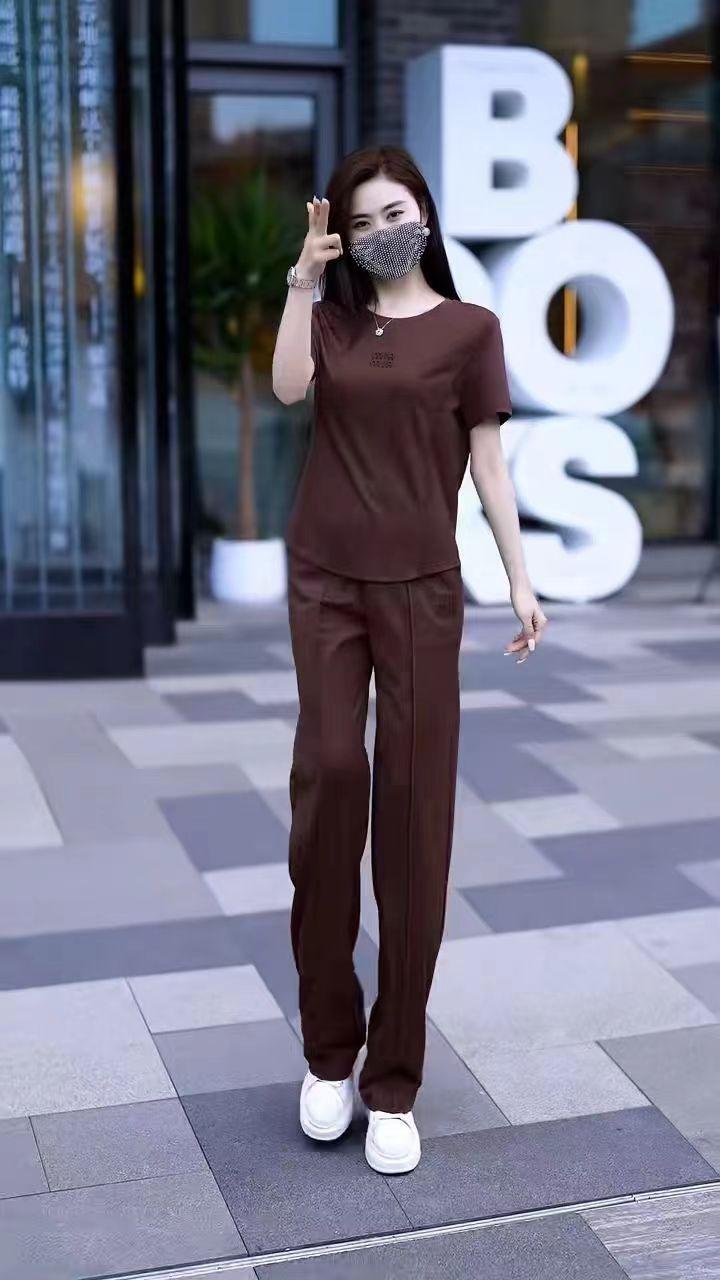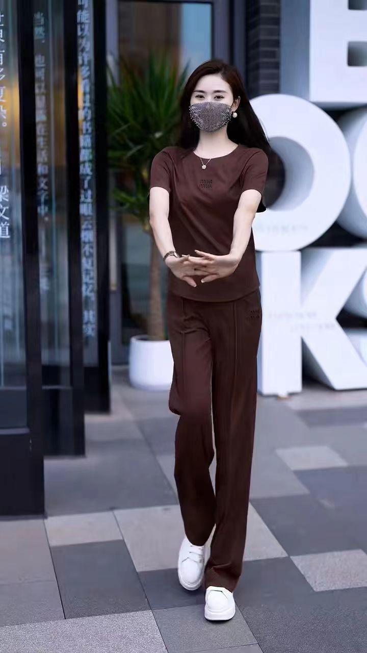 Conjunto deportivo de dos piezas con cuello redondo explosivo para mujer, nuevo conjunto de moda, pantalones rectos holgados y adelgazantes.