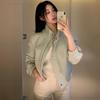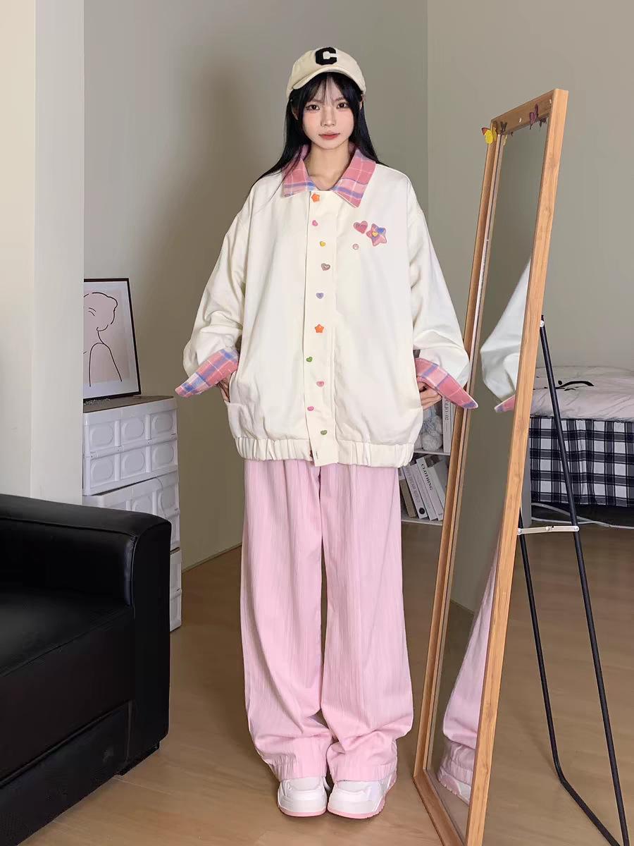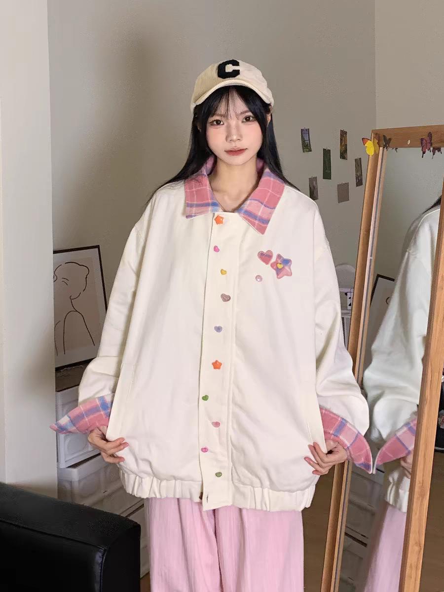 Chaqueta de Béisbol Coreana a Cuadros con Solapa en Bloque de Color Dulce para Mujer Diseño de Primavera y Otoño Chaqueta Versátil Top para Personas Pequeñas