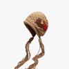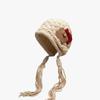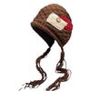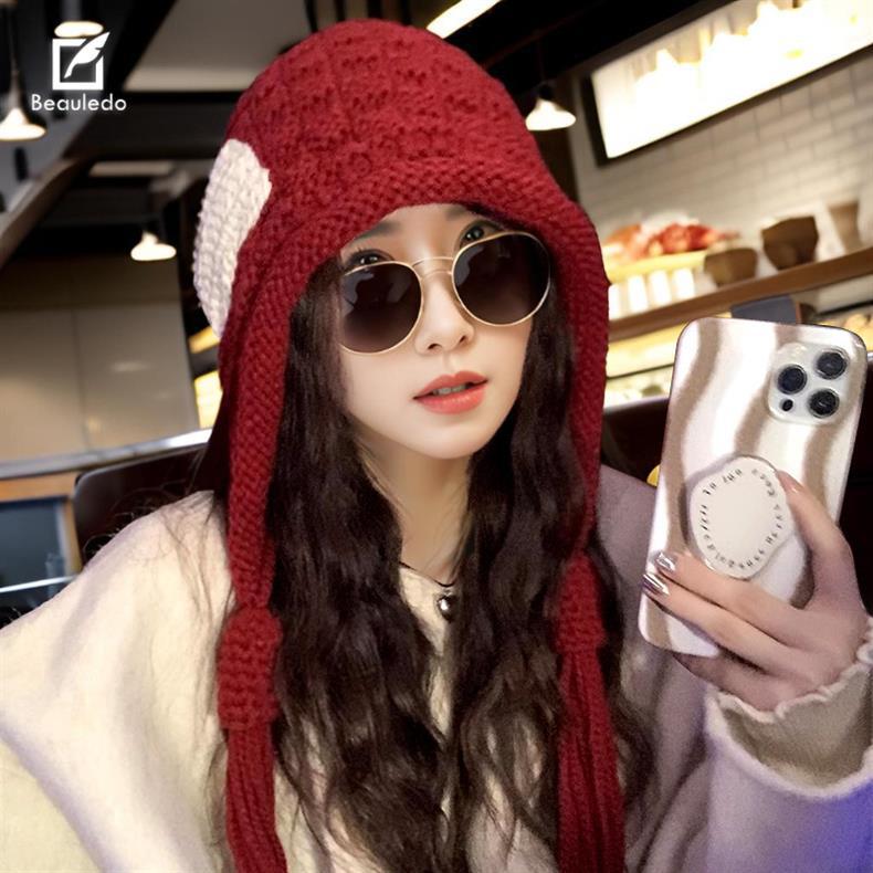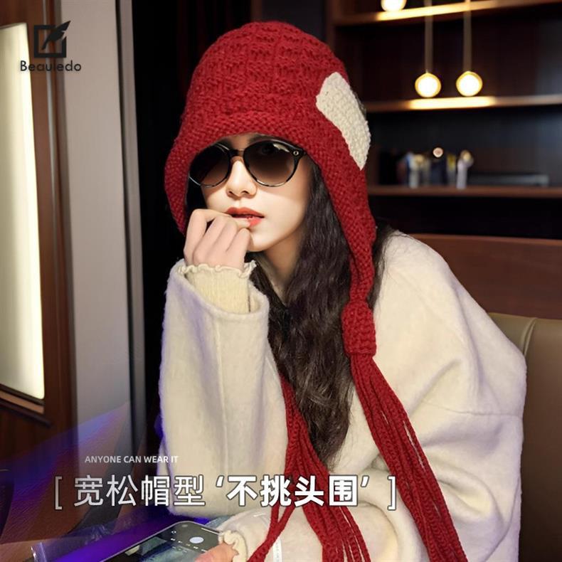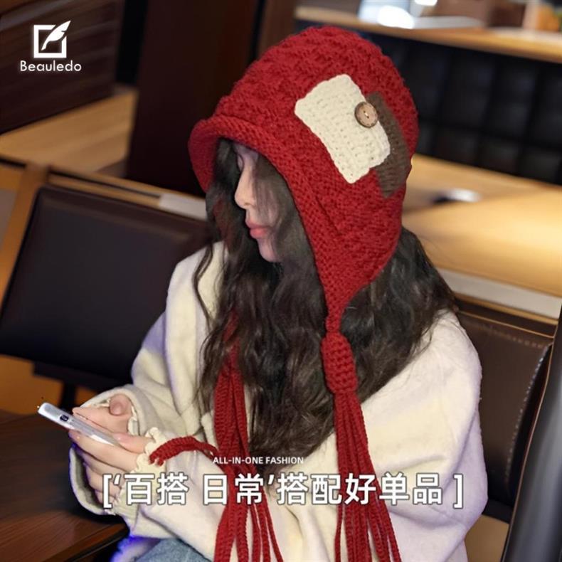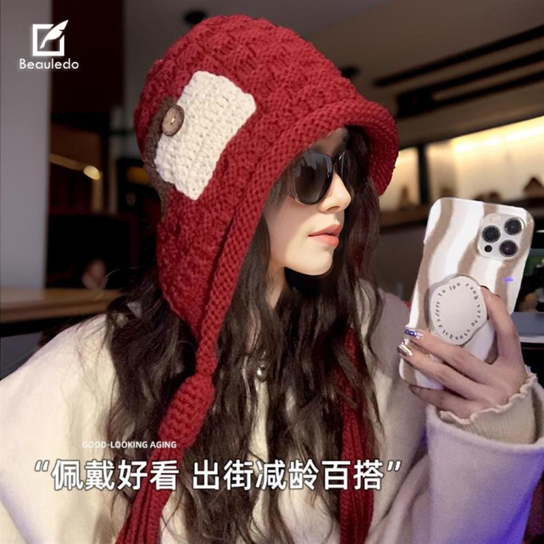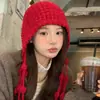 Nuevo gorro de lana roja con borlas y parche de punto para mujer, cálido gorro de punto trenzado hecho a mano para otoño e invierno.