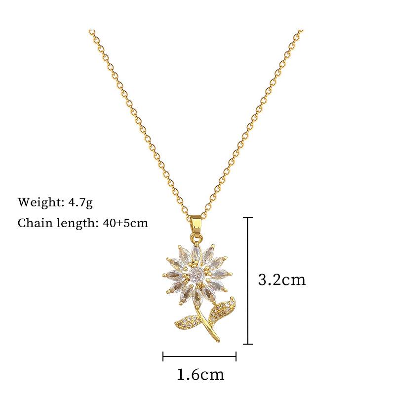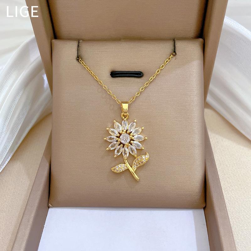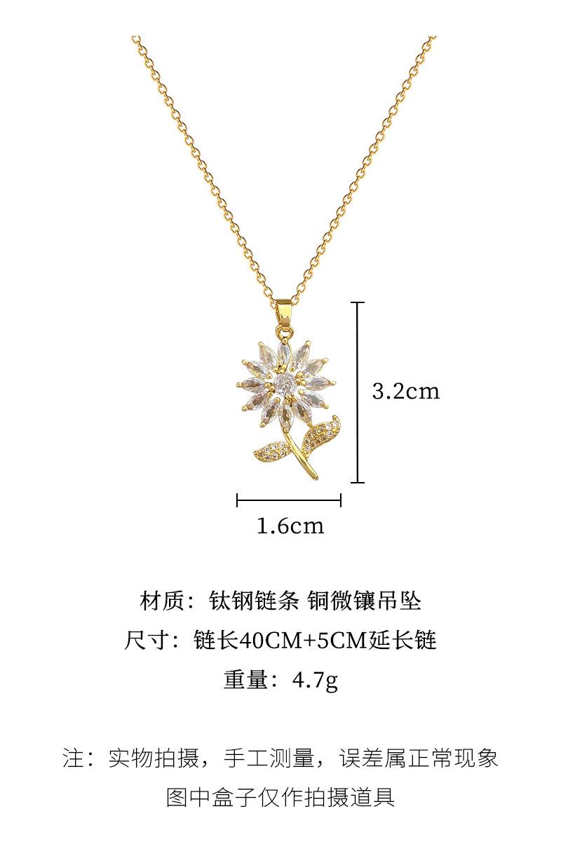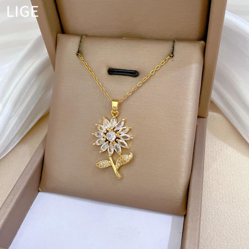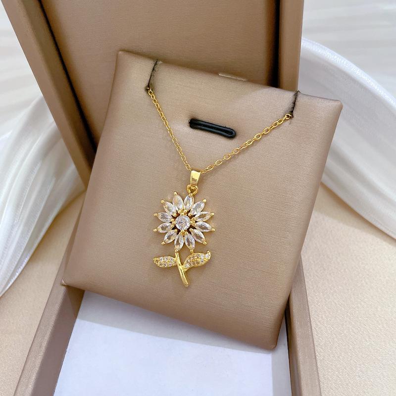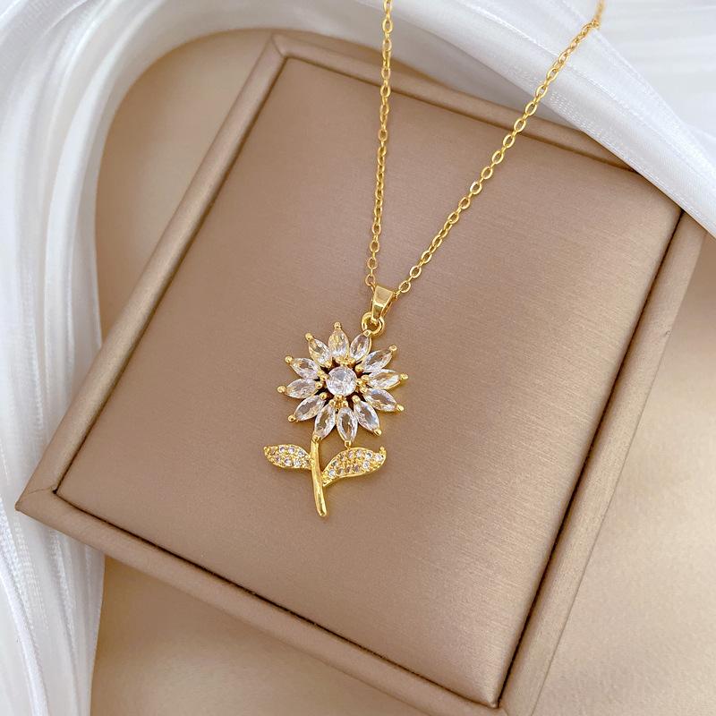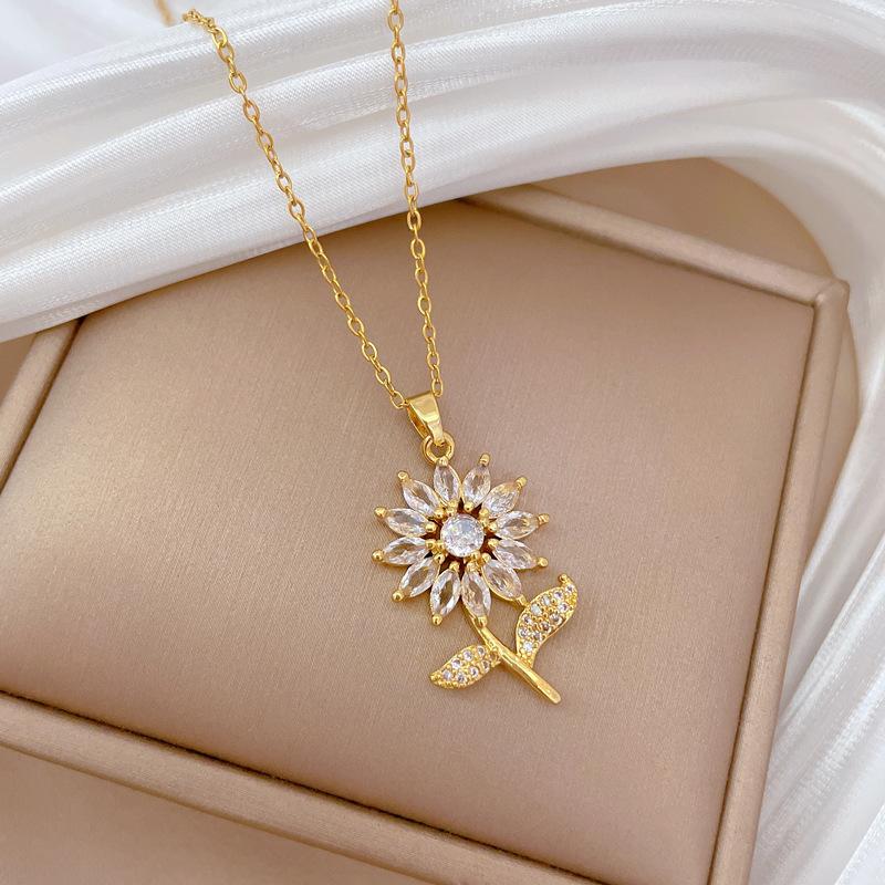 [Acero de titanio] Collar elegante y lujoso con diseño de hojas de flores y circonitas para mujer, cadena de clavícula combinable, cadena de acero de titanio.