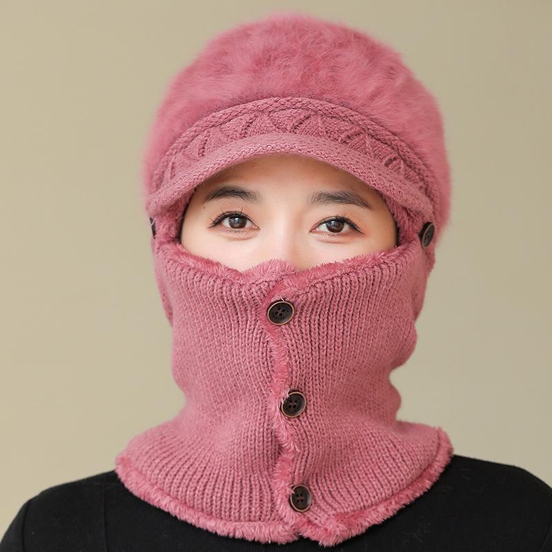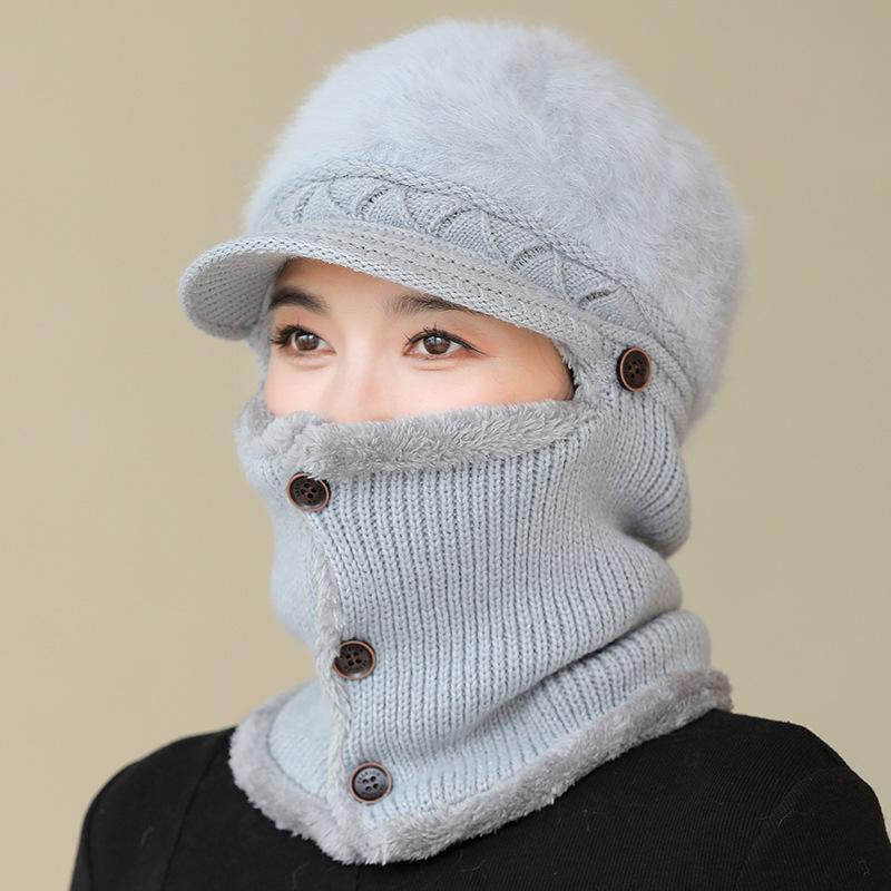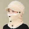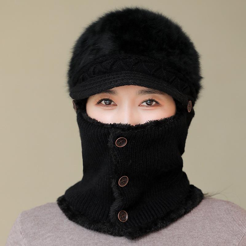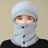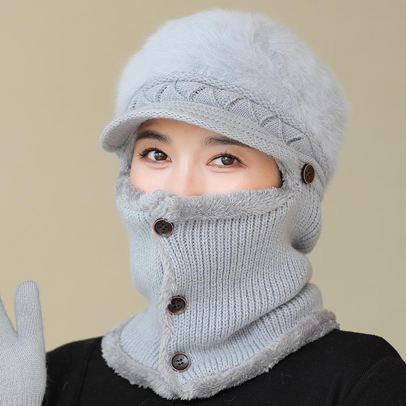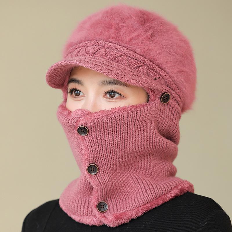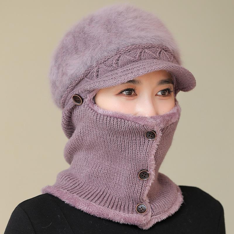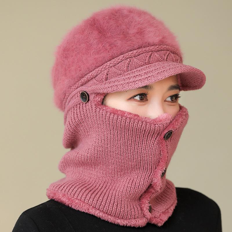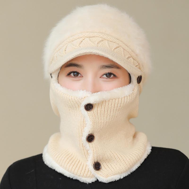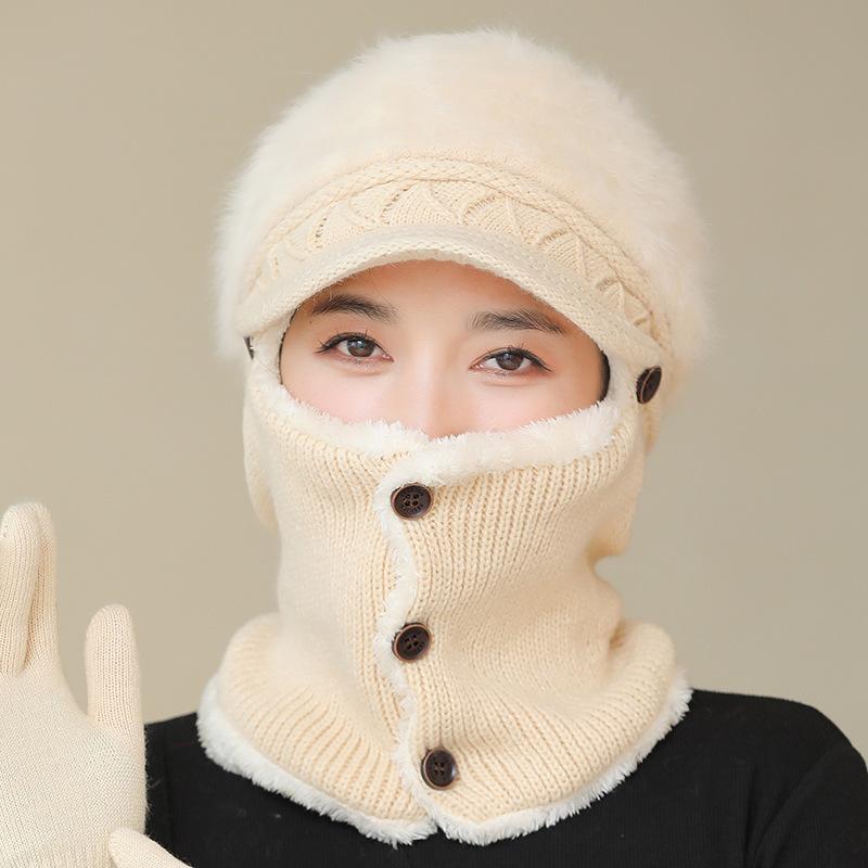 Gorro de Punto para Invierno para Montar al Aire Libre, Máscara para Orejas, Cuello, Gorro Integrado, Moda, Color Sólido, Botón, Lengua de Pato, Gorro de Lana para Mujer