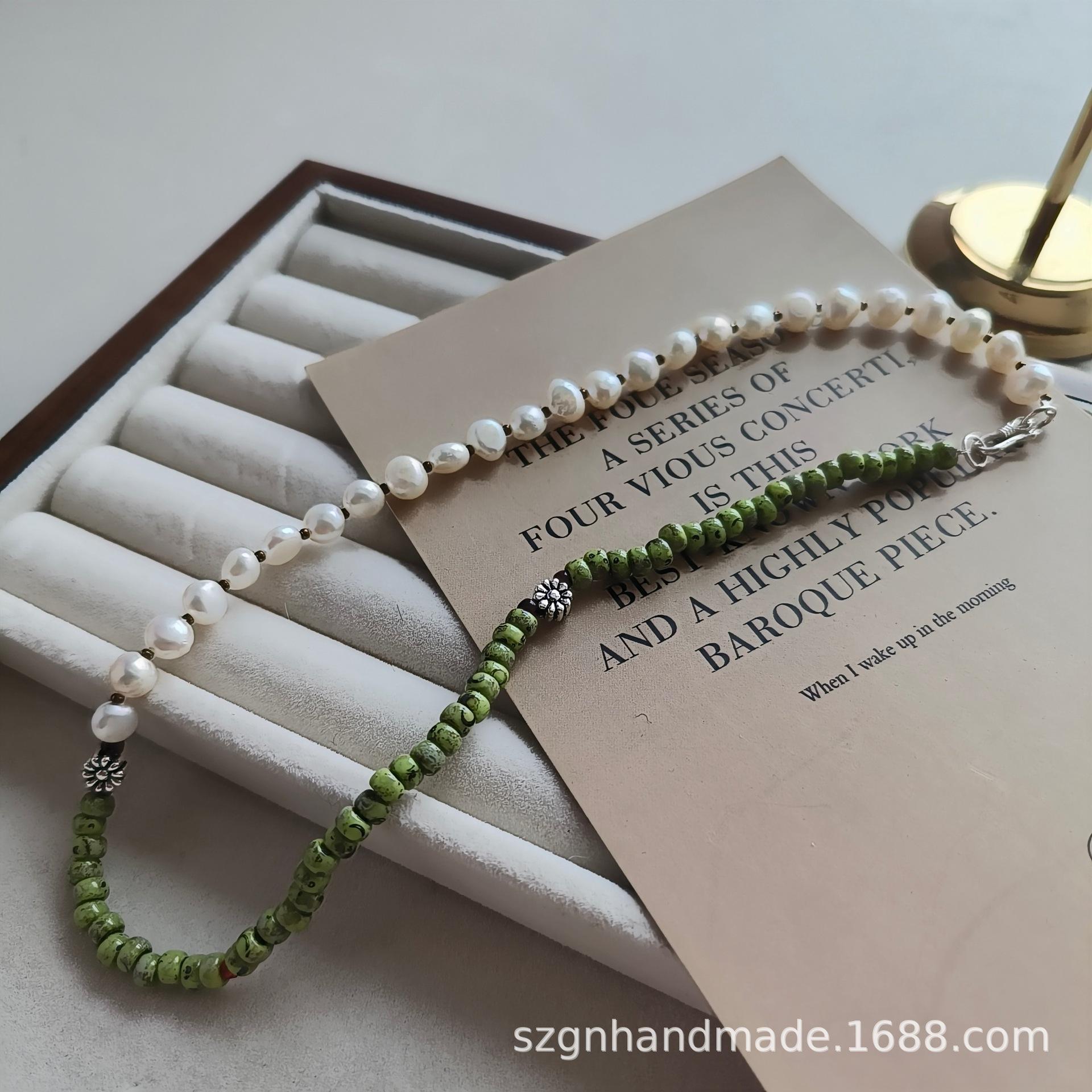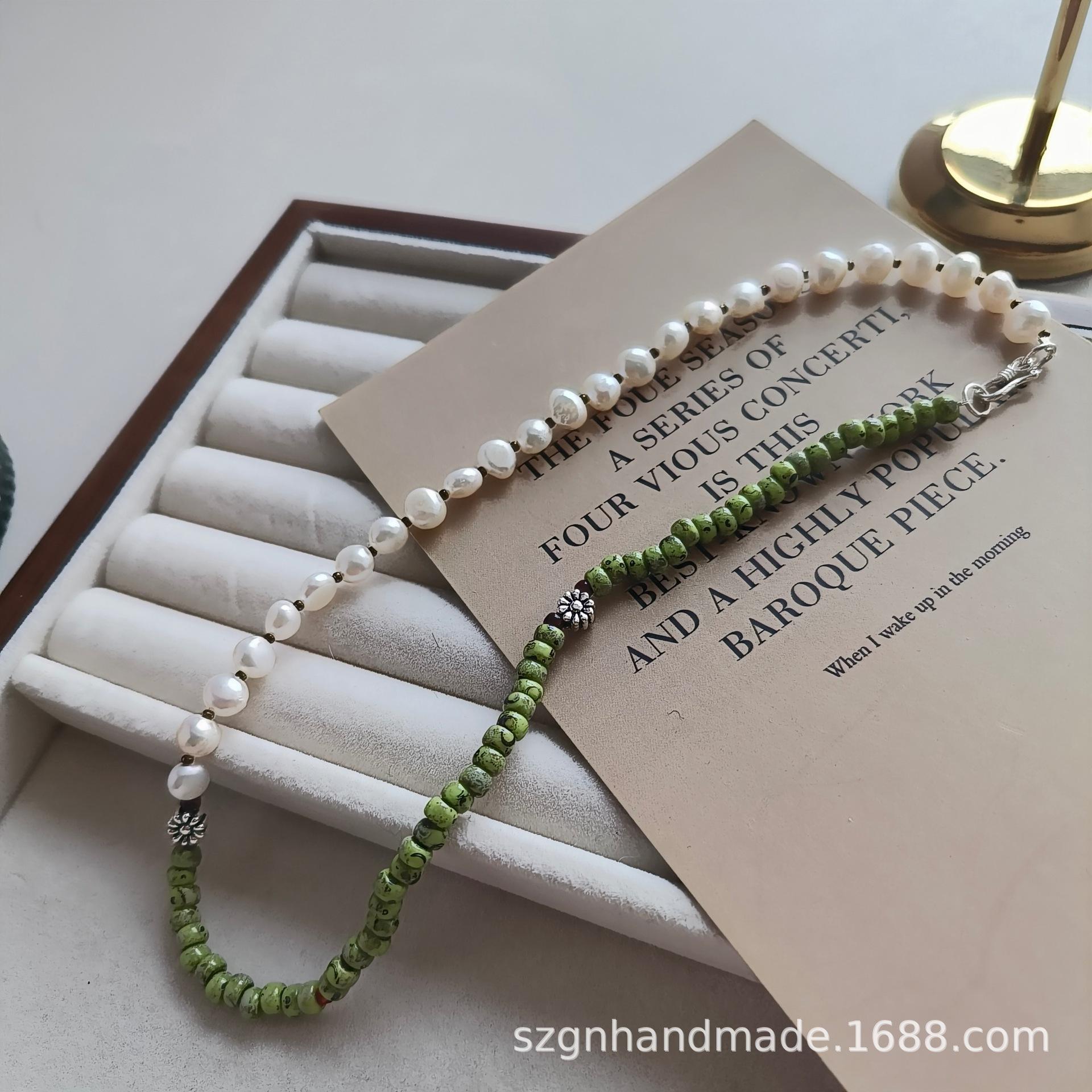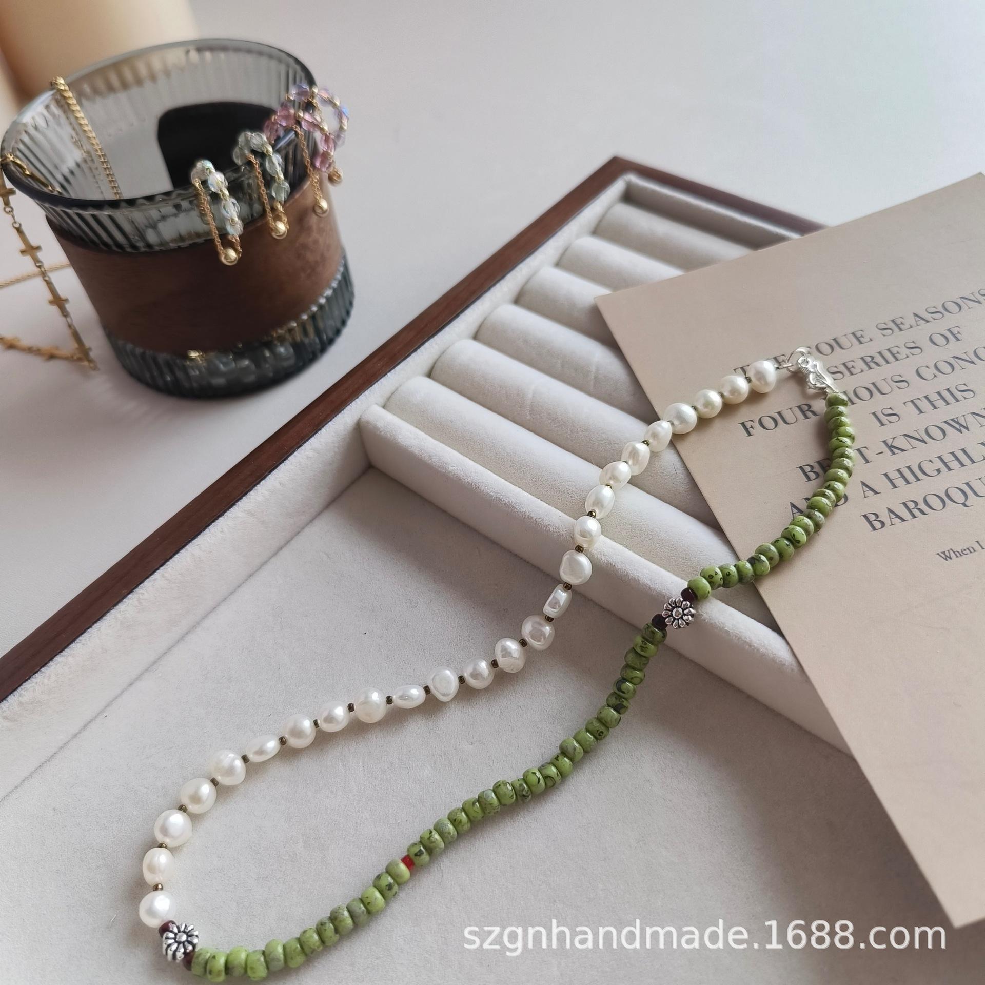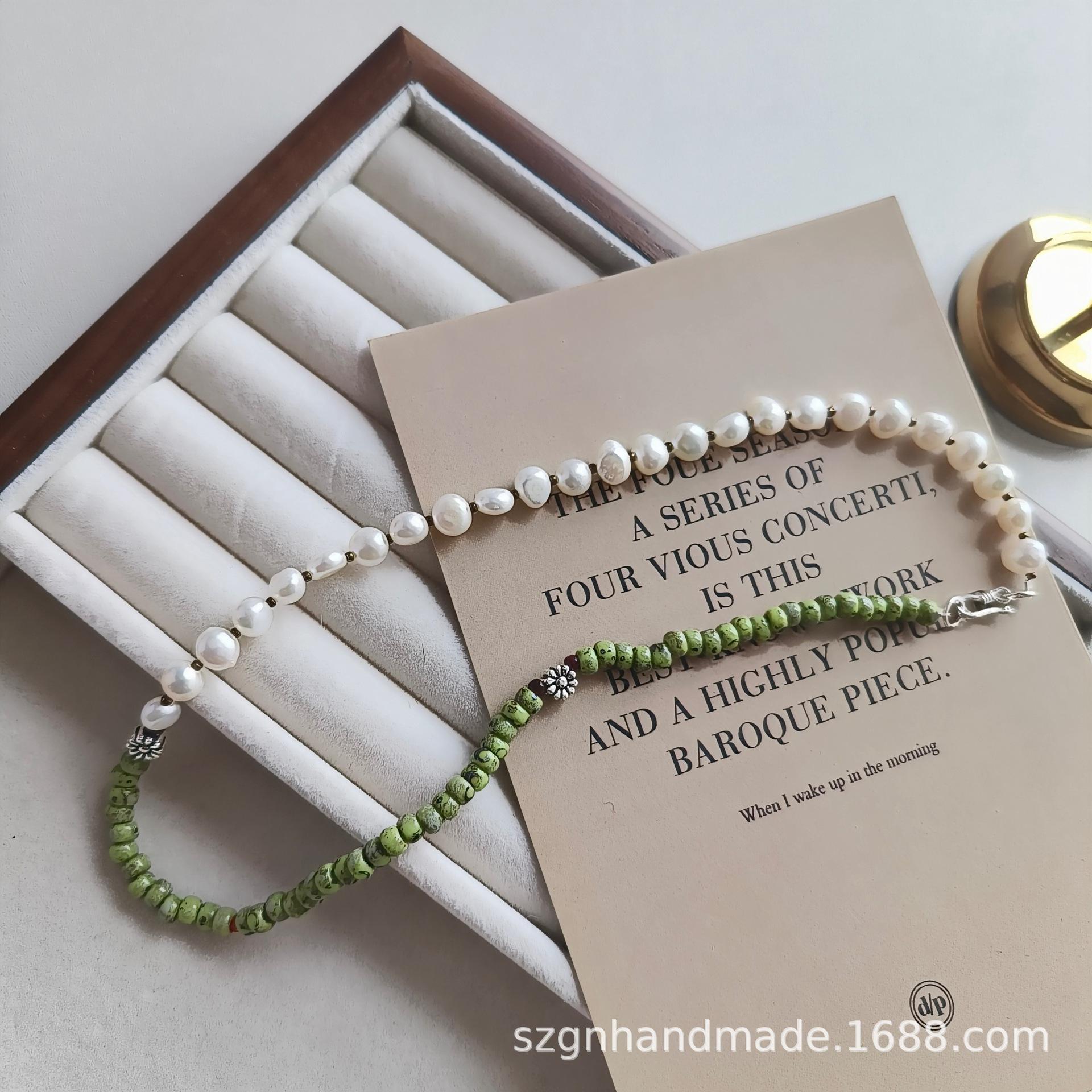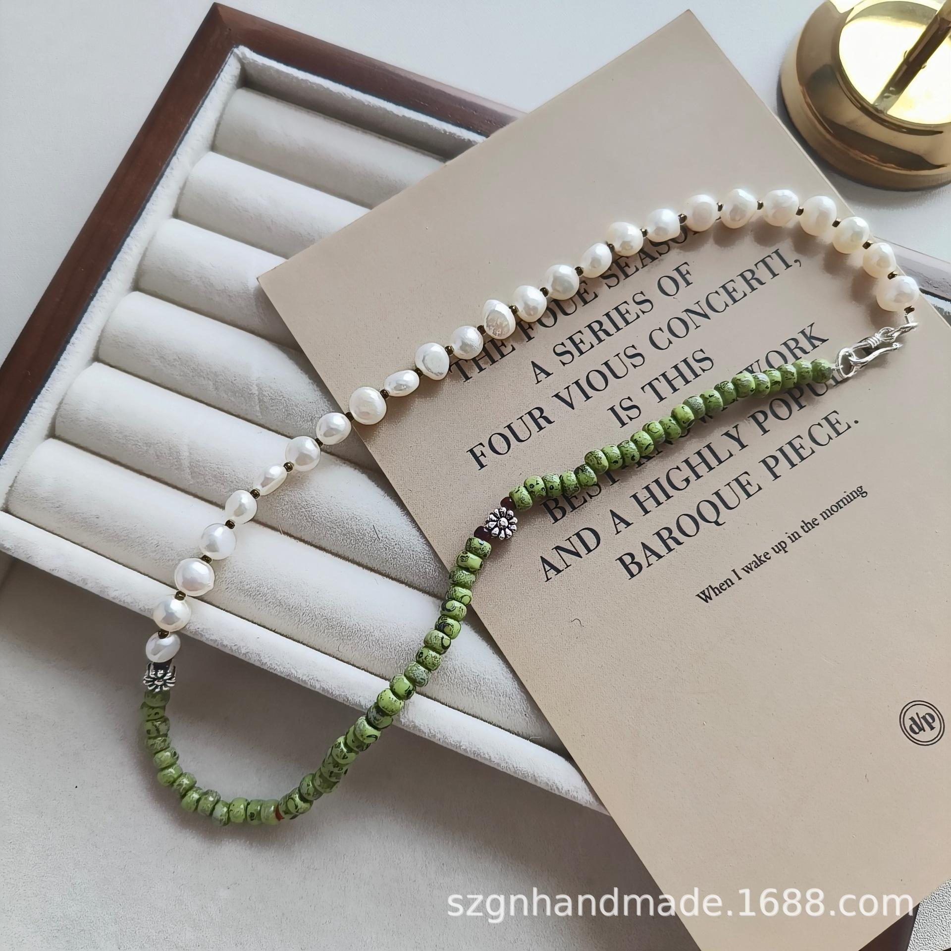 Collar de perlas barrocas naturales estilo margarita de plata 925 con cuentas antiguas verdes retro japonesas, diseño de nicho femenino estilo ins
