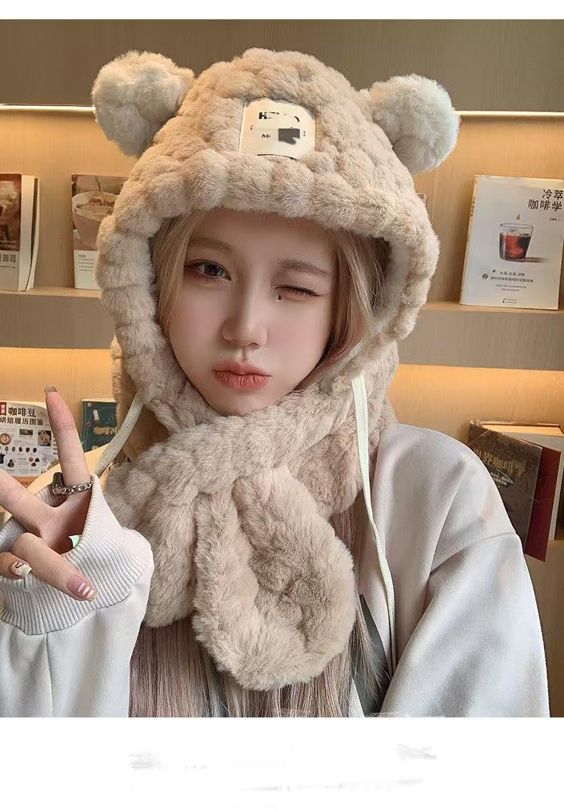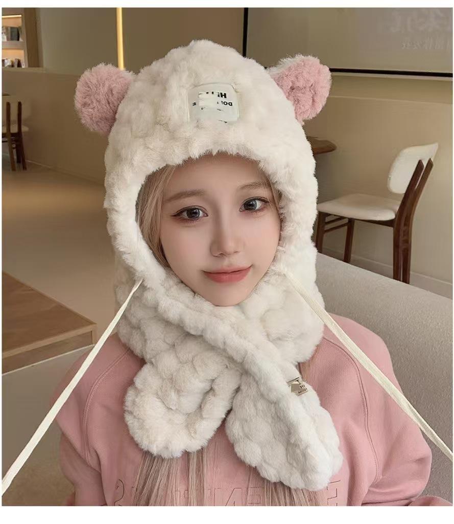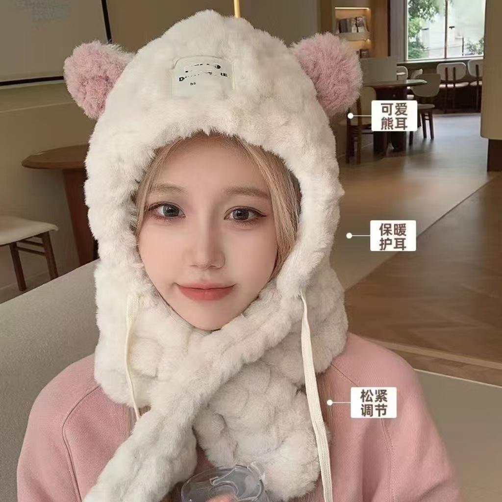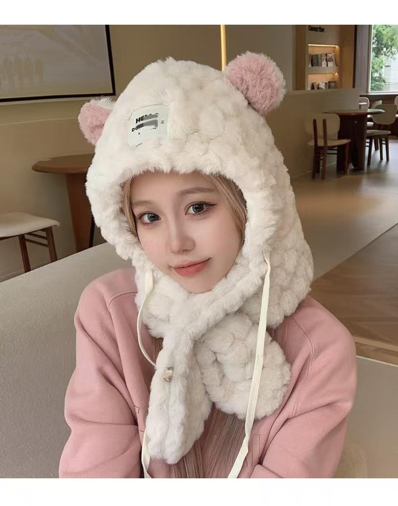 Gorro de peluche con orejas de oso para mujer, de invierno, grueso, con forro polar, bufanda, de una pieza, cálido, para ciclismo, Lei Feng