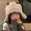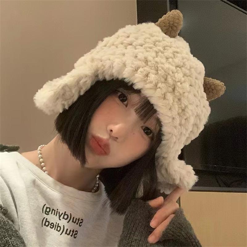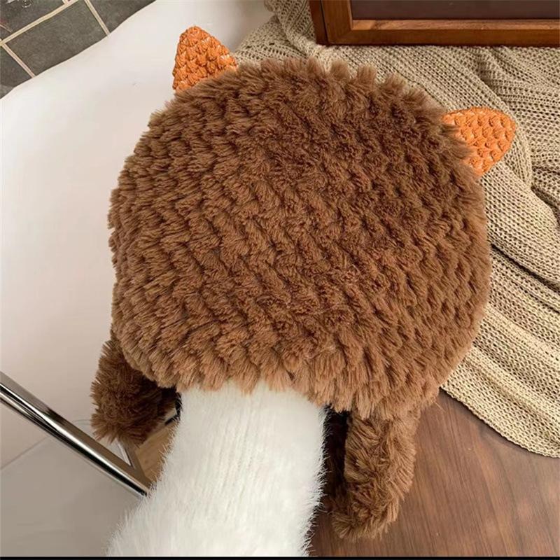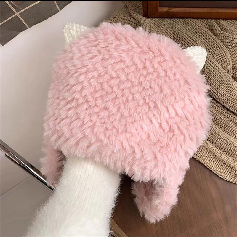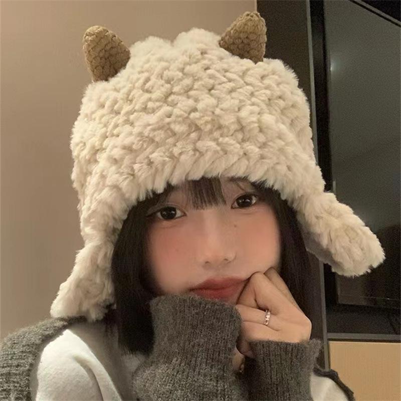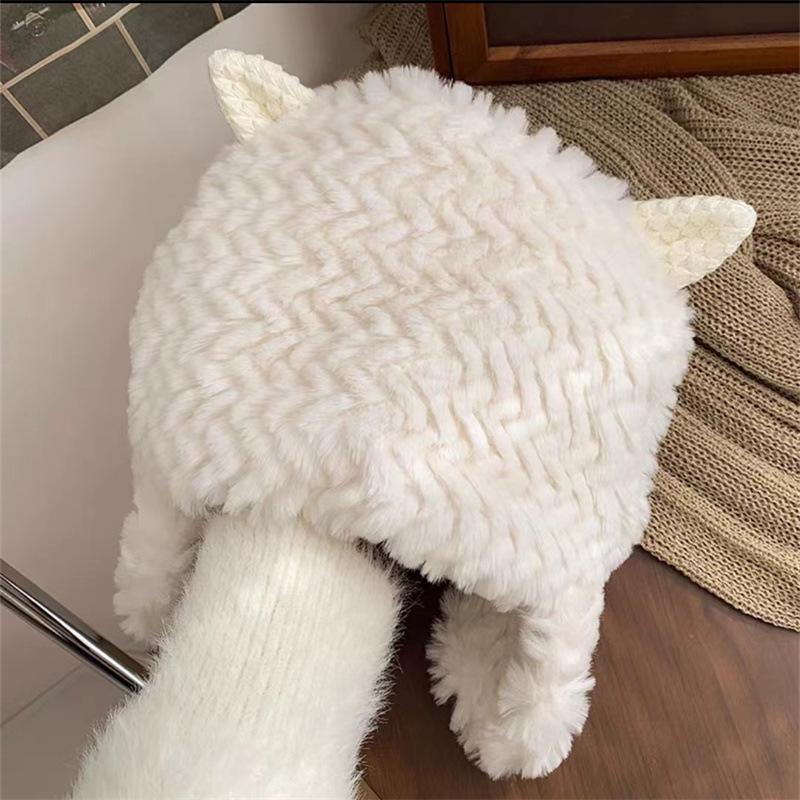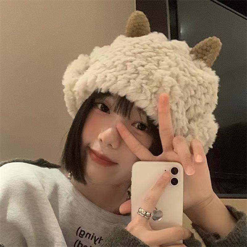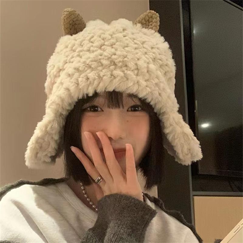 Sombrero de Cordero para Mujer Otoño e Invierno Estilo Coreano Lindo Felpa Sombrero Lei Feng Que Muestra la Cara Pequeño Cálido Grueso Protección para las Orejas Sombrero Cabeza Grande