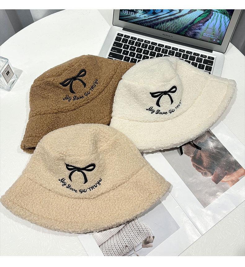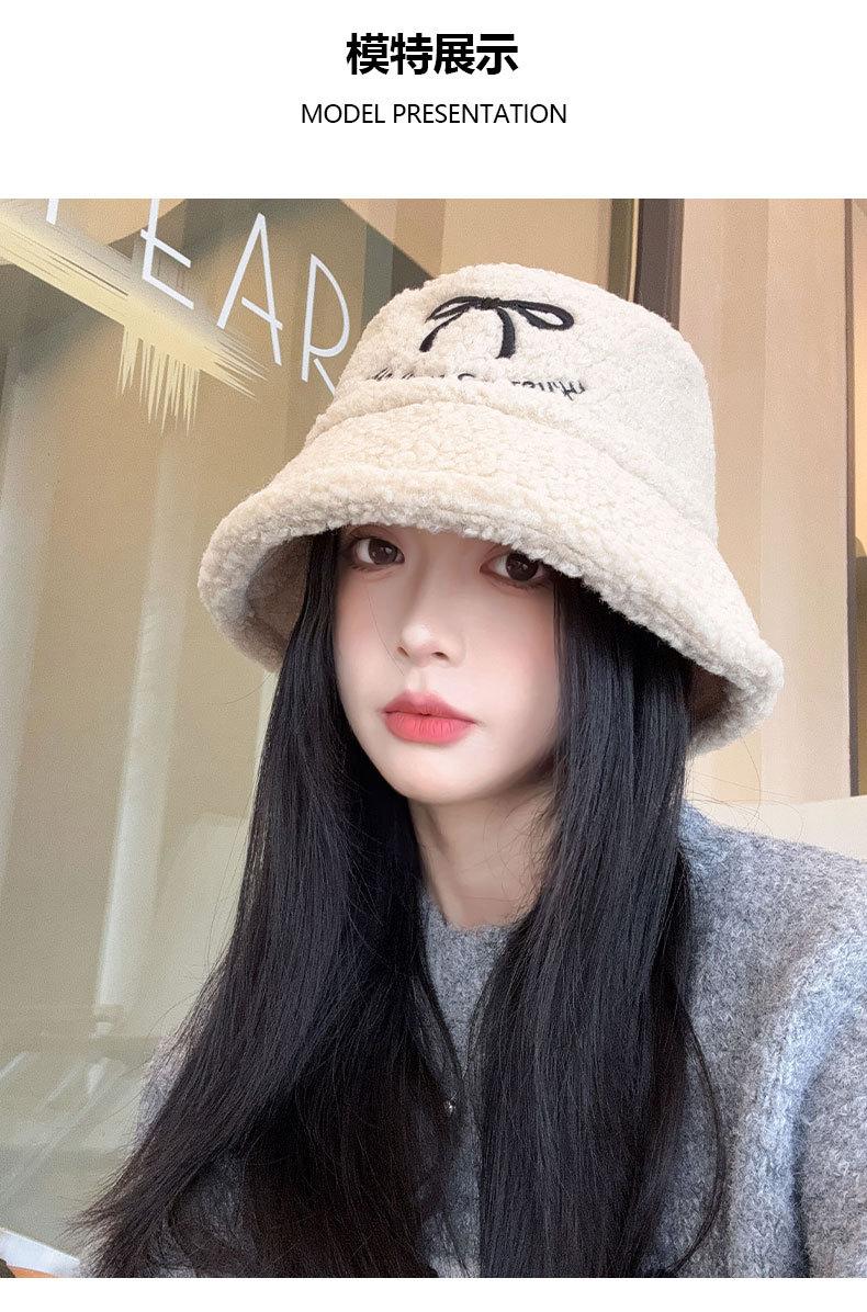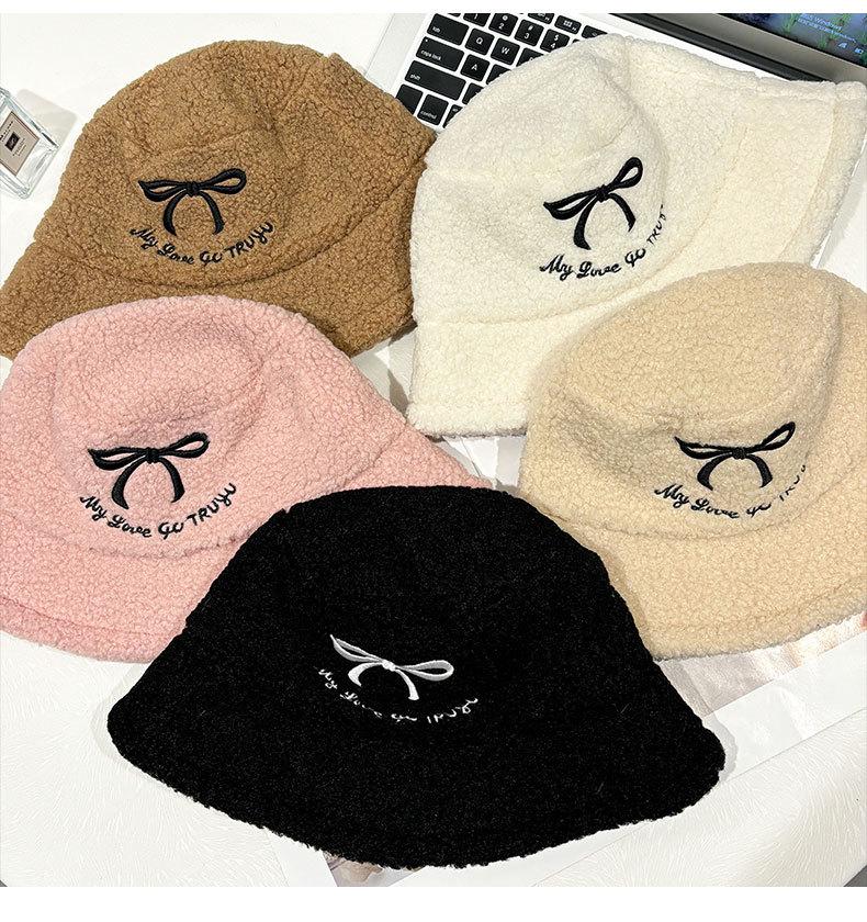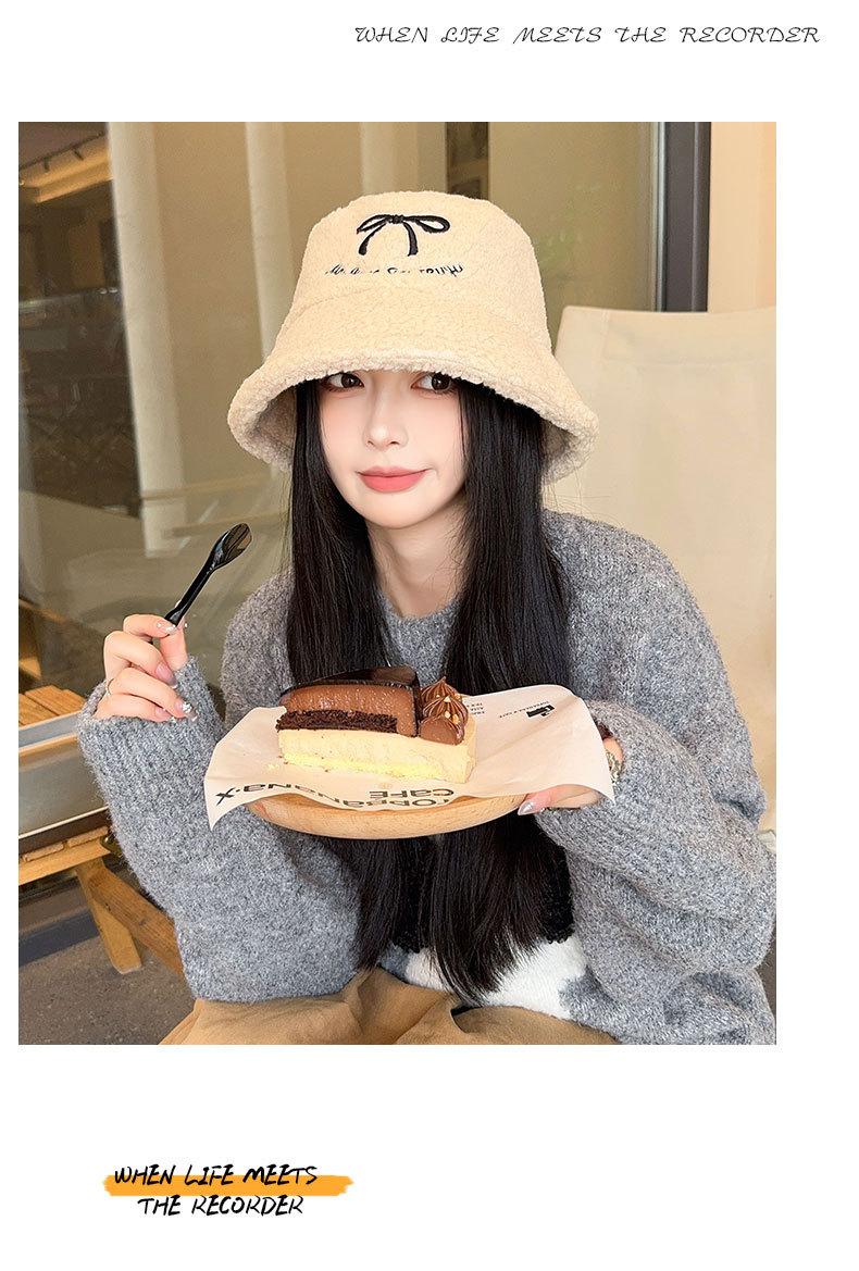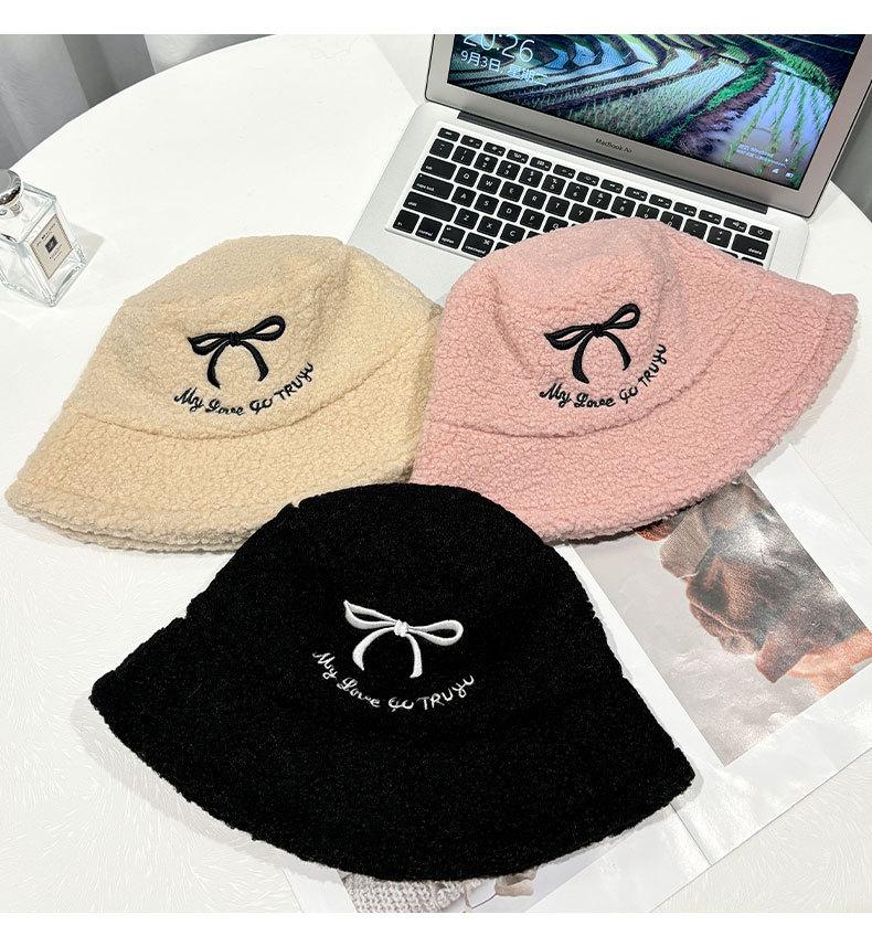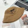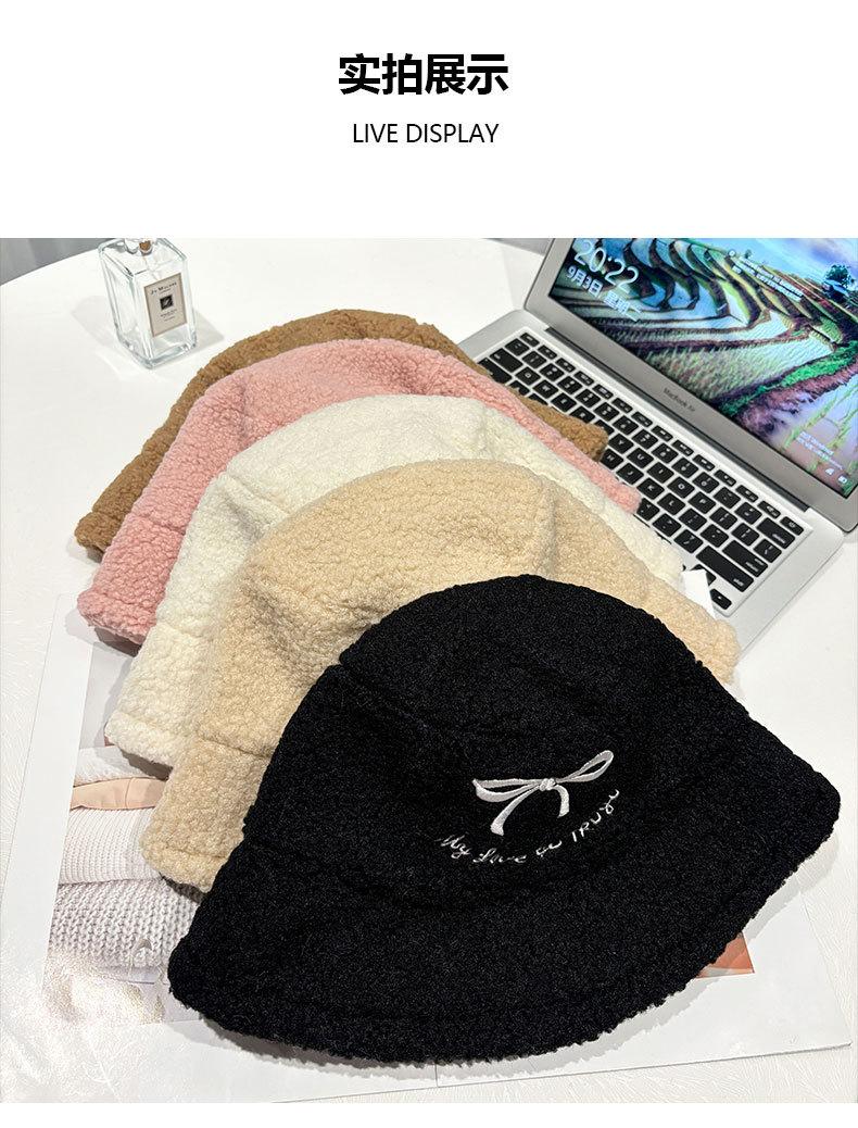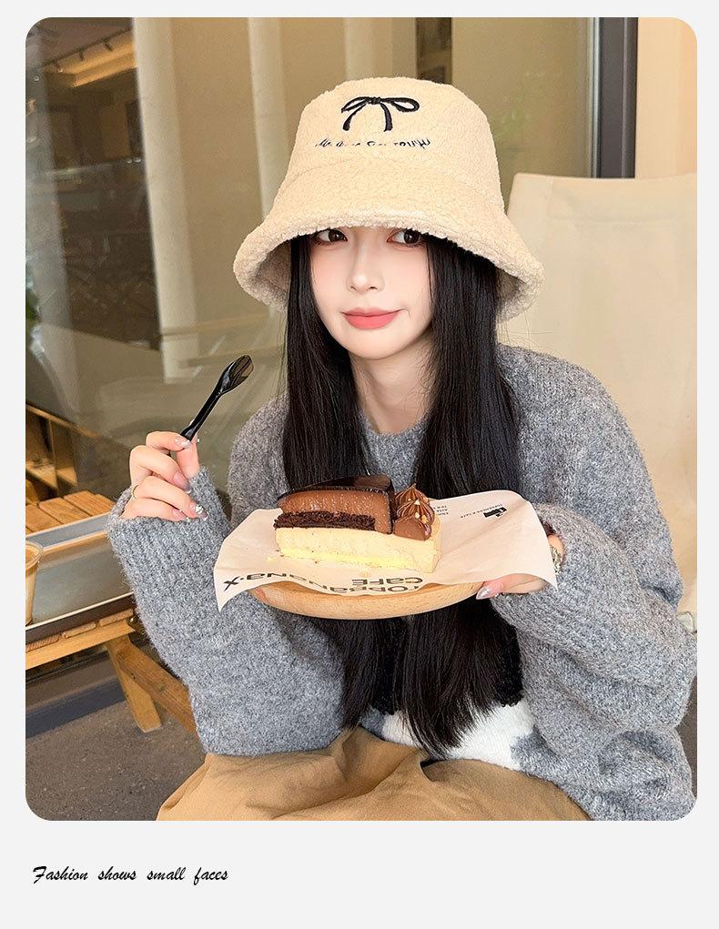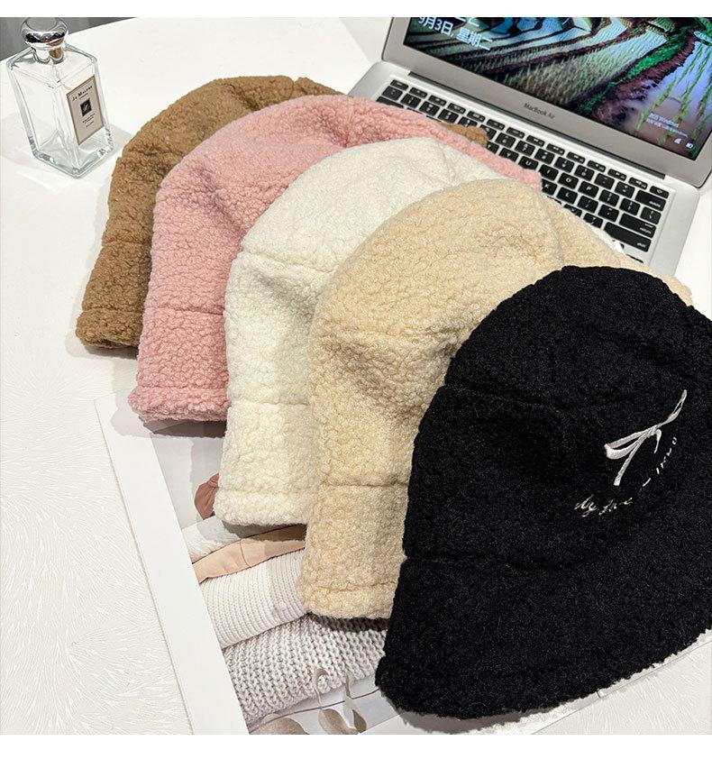 Sombrero de pescador estilo coreano para mujer, con lazo bordado de pelo de cordero, cálido, para otoño e invierno, nuevo estilo, pequeño y liso.