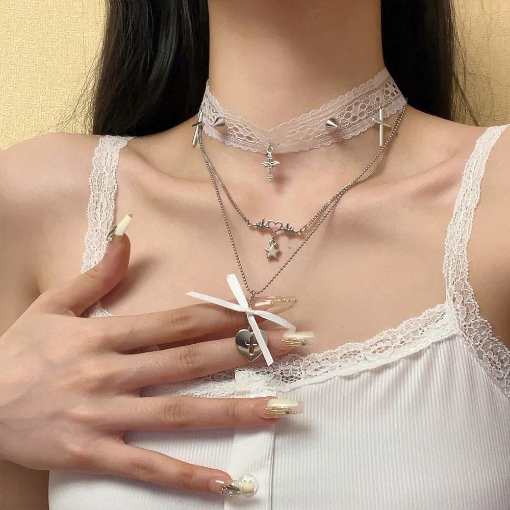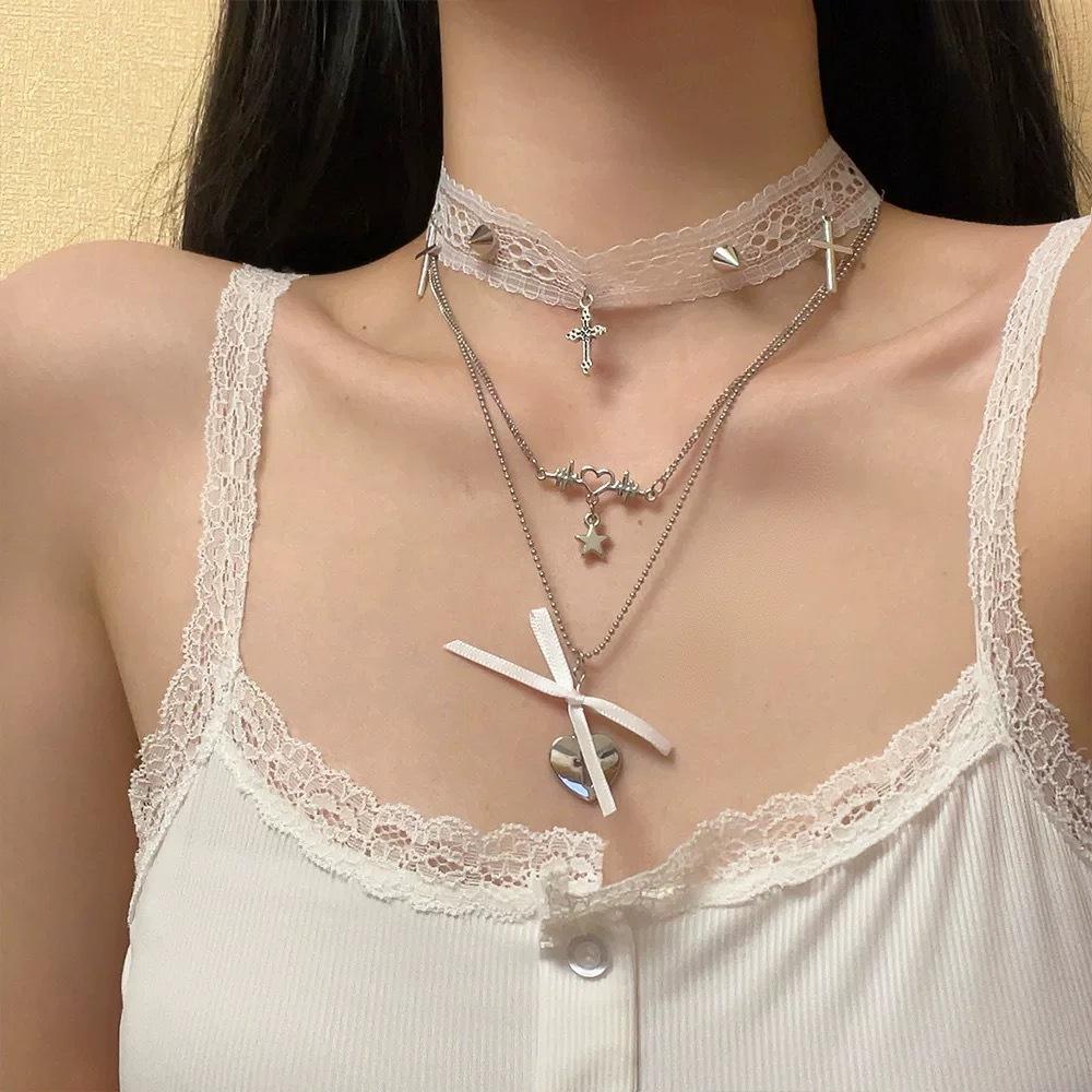 Collar multicapa con cruz de amor de encaje, collar para mujer, gargantilla, accesorios, cadena de clavícula para mujer, lujo ligero, nicho, alta gama, sentido