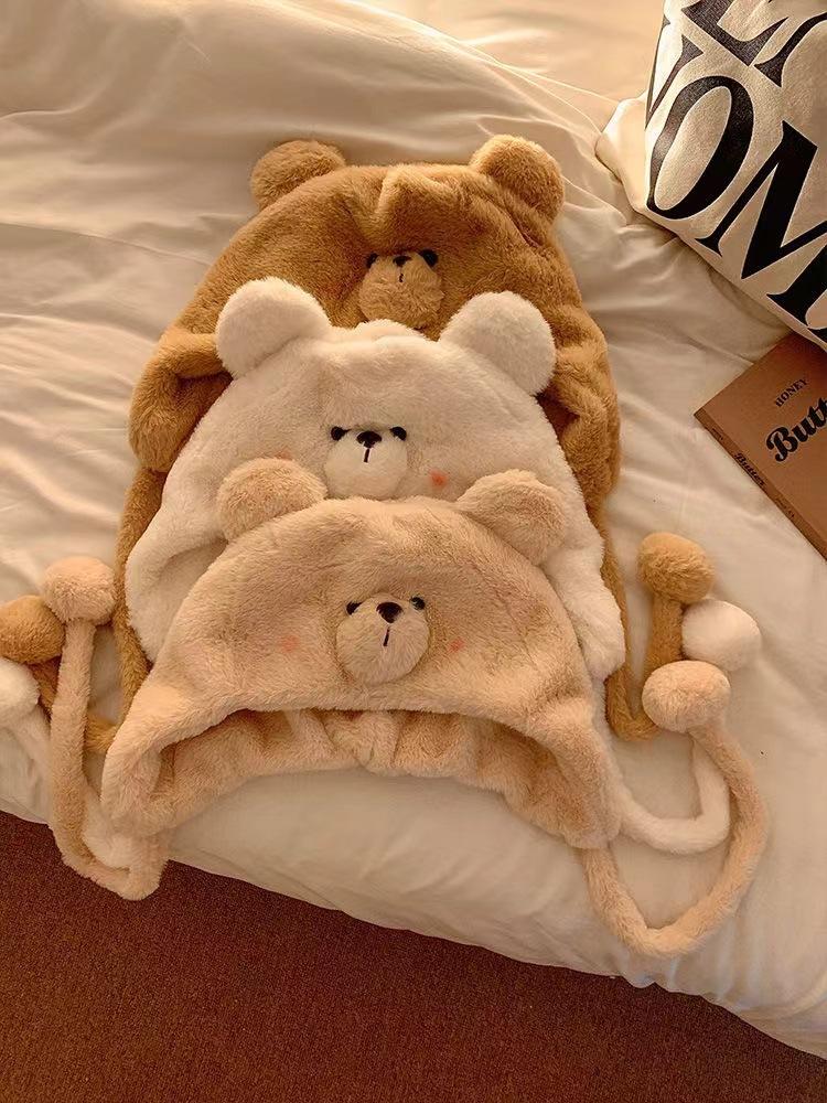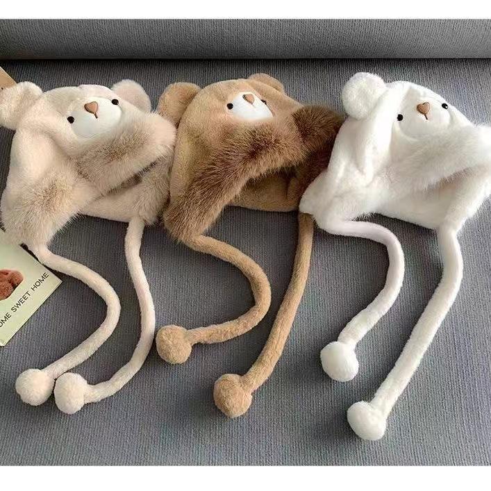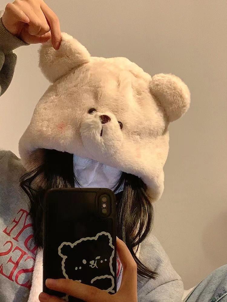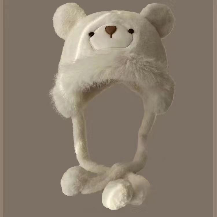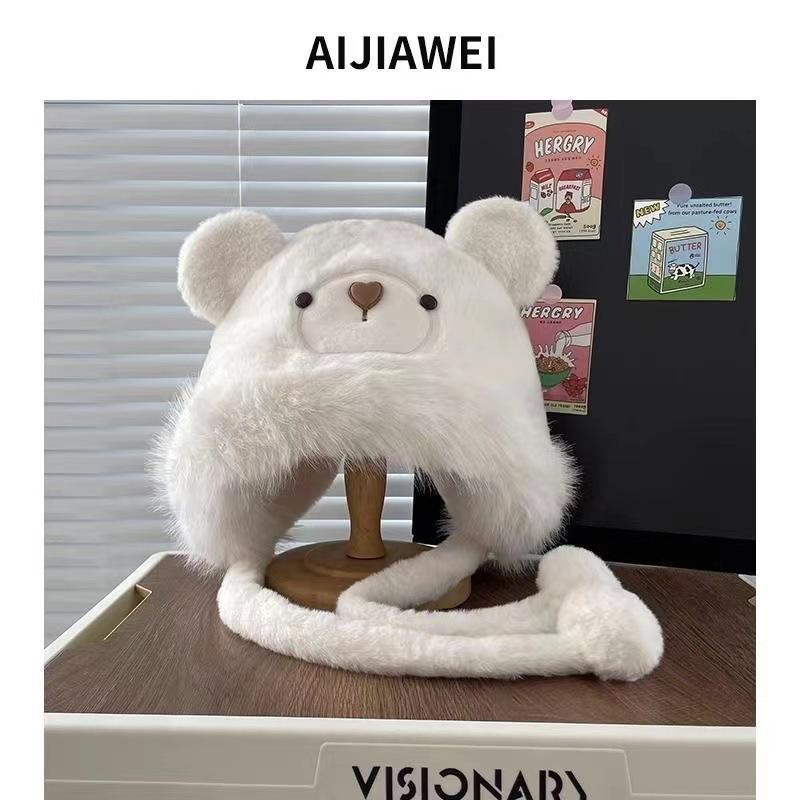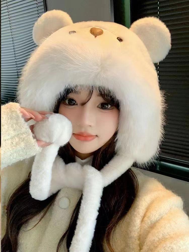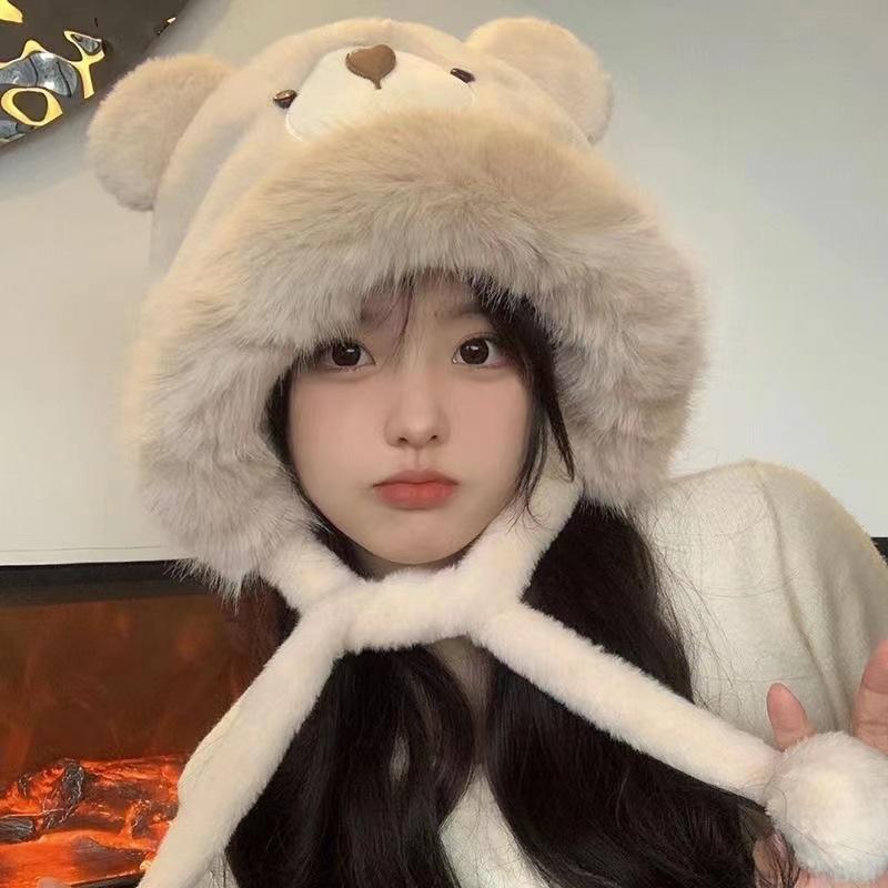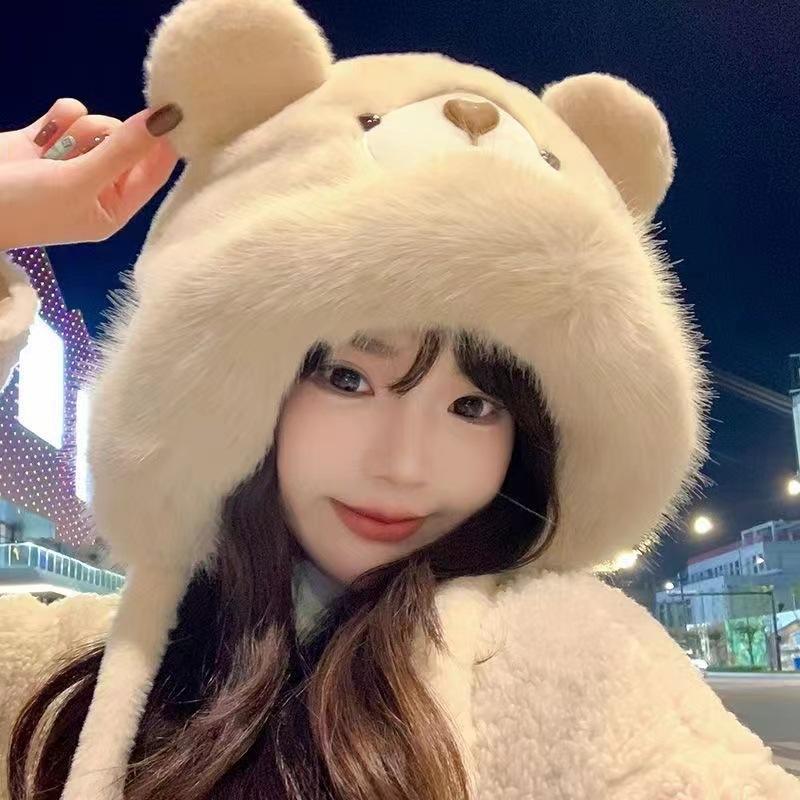 Gorro de mujer con orejas de oso de peluche, grueso y cálido, para otoño e invierno, con protección para los oídos, bonito gorro Lei Feng para ciclismo.