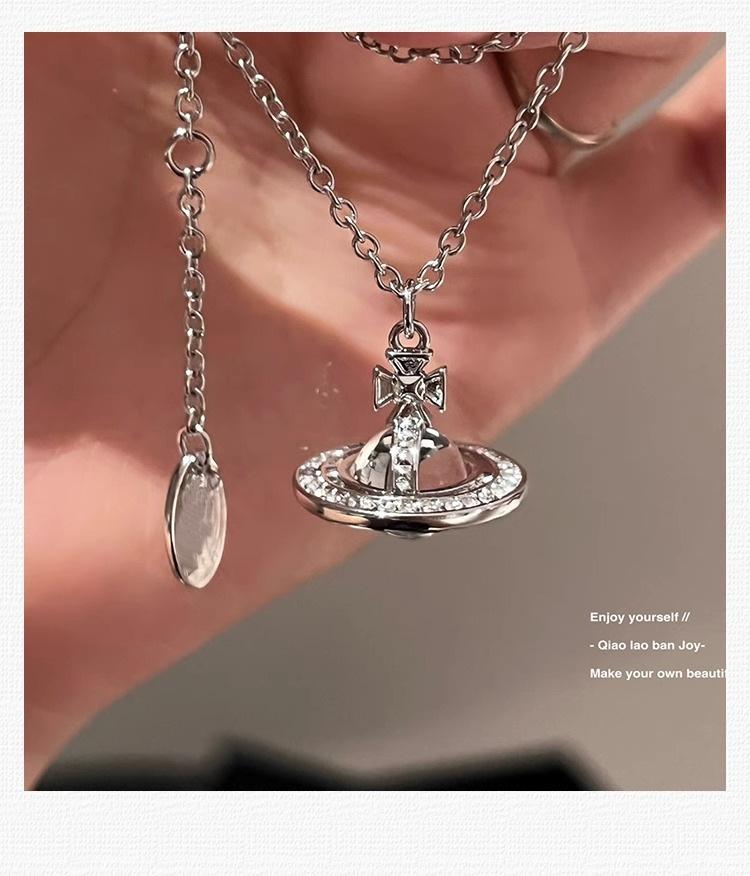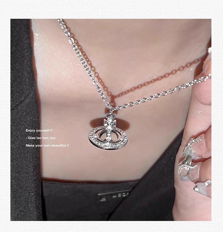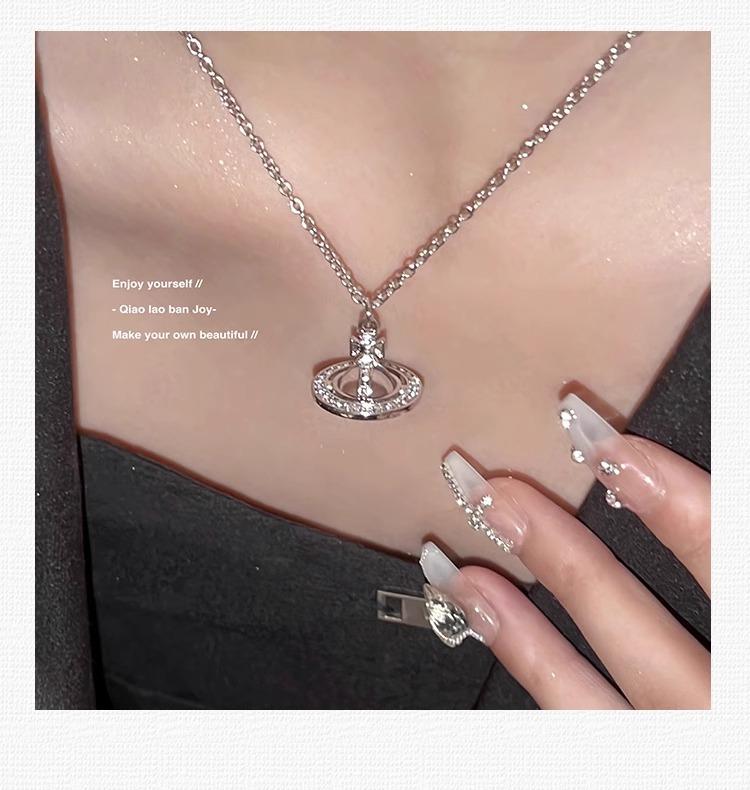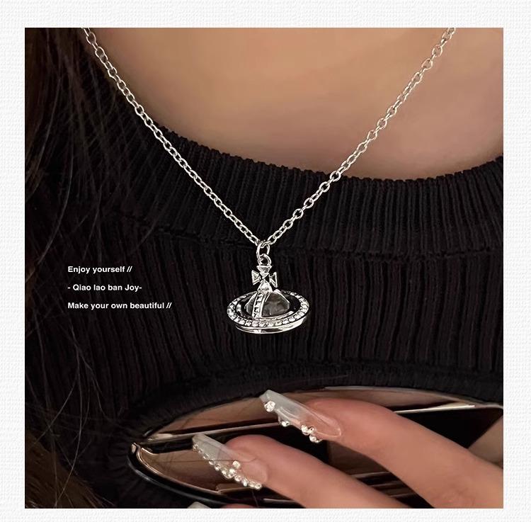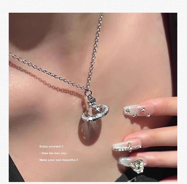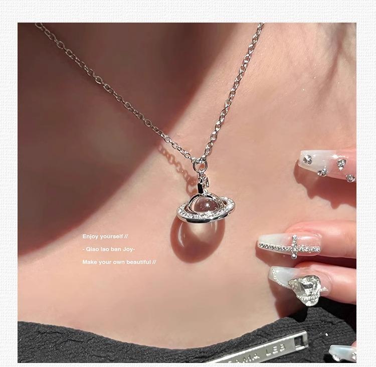 Collar de Saturno tridimensional de alta versión, acero de titanio, resistente a la decoloración, cristal transparente, colgante de planeta, cadena de clavícula, luz de nicho de lujo