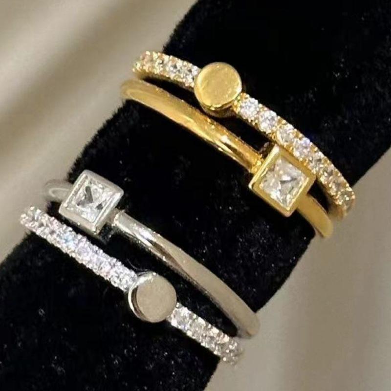Gold micro-embedded double layer small square diamond ring, Silver micro-embedded double layer small square diamond ring