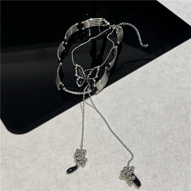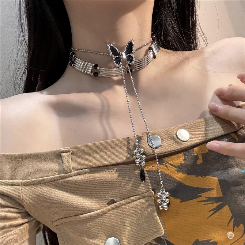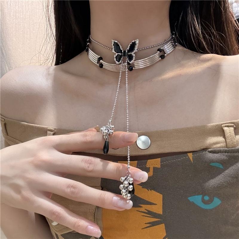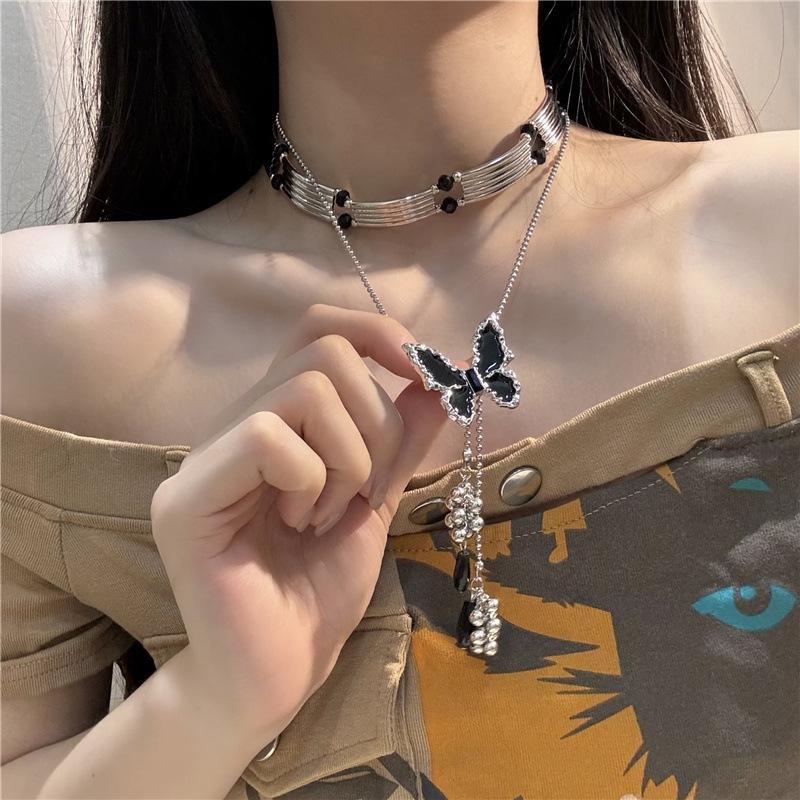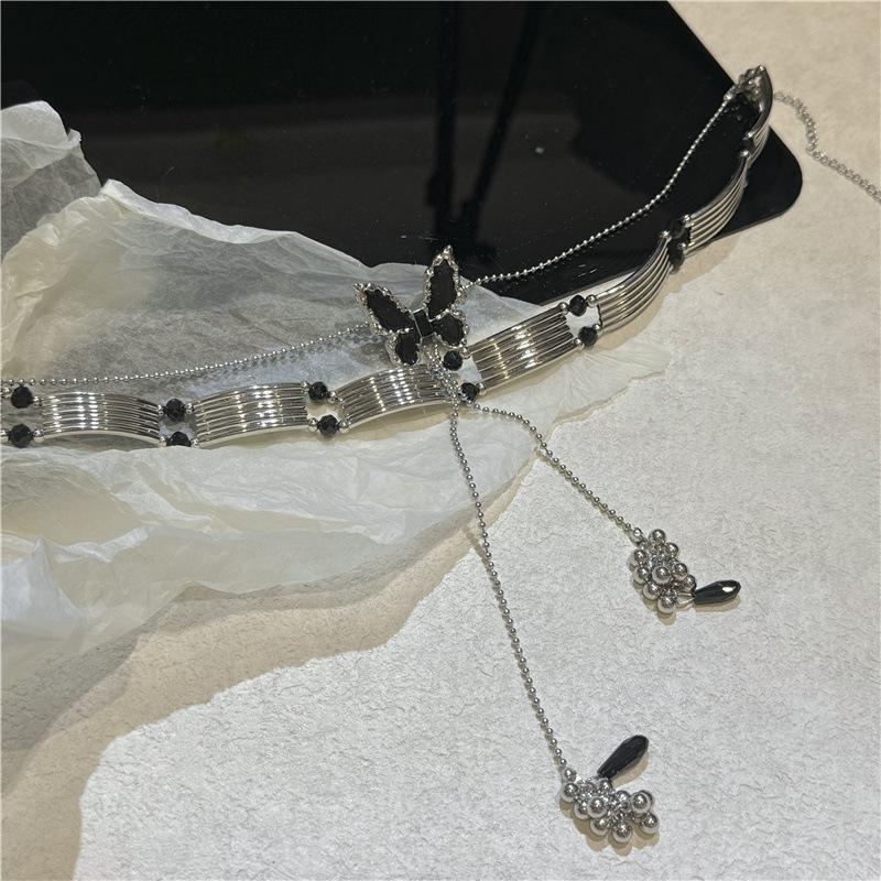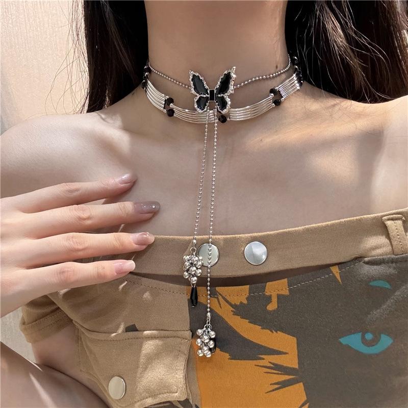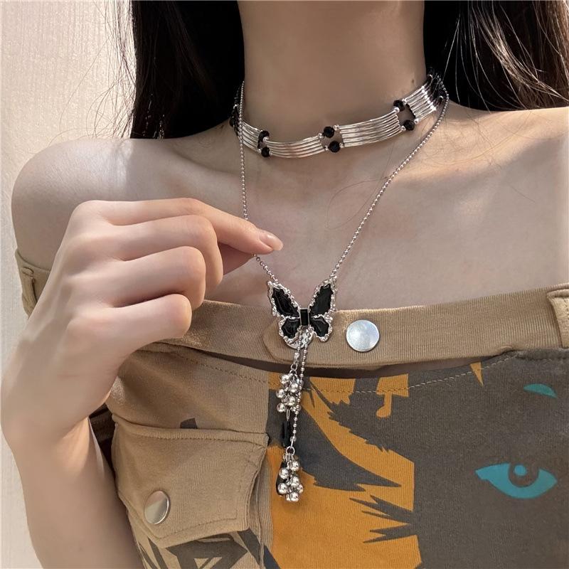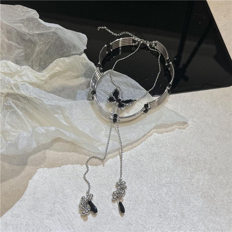 Collar de borla de mariposa negra de doble capa para mujer, estilo nicho, 2024, nuevo collar de cadena de clavícula, accesorios