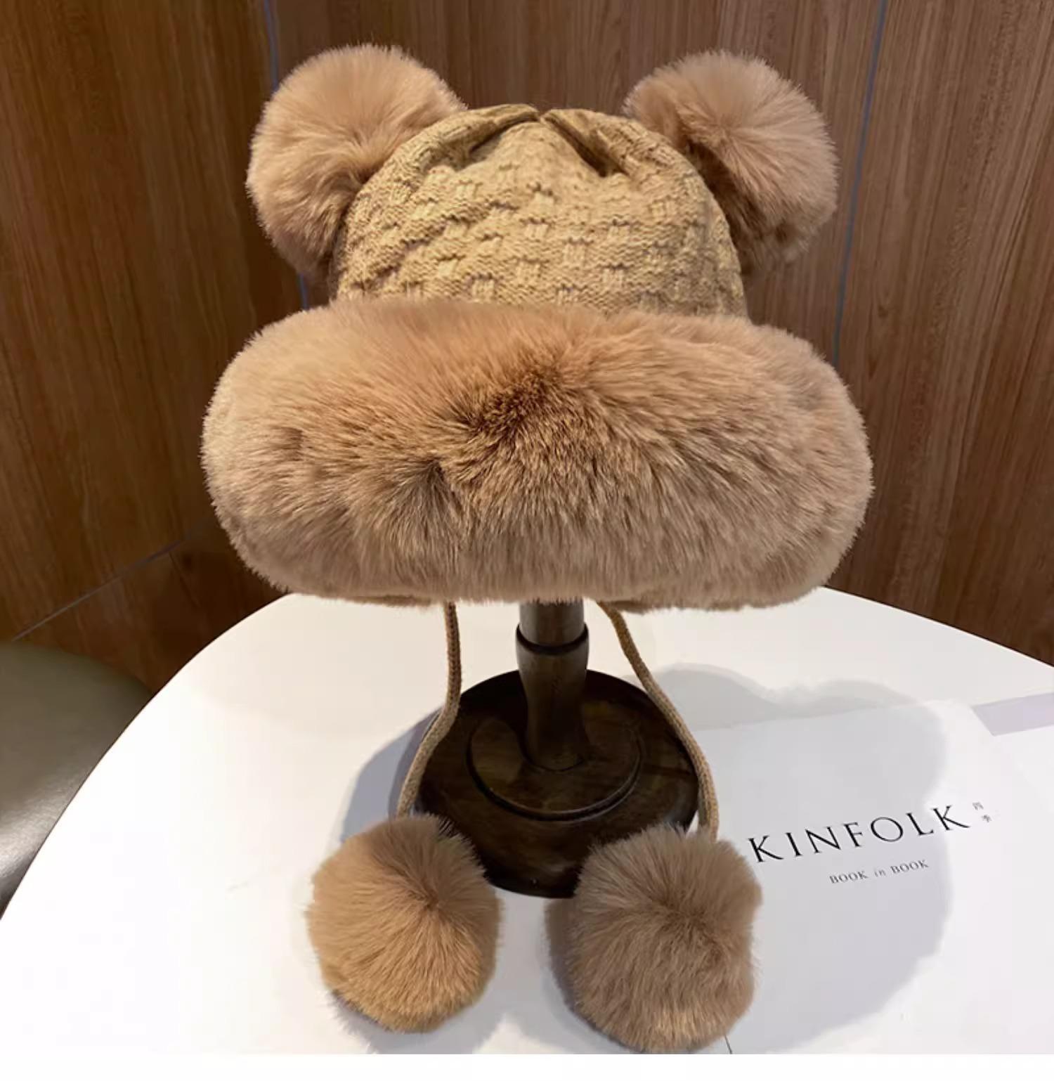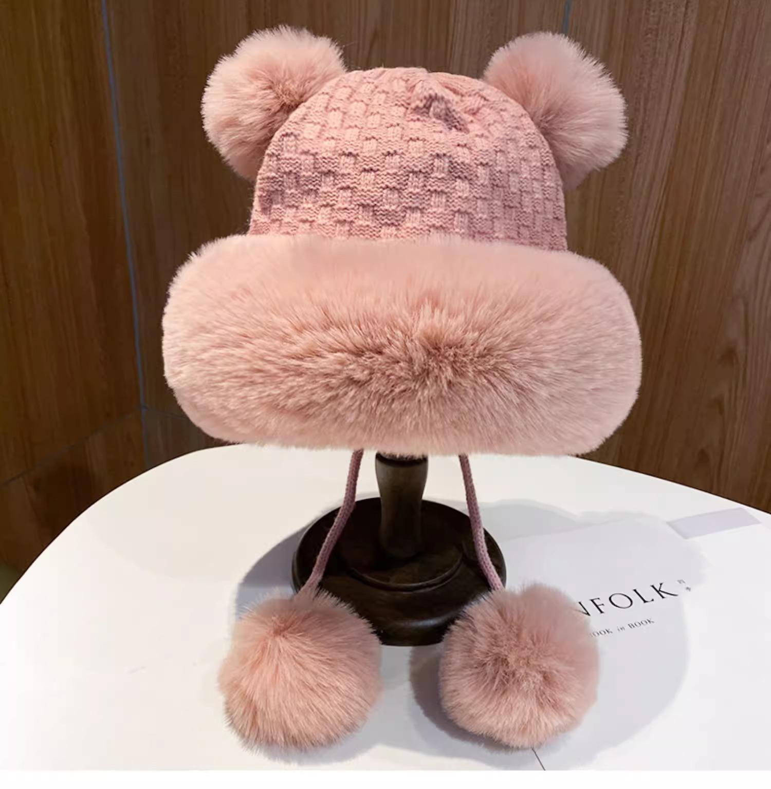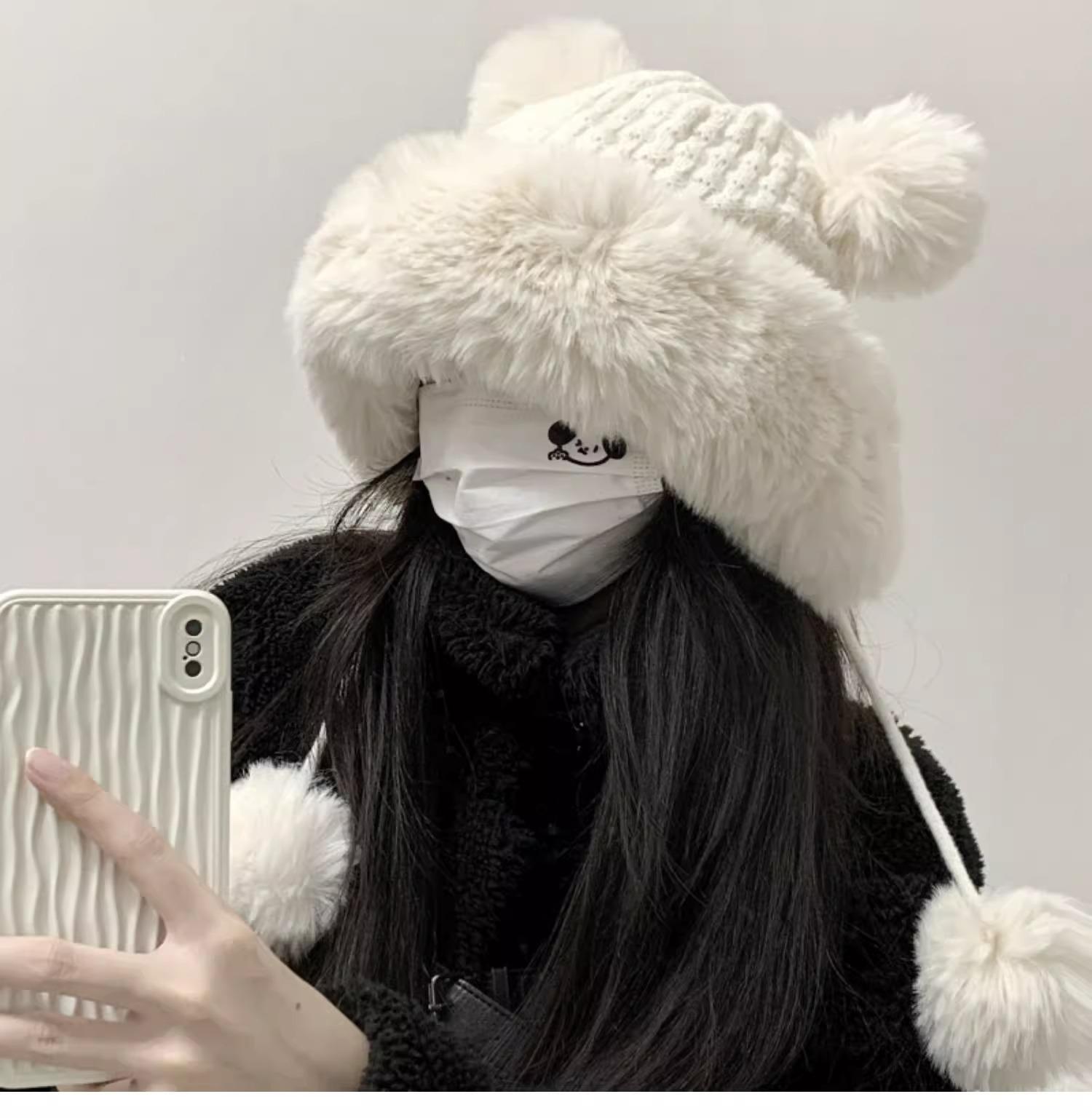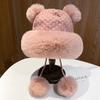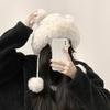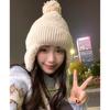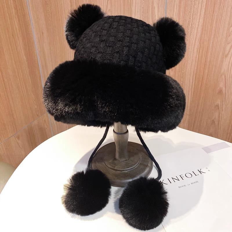 Gorro de lana de punto de terciopelo grueso para otoño e invierno para mujer, cálido jersey de invierno con protección para las orejas, bola de pelo de conejo, bonito gorro Lei Feng para mujer.