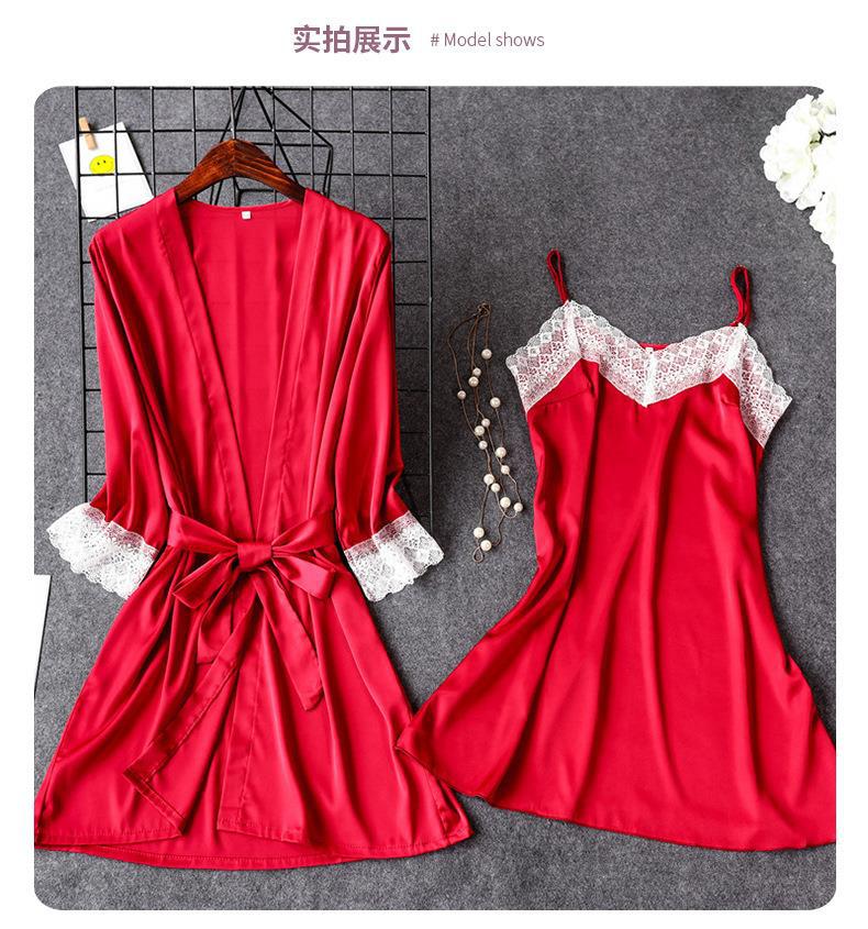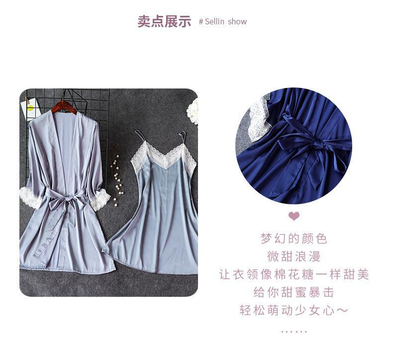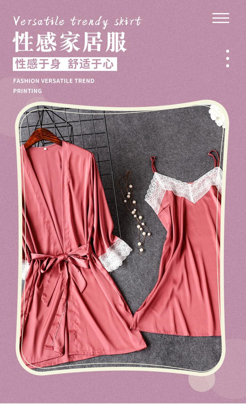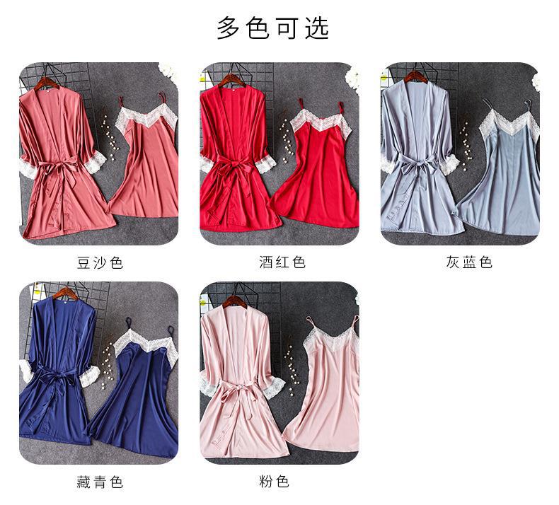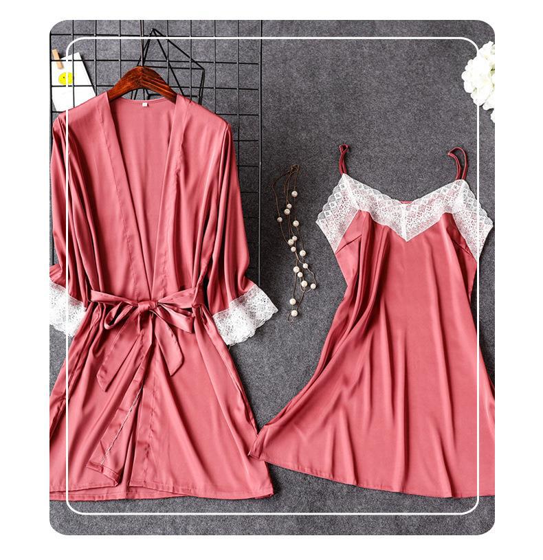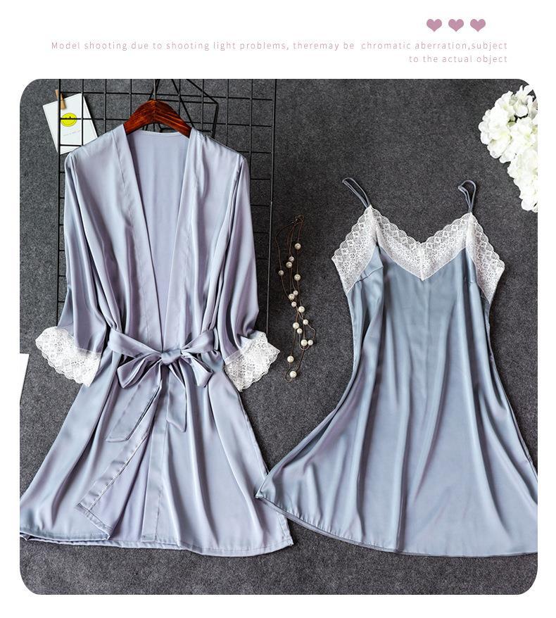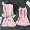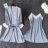 Primavera y Verano Sexy Dos Piezas Bata de Mañana Pijama para Mujer Imitación Seda Falda Colgante Camisón Bata Conjunto Delgado Ropa de Casa para Salir