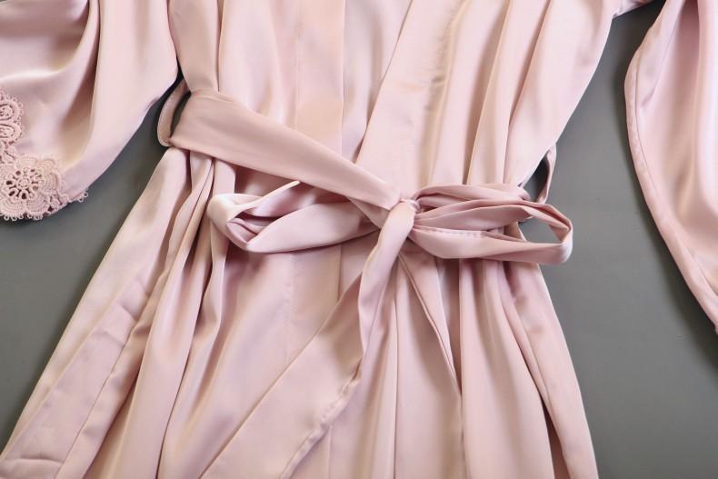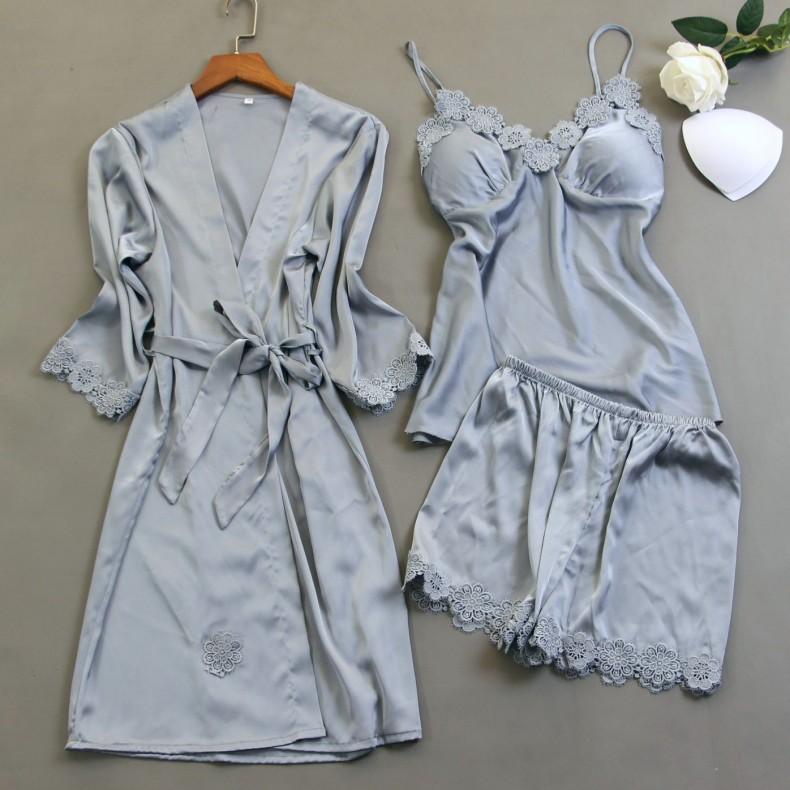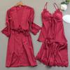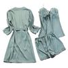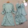 Pijama sexy para mujer, primavera y otoño, bata de manga larga, tirantes de seda helada, pantalones cortos de encaje, conjunto de tres piezas, ropa fina para el hogar, traje