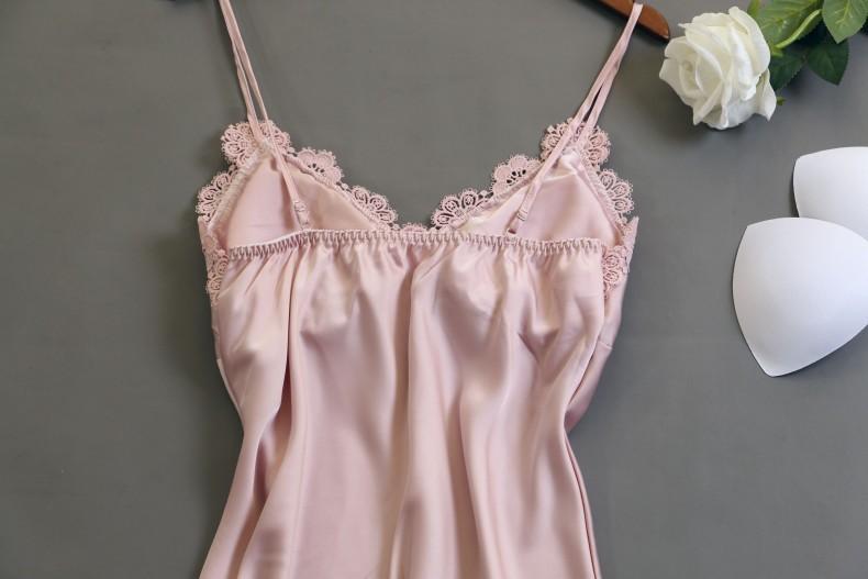 Pijama sexy de seda helada de AliExpress con tirantes y almohadillas para el pecho, pantalones cortos de encaje, conjunto de camisón, ropa de casa para mujer.
