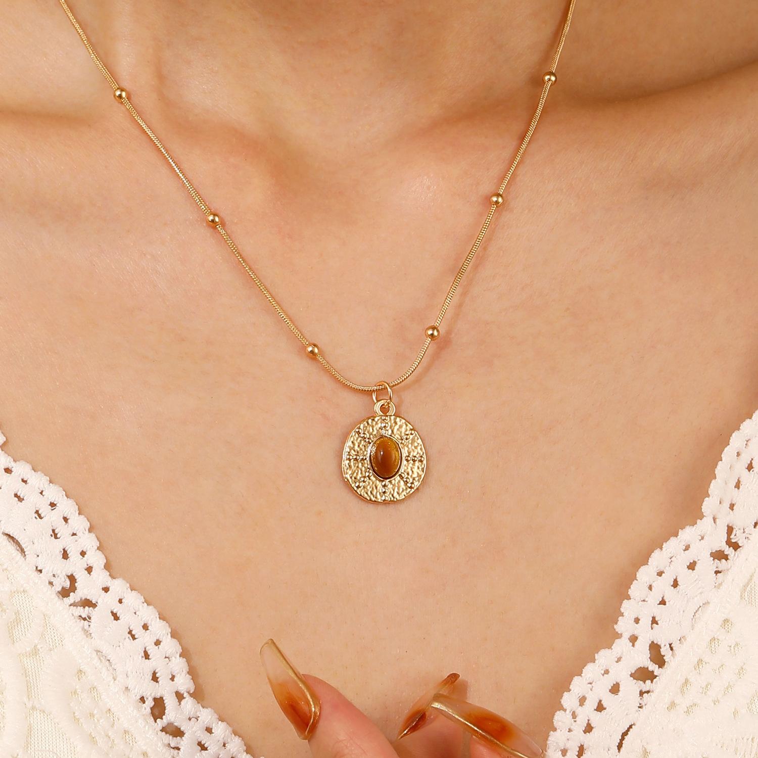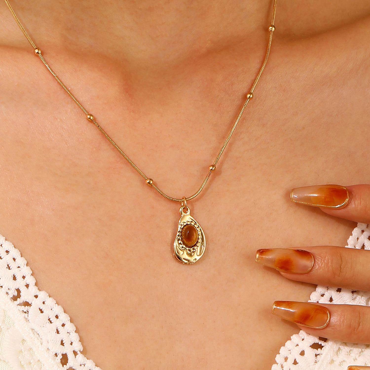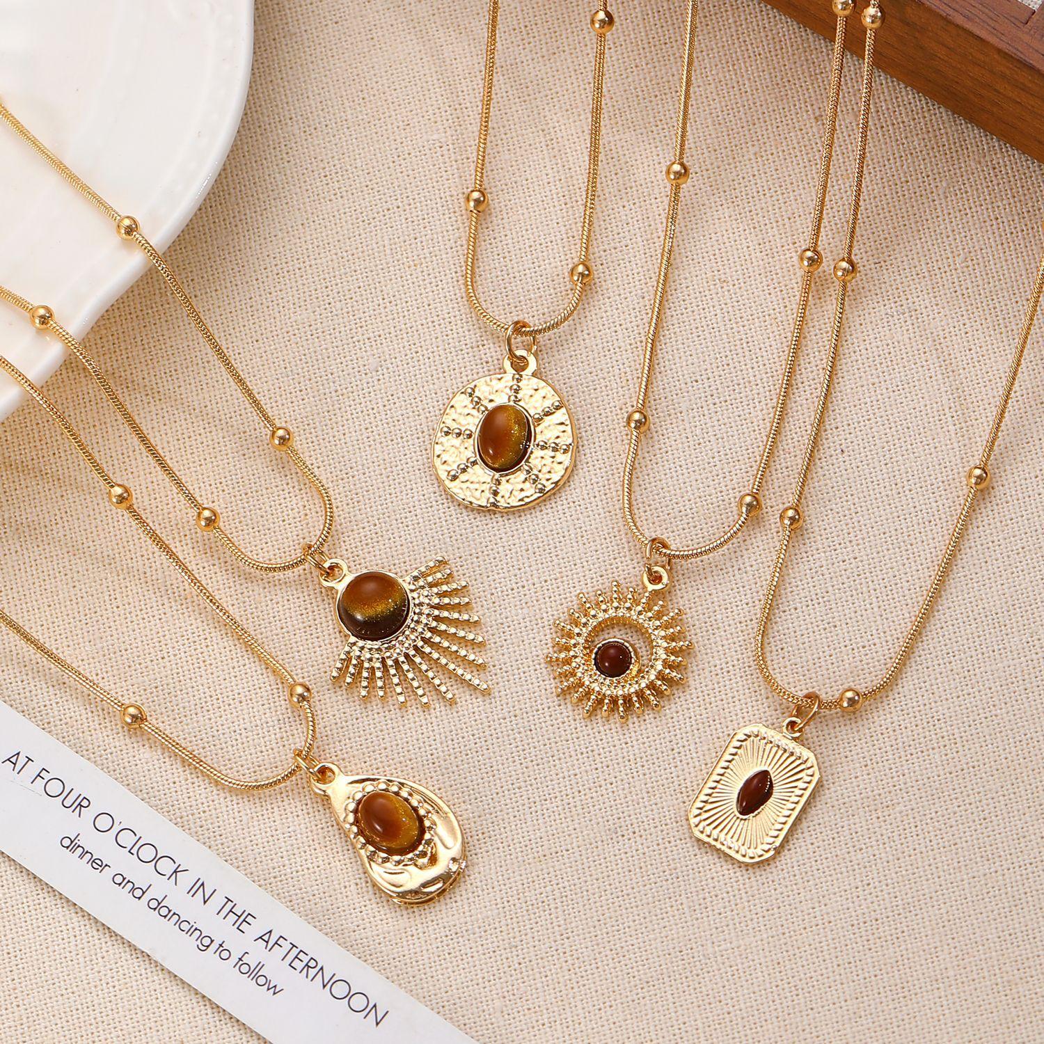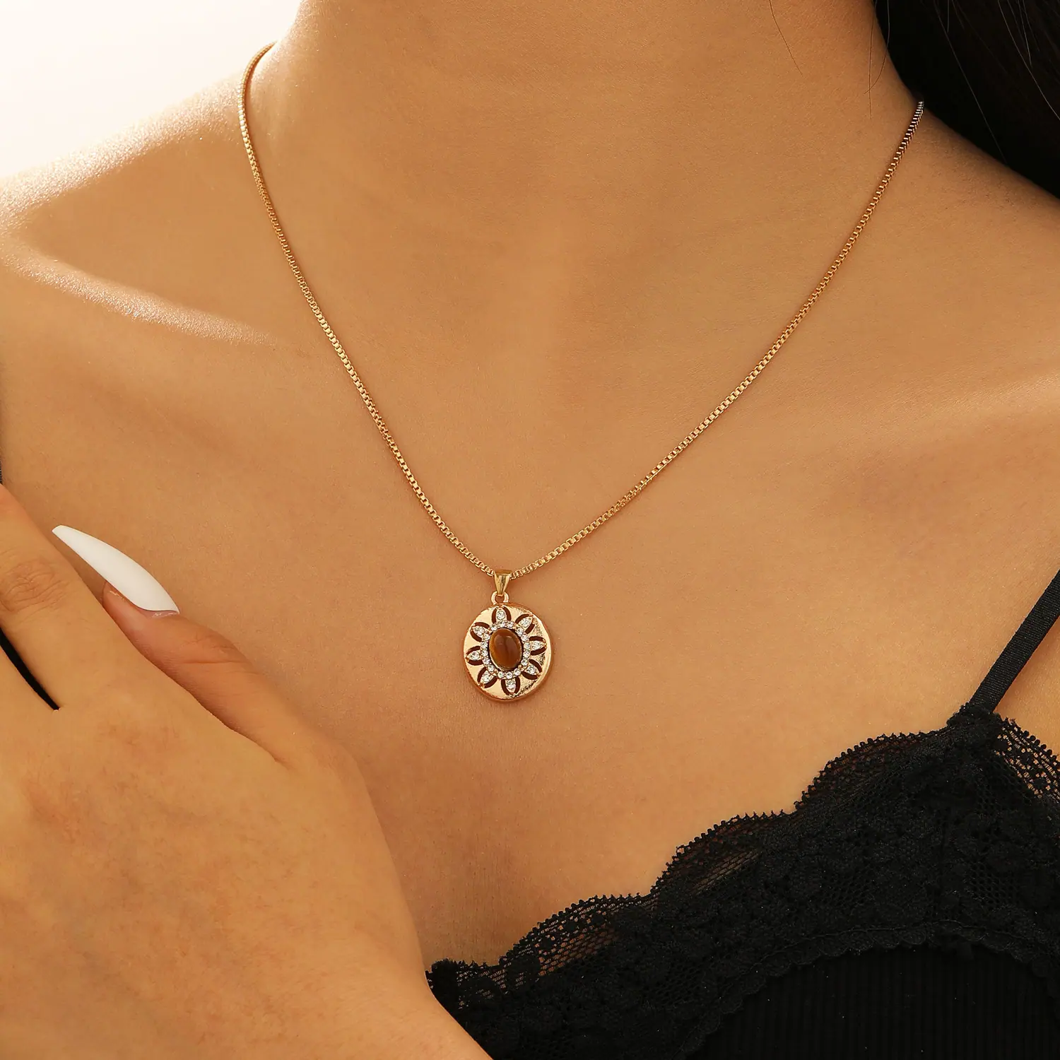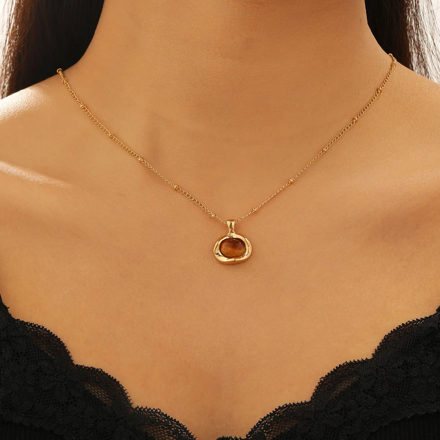 Collar Transfronterizo de Piedra Ojo de Tigre Maillard para Mujer Aleación de Alta Gama Nicho Cadena de Suéter Accesorios Colgante Retro Marrón