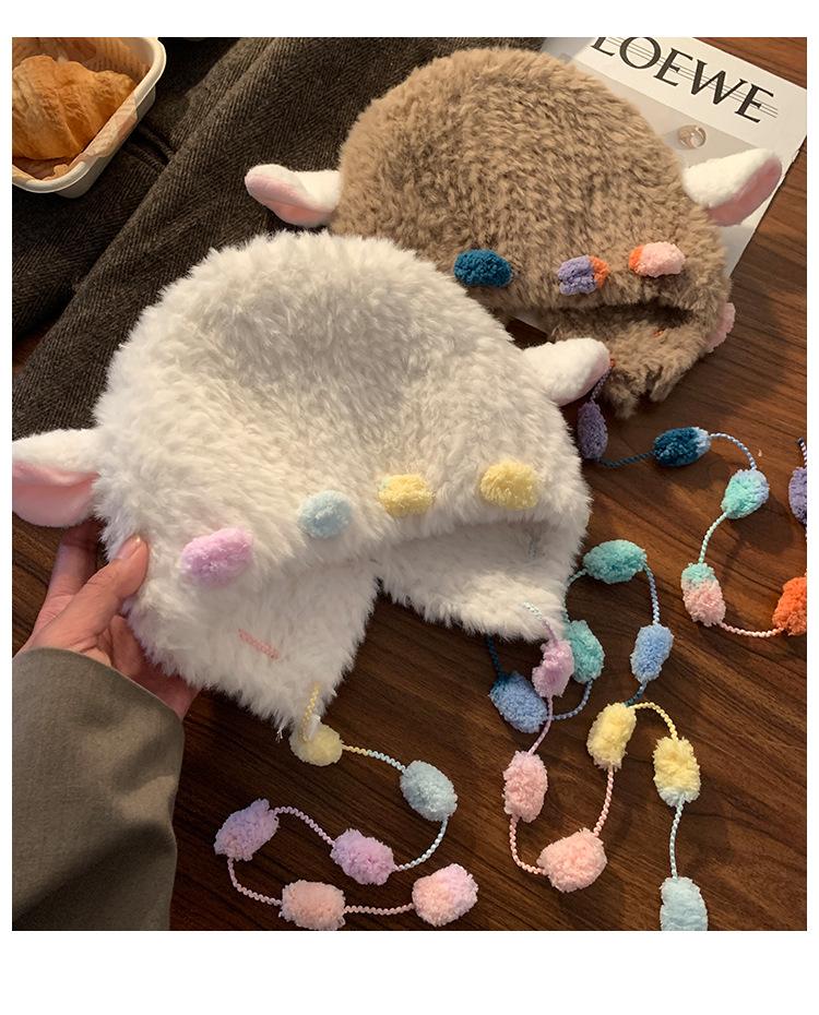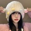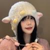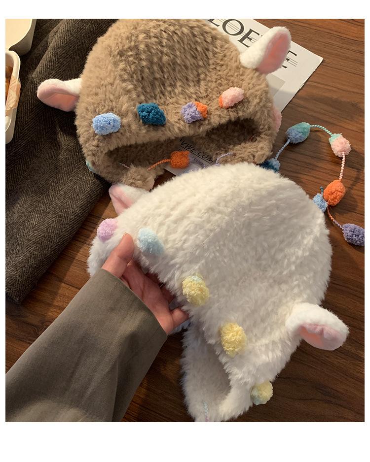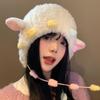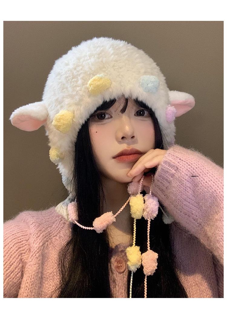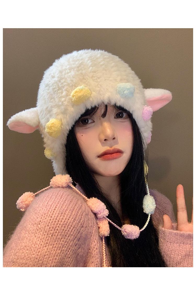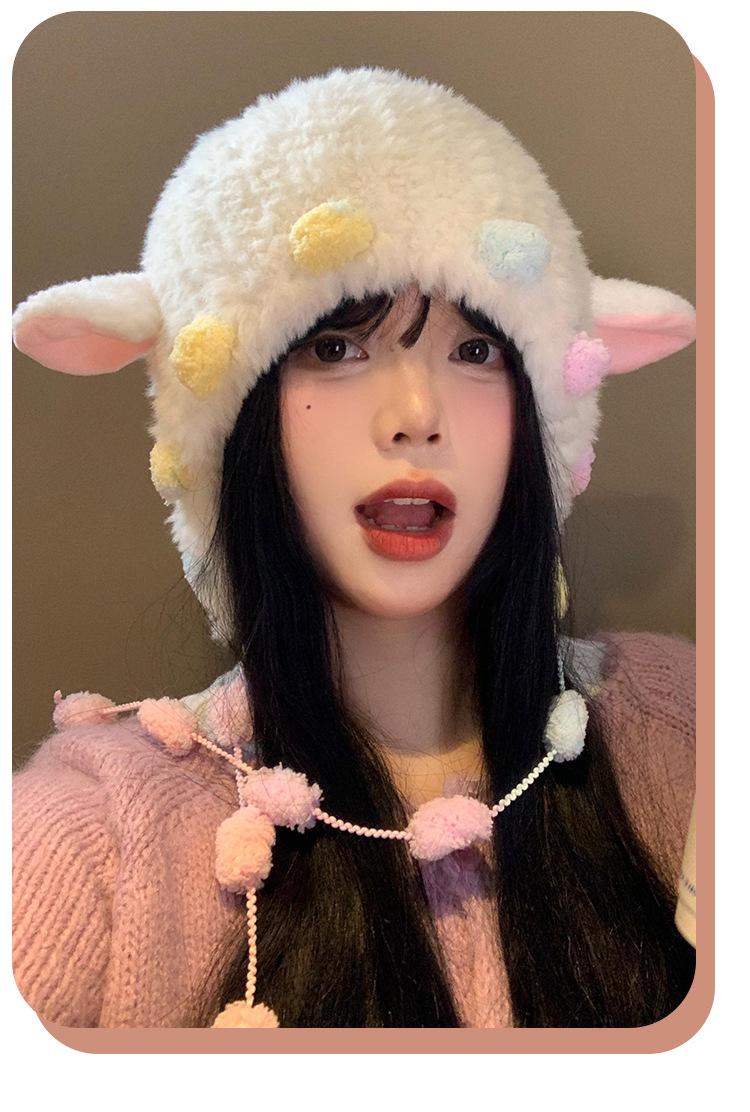 Gorro de punto de felpa con orejas de cordero para mujer, otoño e invierno, bonito gorro de lana de color pequeño con protección para las orejas, cálido gorro Lei Feng