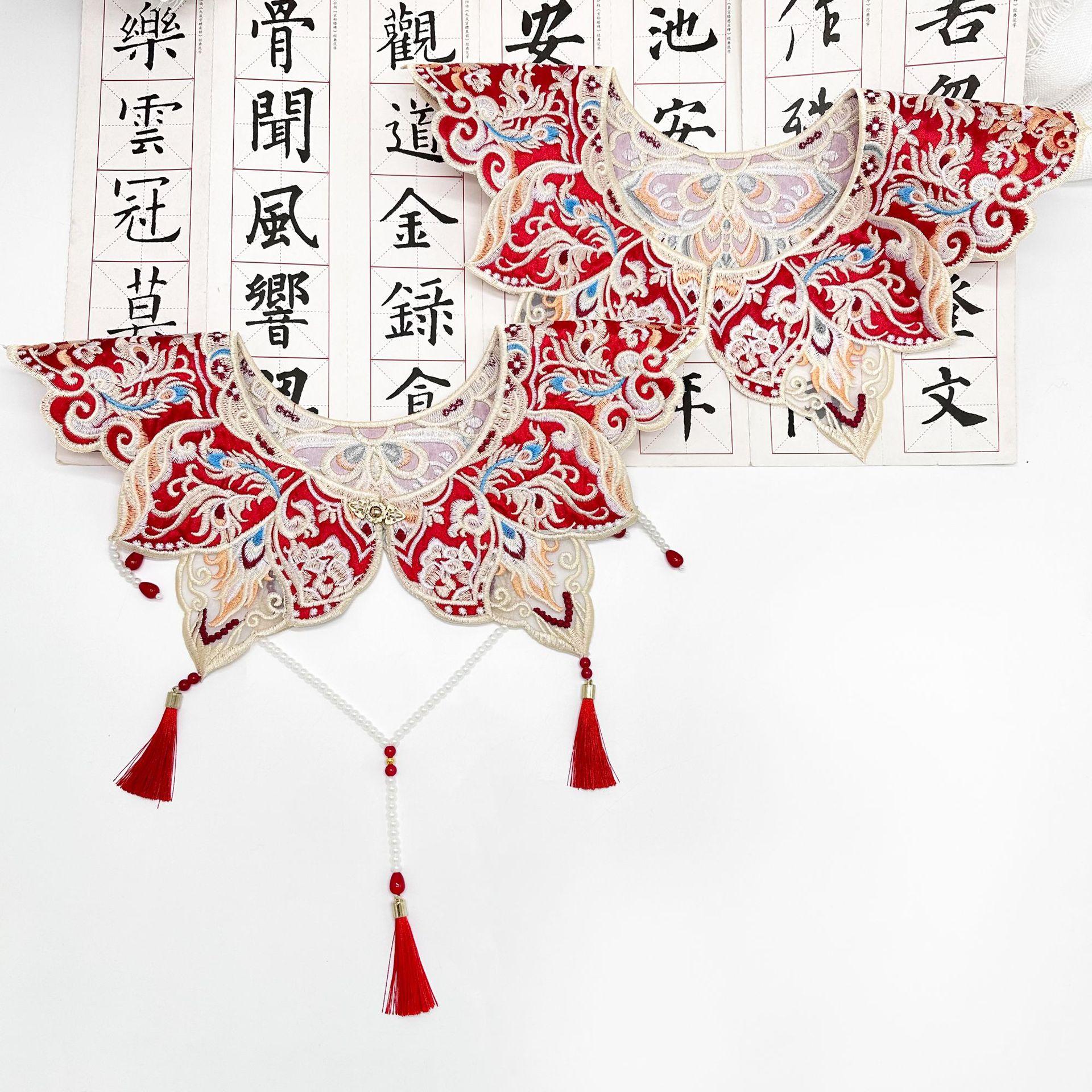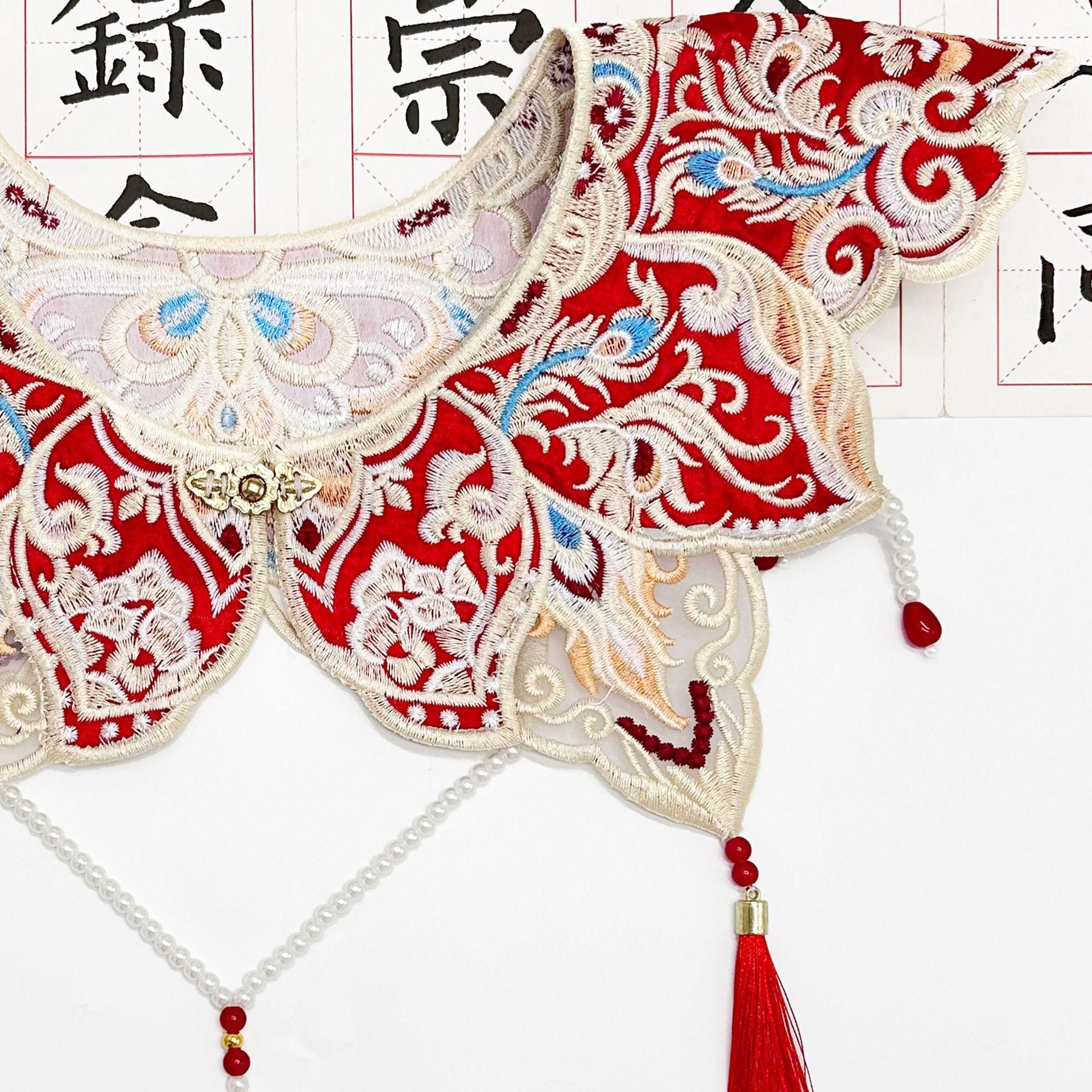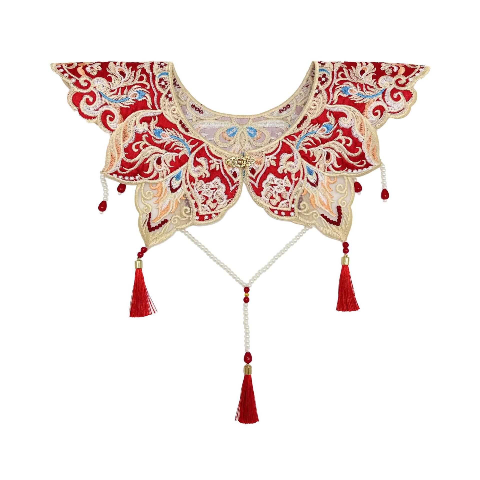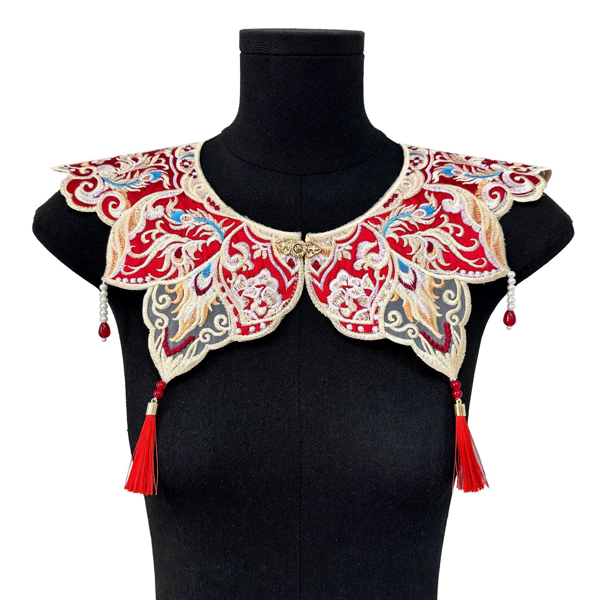 En stock Estilo Étnico Rojo Bordado Hebilla Hanfu Falda Cara de Caballo Nube Decorativa Hombro Industria Pesada Cuentas Borla Colgante Cuello Falso