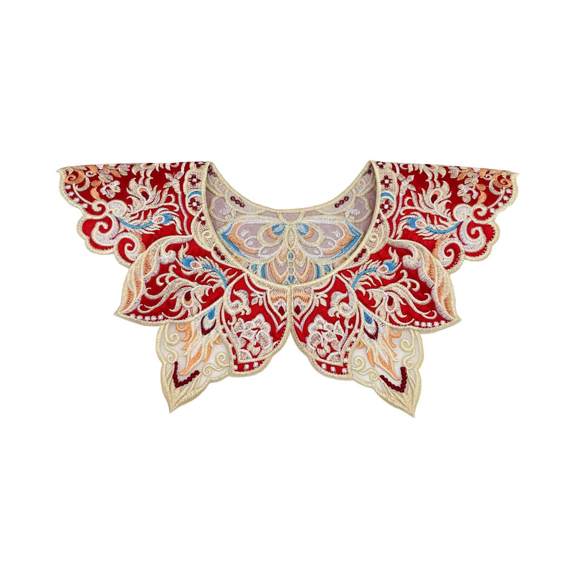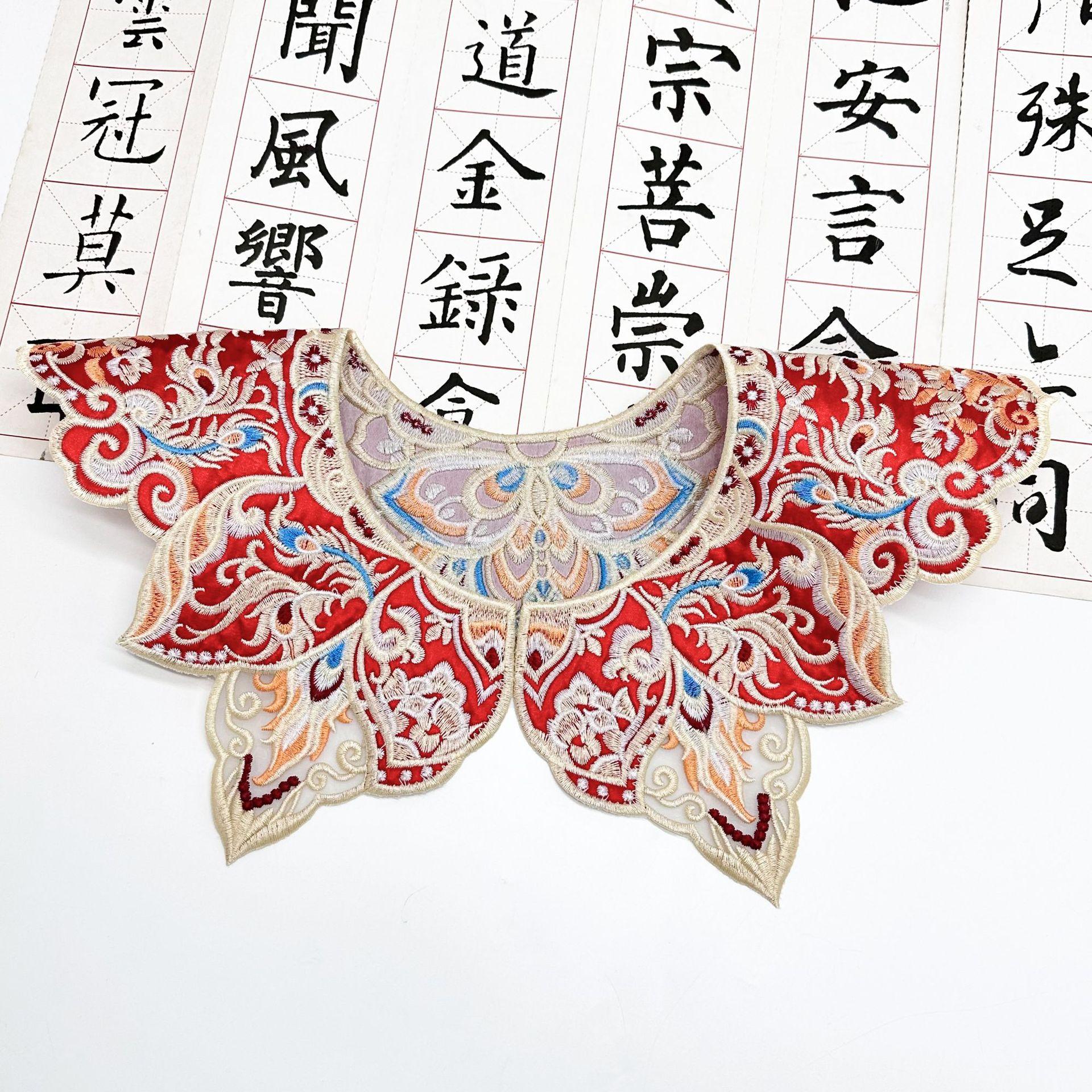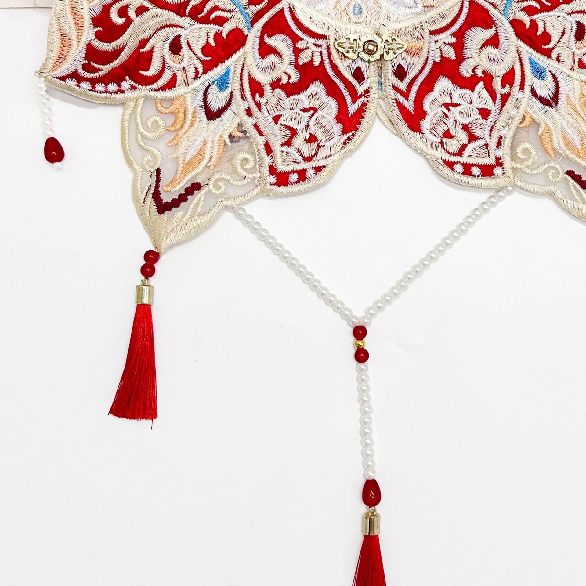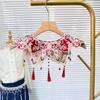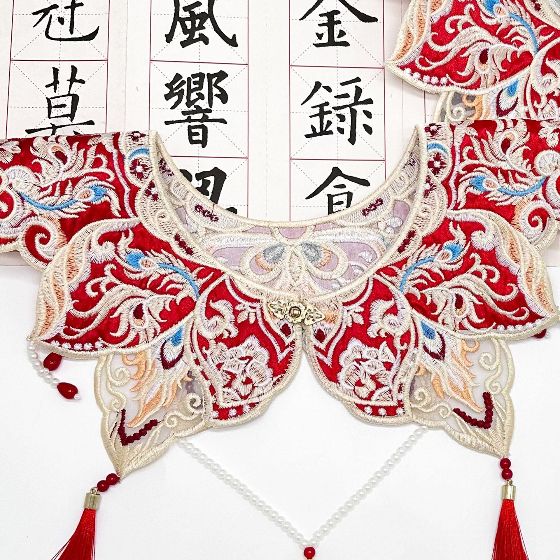 En stock Estilo Étnico Rojo Bordado Hebilla Hanfu Falda Cara de Caballo Nube Decorativa Hombro Industria Pesada Cuentas Borla Colgante Cuello Falso