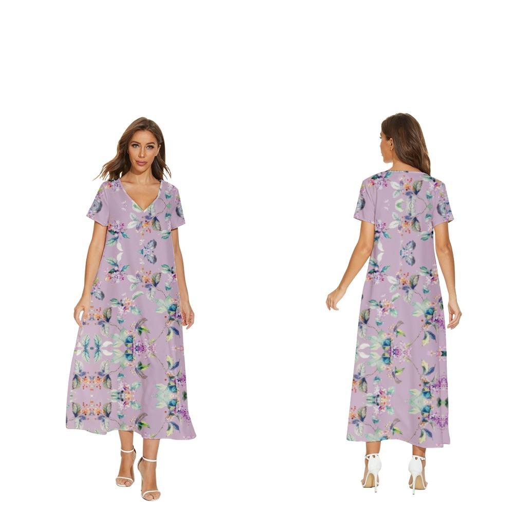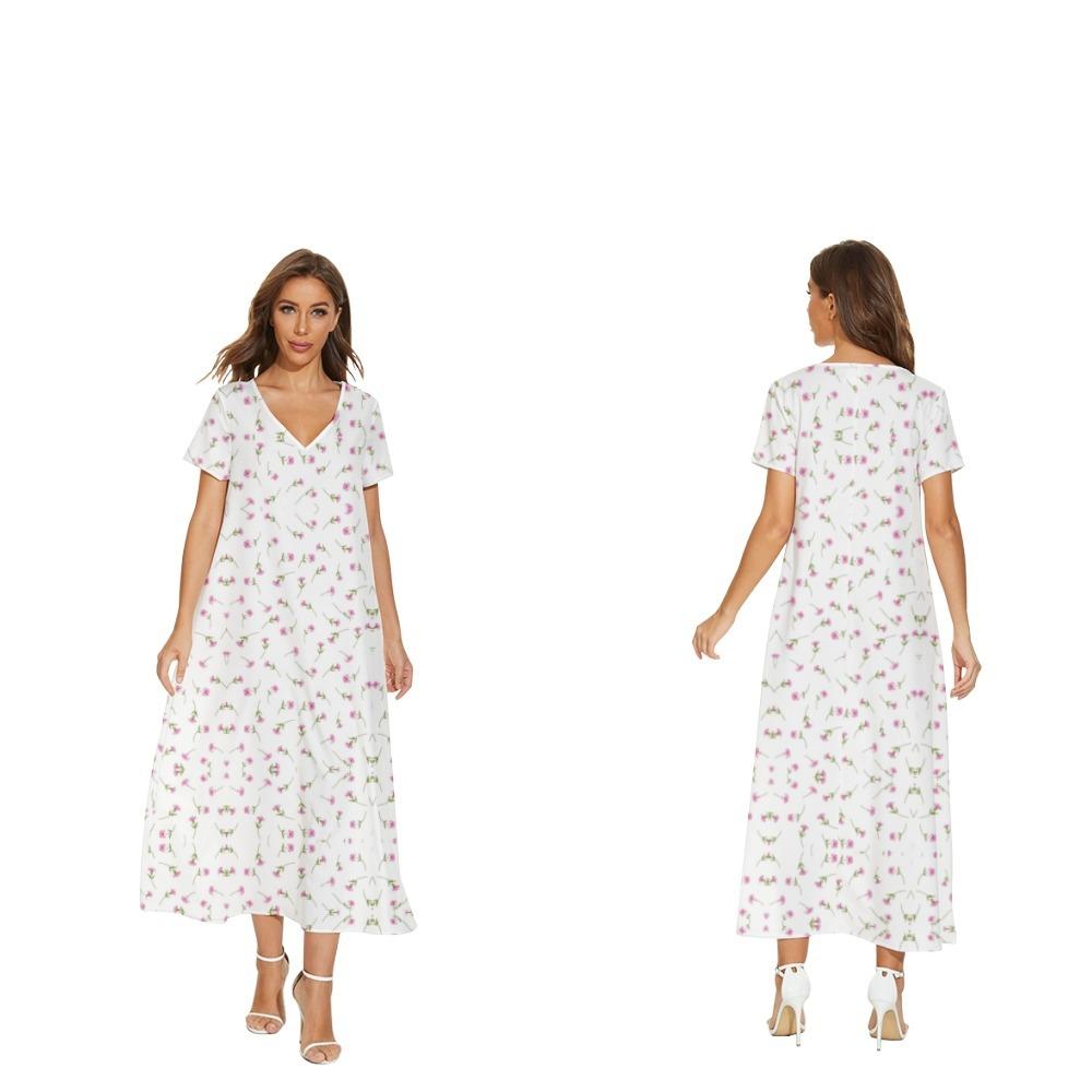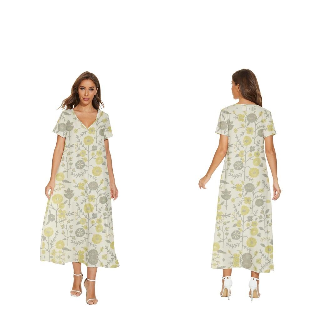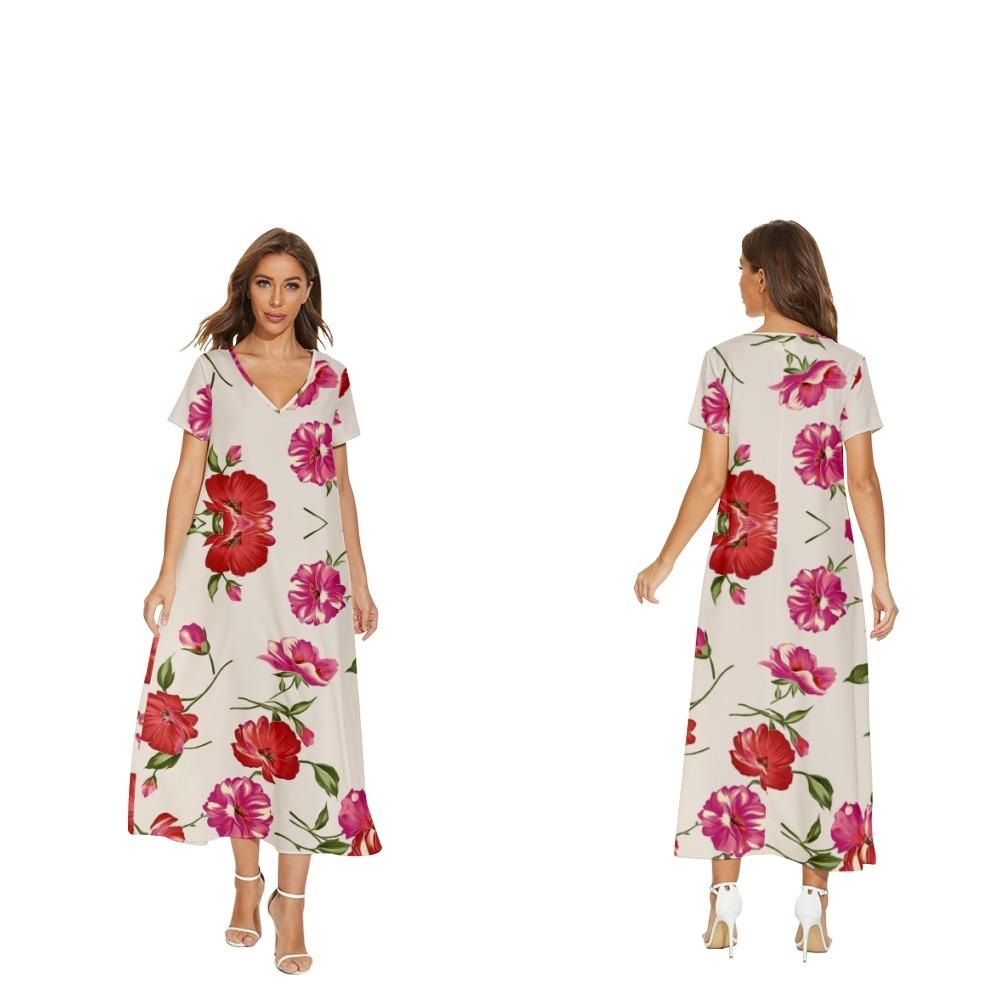 Nuevo vestido floral de manga corta con cuello en V de Amazon para primavera y verano, informal, de comercio exterior transfronterizo, para mujer, se puede enviar en nombre
