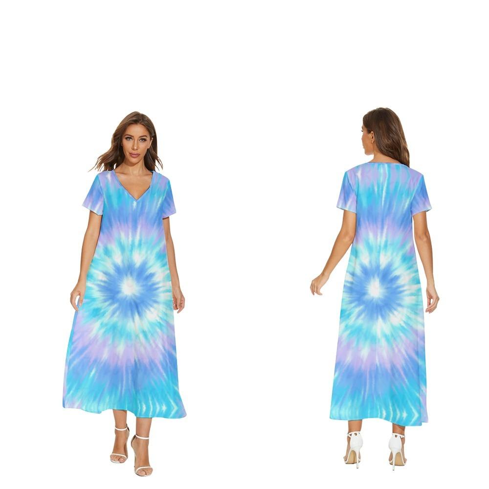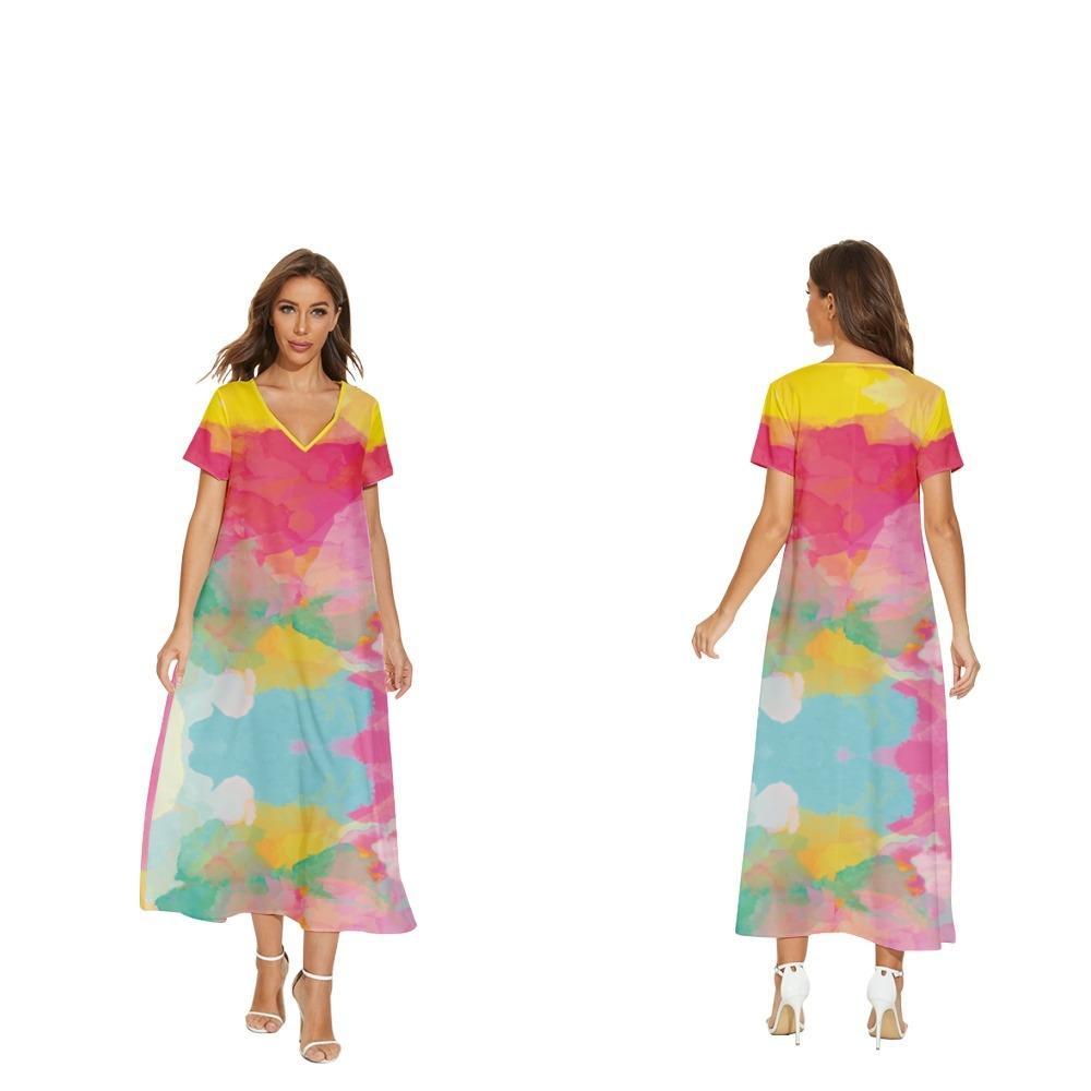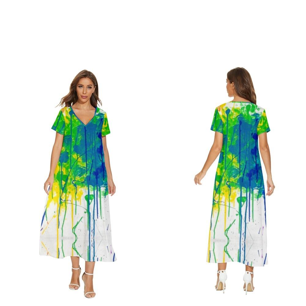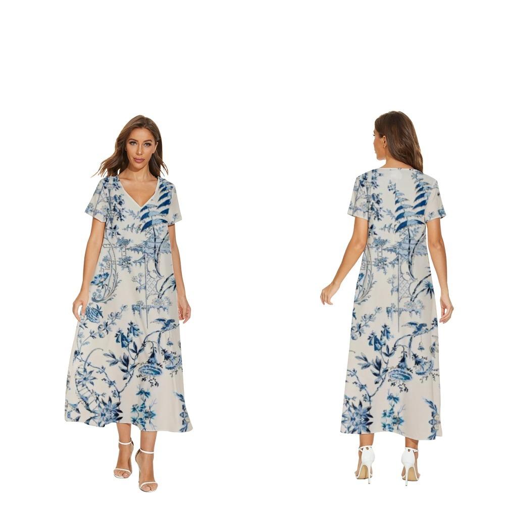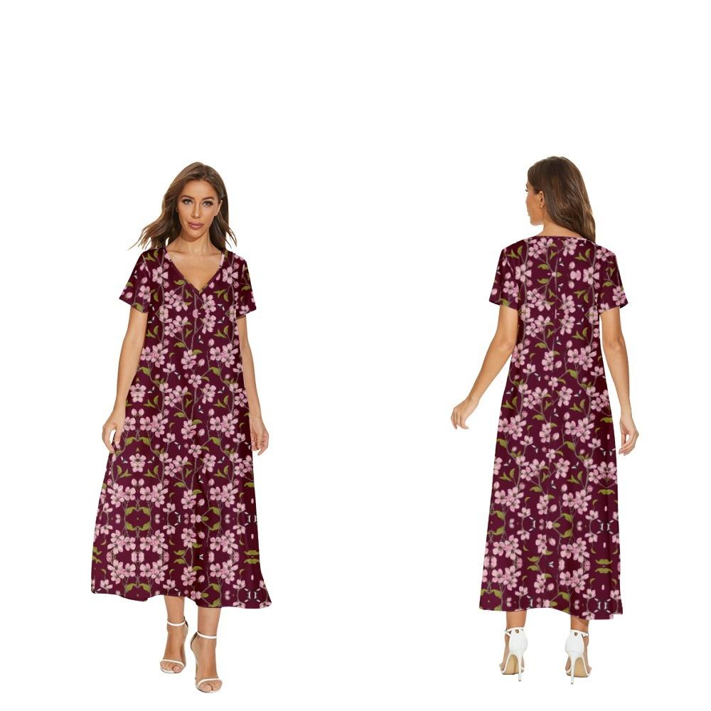Nuevo vestido floral de manga corta con cuello en V de Amazon para primavera y verano, informal, de comercio exterior transfronterizo, para mujer, se puede enviar en nombre