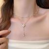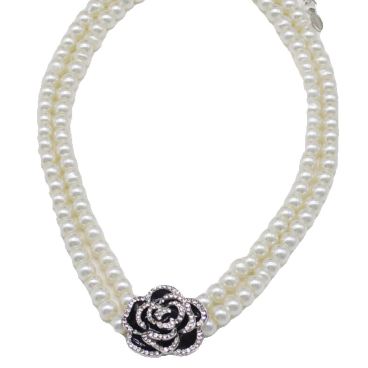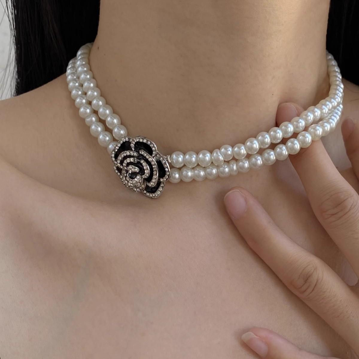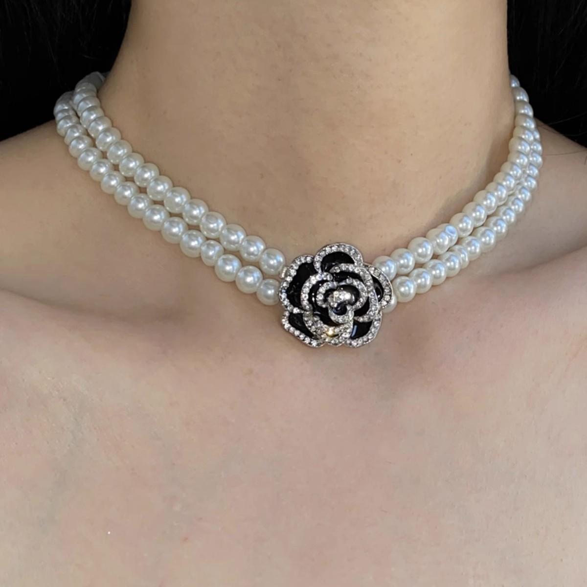 Collar de perlas de doble capa con camelia y diamantes franceses para mujer, gargantilla de cadena de clavícula de lujo retro de nicho accesible.