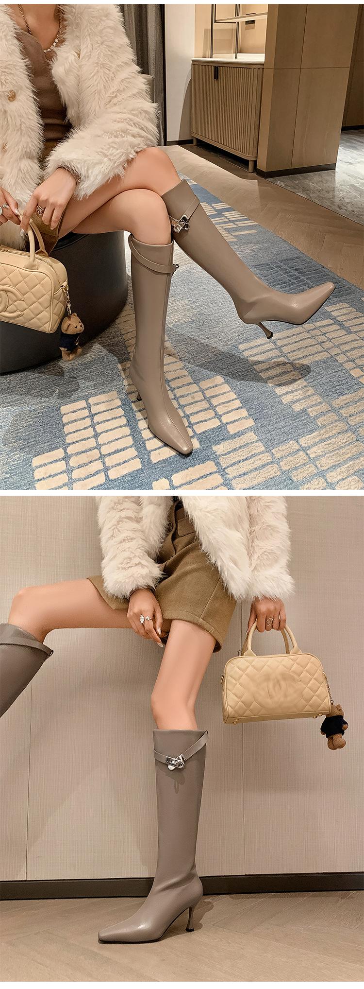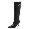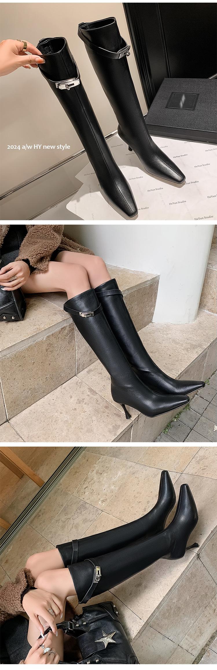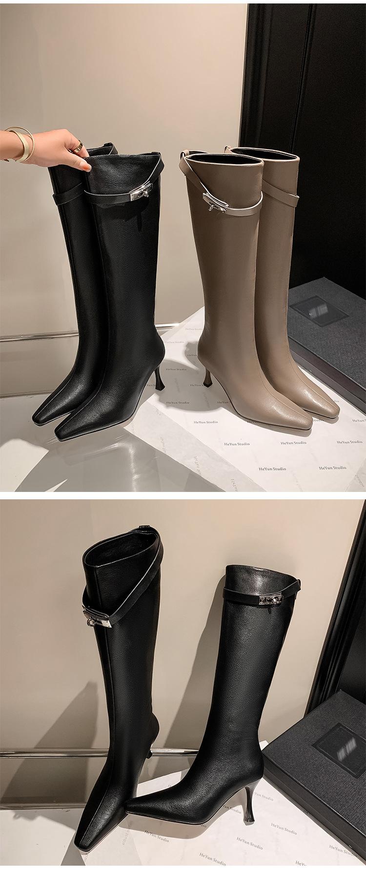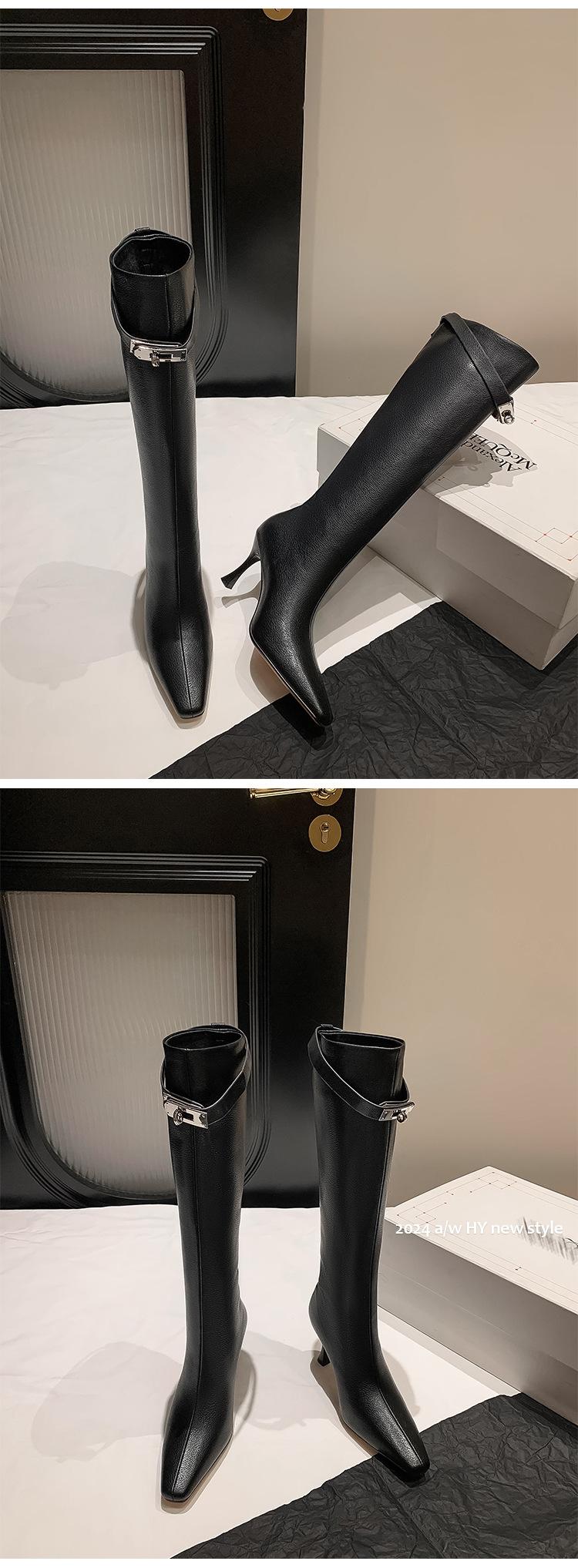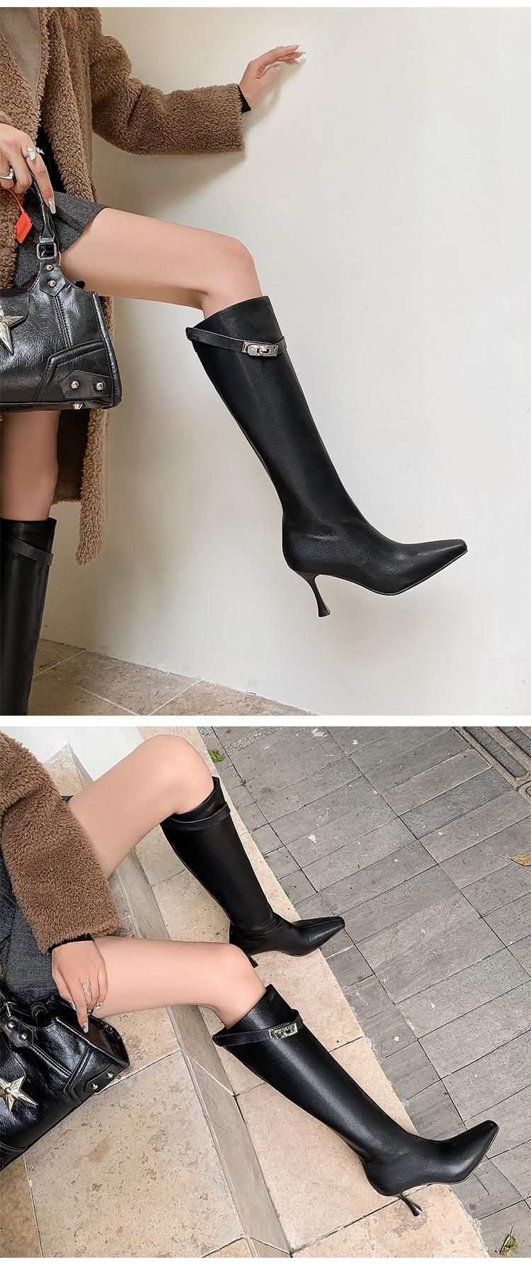 Mujer sexy ~ Otoño 2024, botas de cuero hasta la rodilla con tacón alto y cierre de seguridad, botas finas con pierna cuadrada y cabeza cuadrada