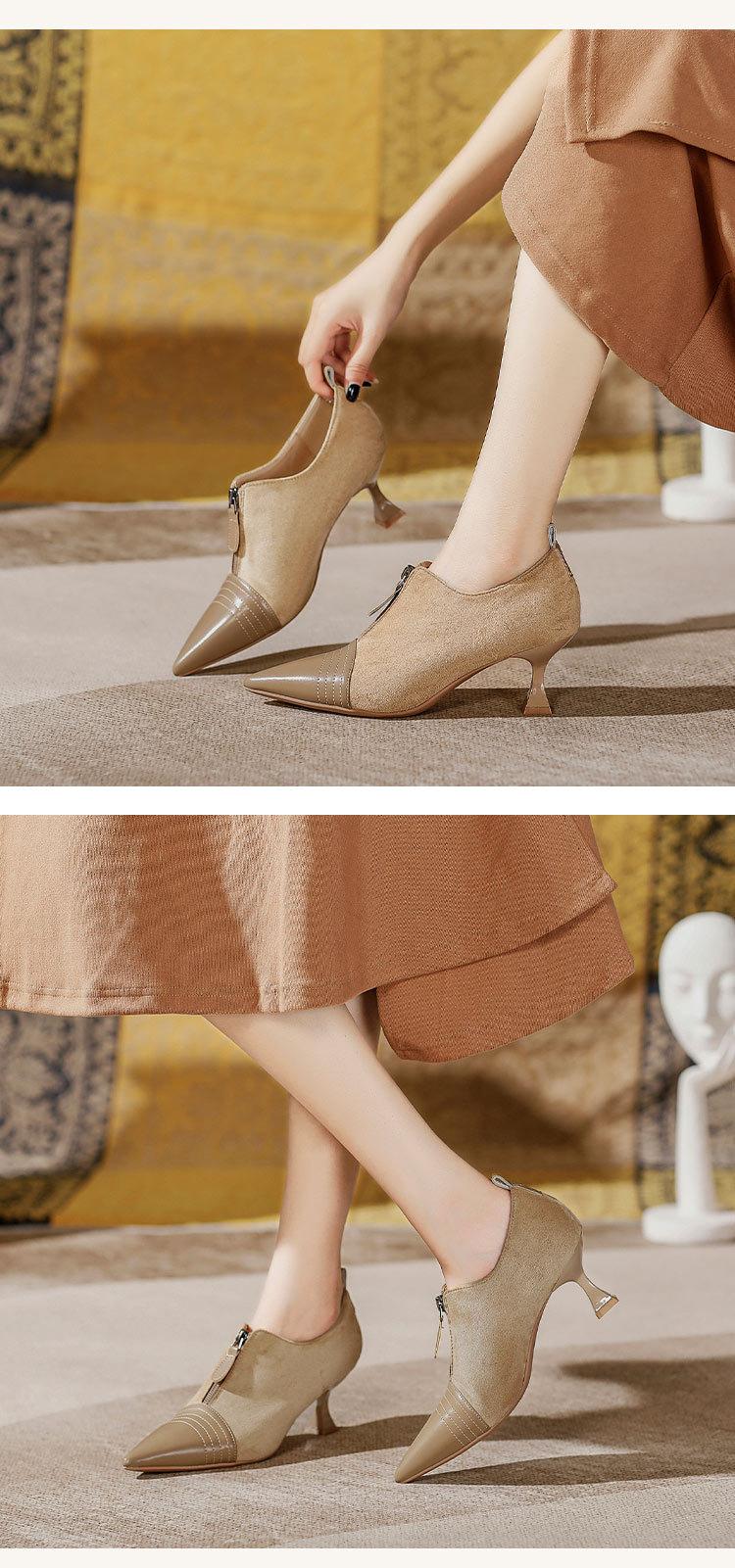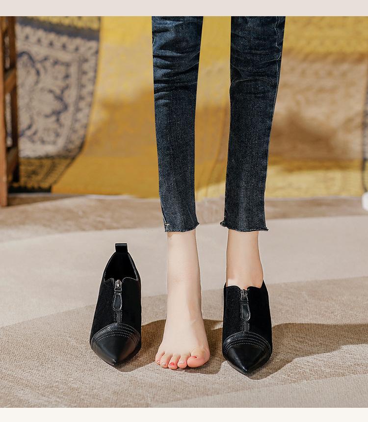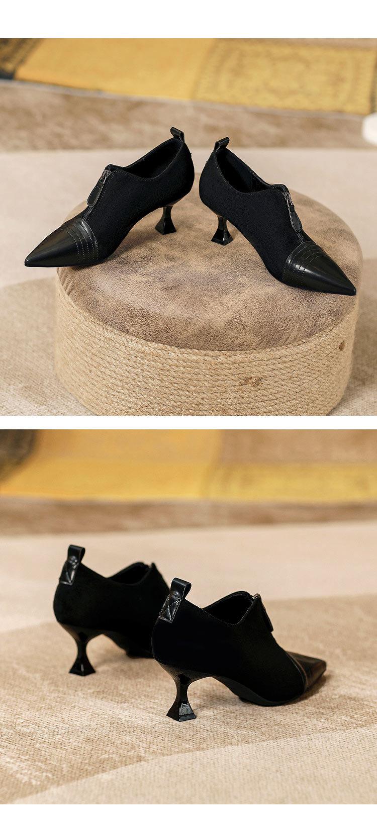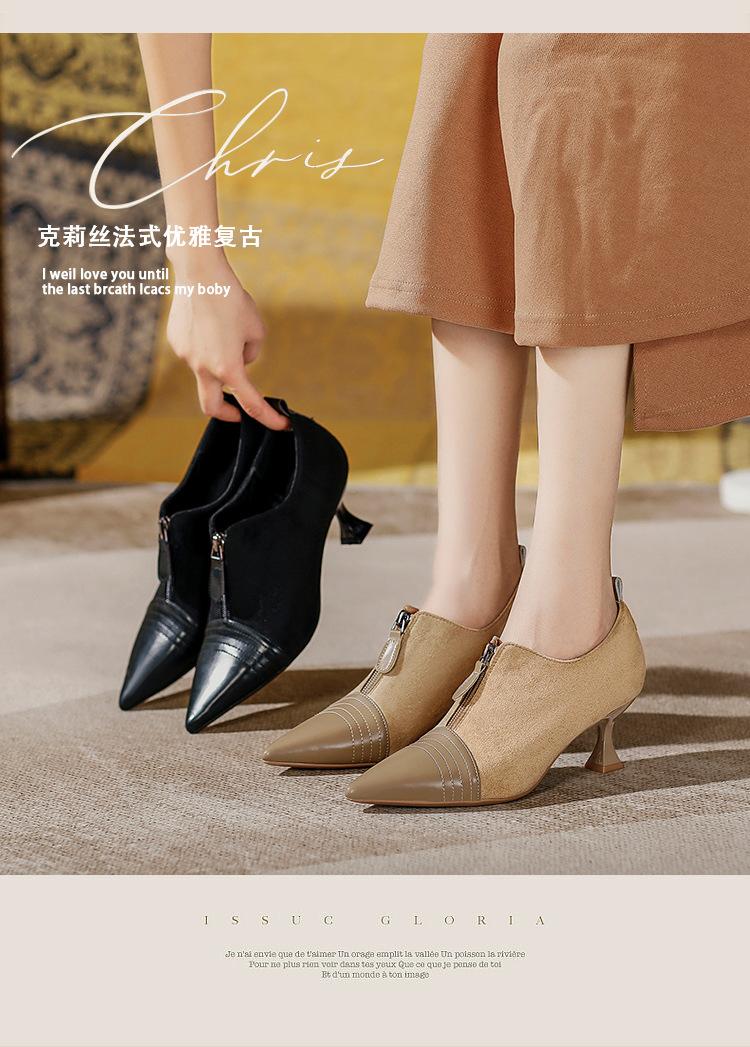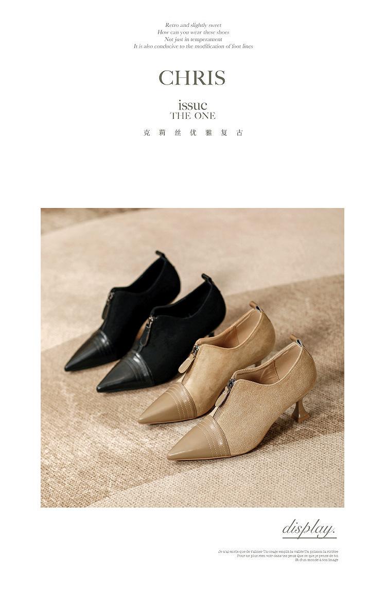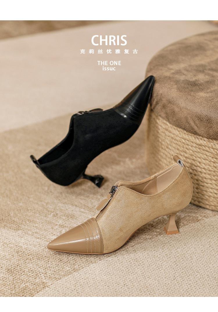 Tacones Altos de Aguja para Mujer 2025 Nuevo Otoño e Invierno Cremallera Frontal Retro Británico Zapatos de Mujer Empalmados Punta Afilada Boca Profunda Flats