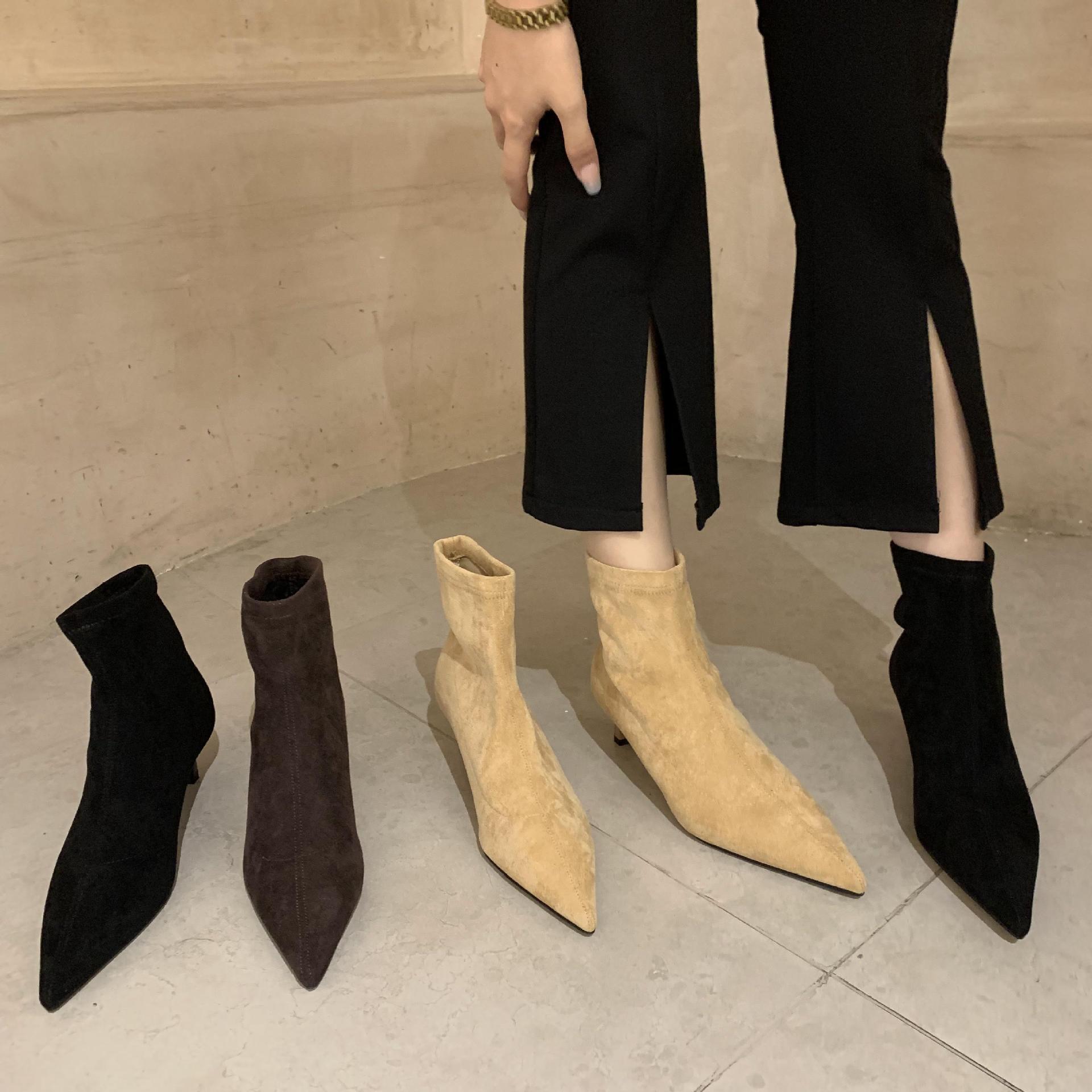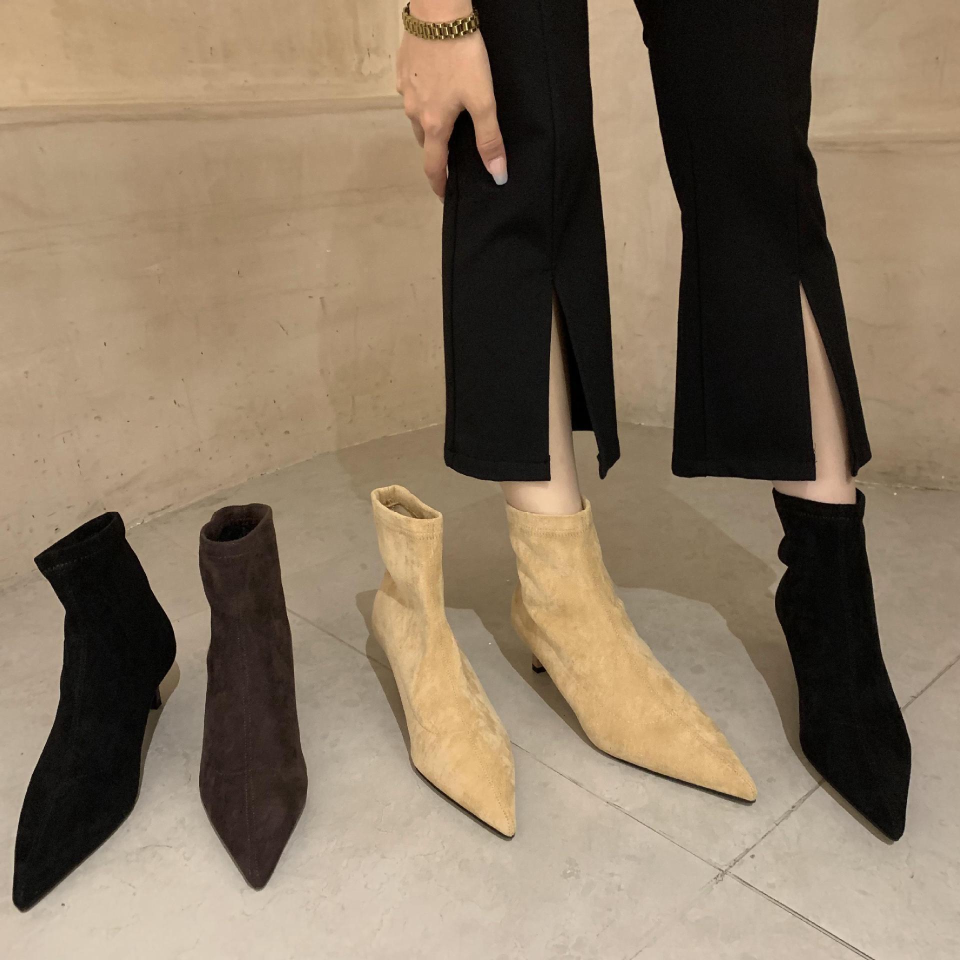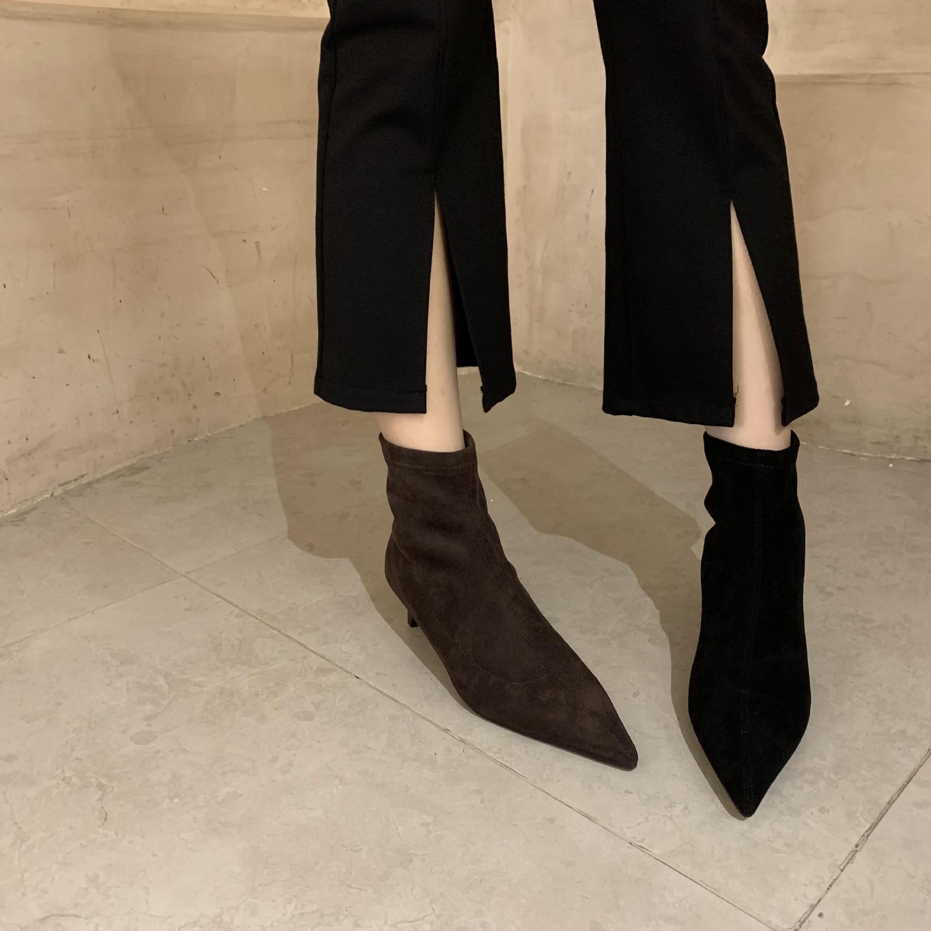 Botas elásticas de tacón fino y puntiagudo para otoño e invierno de 2023, populares en Internet, botas finas, botas de media caña, botas de viaje con tacón alto esmerilado y forro polar para mujer