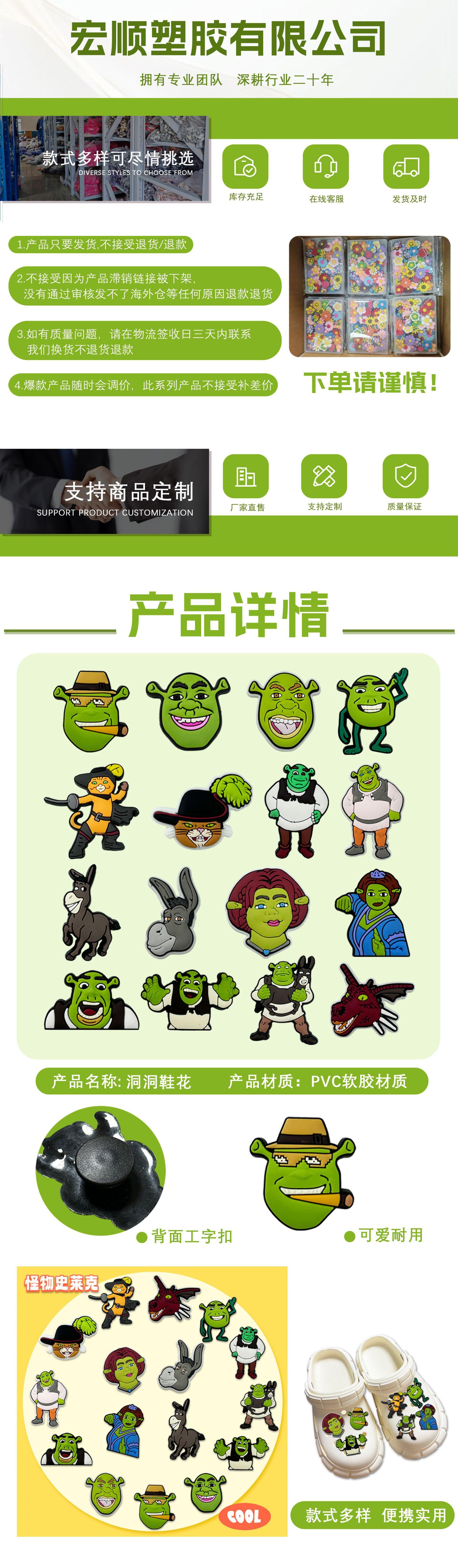 Suministro Directo de Fábrica de Adornos para Zapatos de Shrek Hechos de Material de Goma Suave de PVC, Accesorios para Zapatos con Orificio para Hebilla de Zapato, Accesorios de Joyería DIY