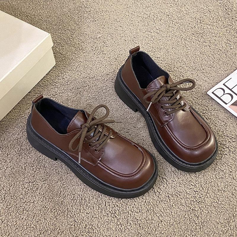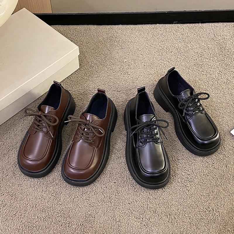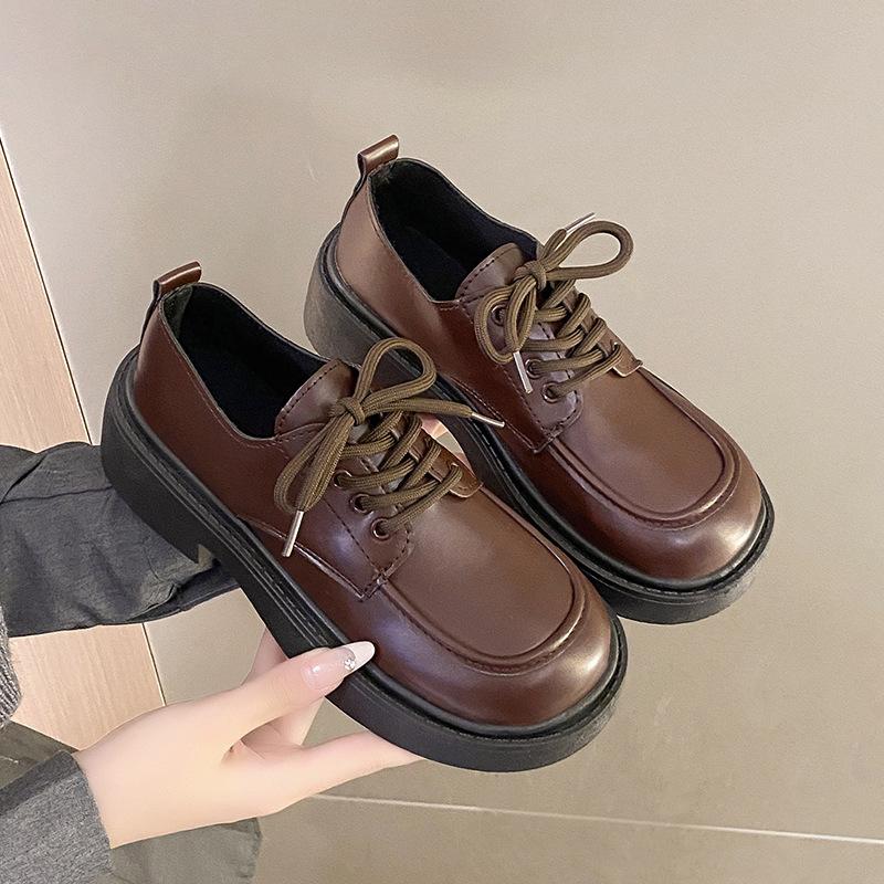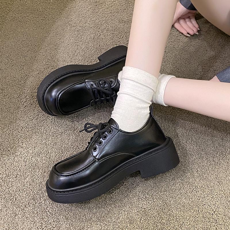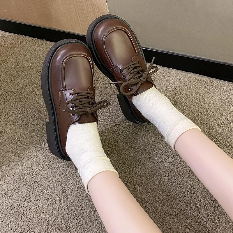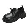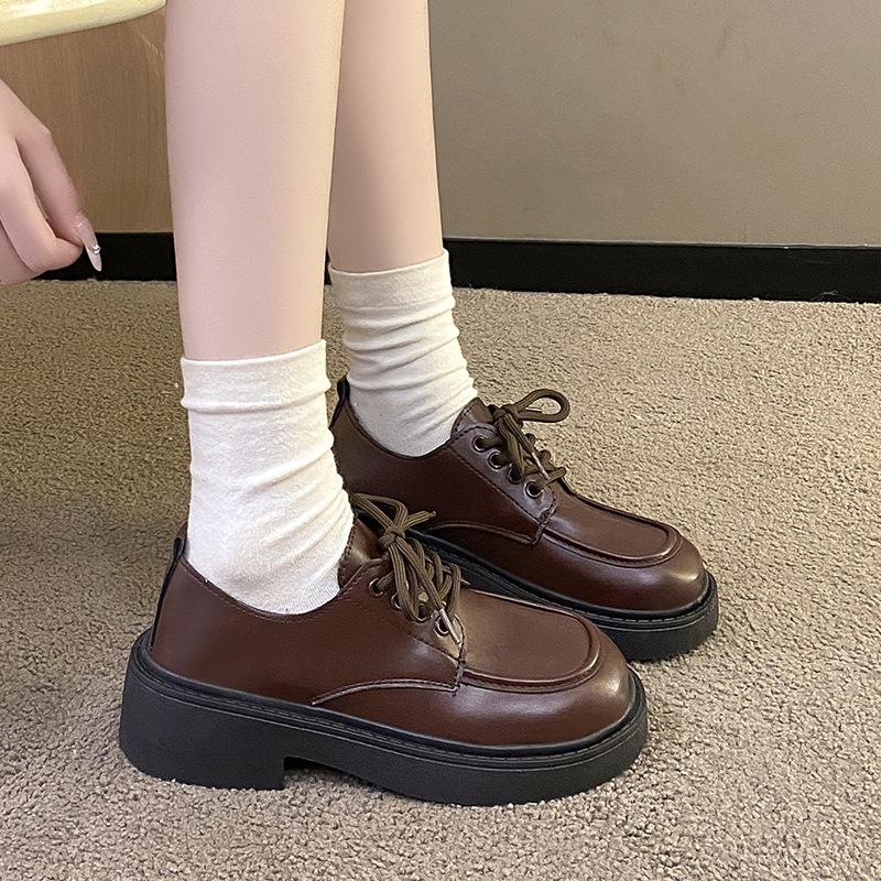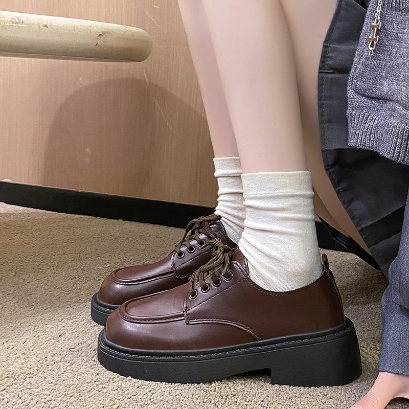 Zapatos de cuero pequeños de estilo británico retro de comercio exterior para mujer, mocasines de tacón grueso con cordones y punta redonda, combinables con todo, para invierno de 2024